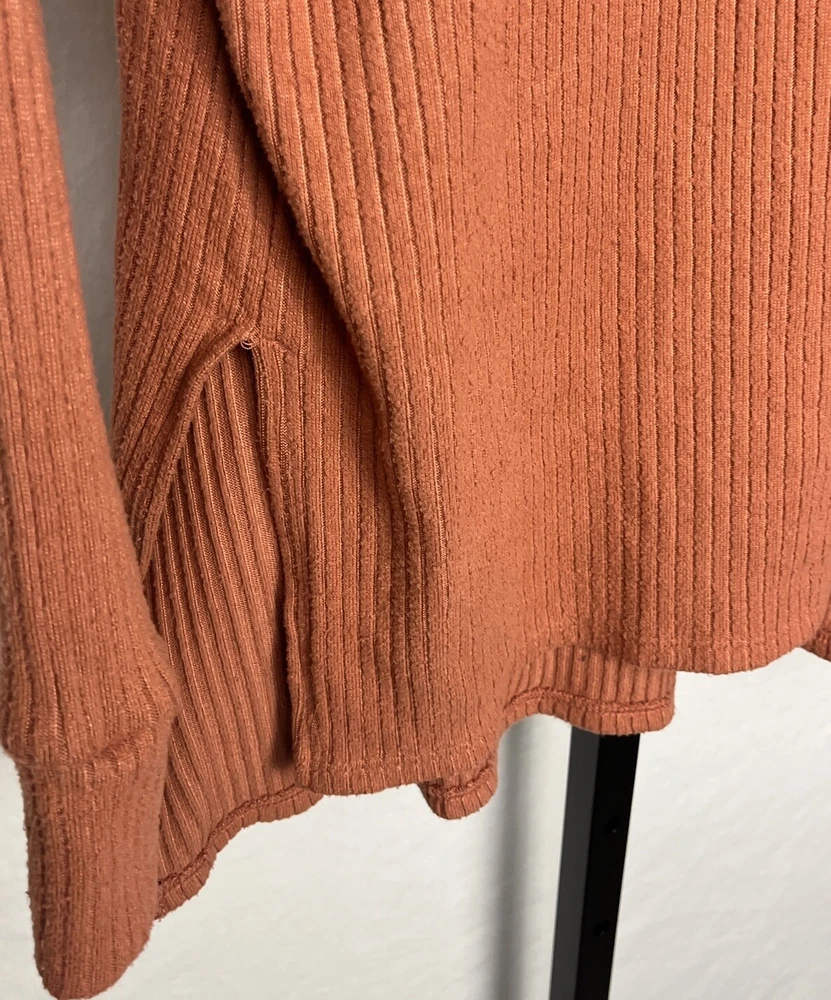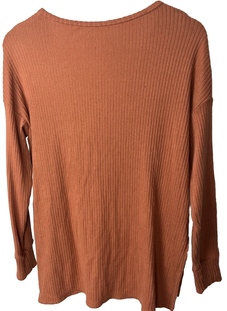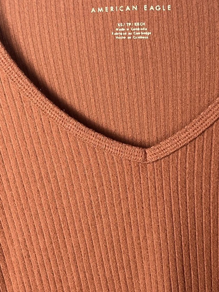 American Eagle Outfitters Top Long Sleeve V-Neck Copper-Brown Ribbed Tee Side Slits Longer Back Women's Size XS Bust 46 Length 28 Slits 7 inches. Polyester elastane. Wash wear/piling