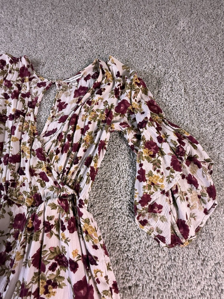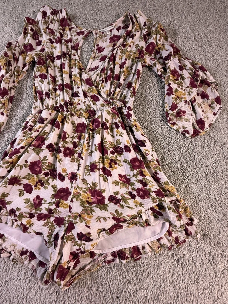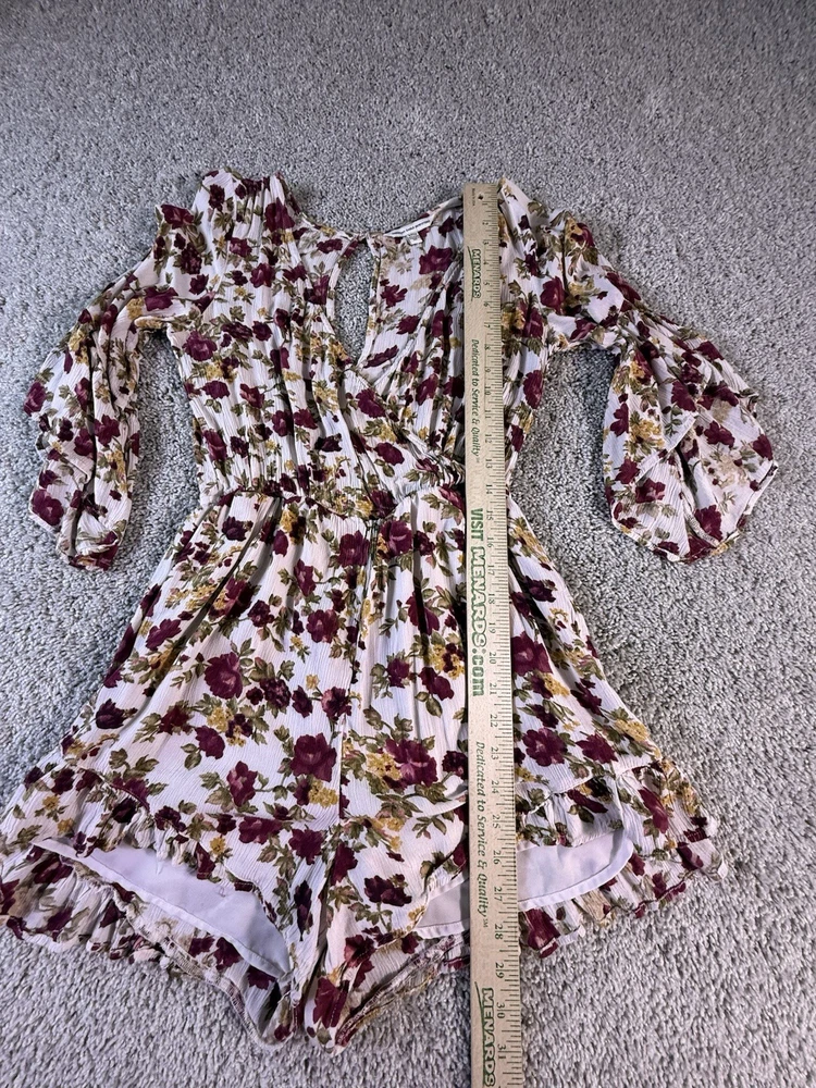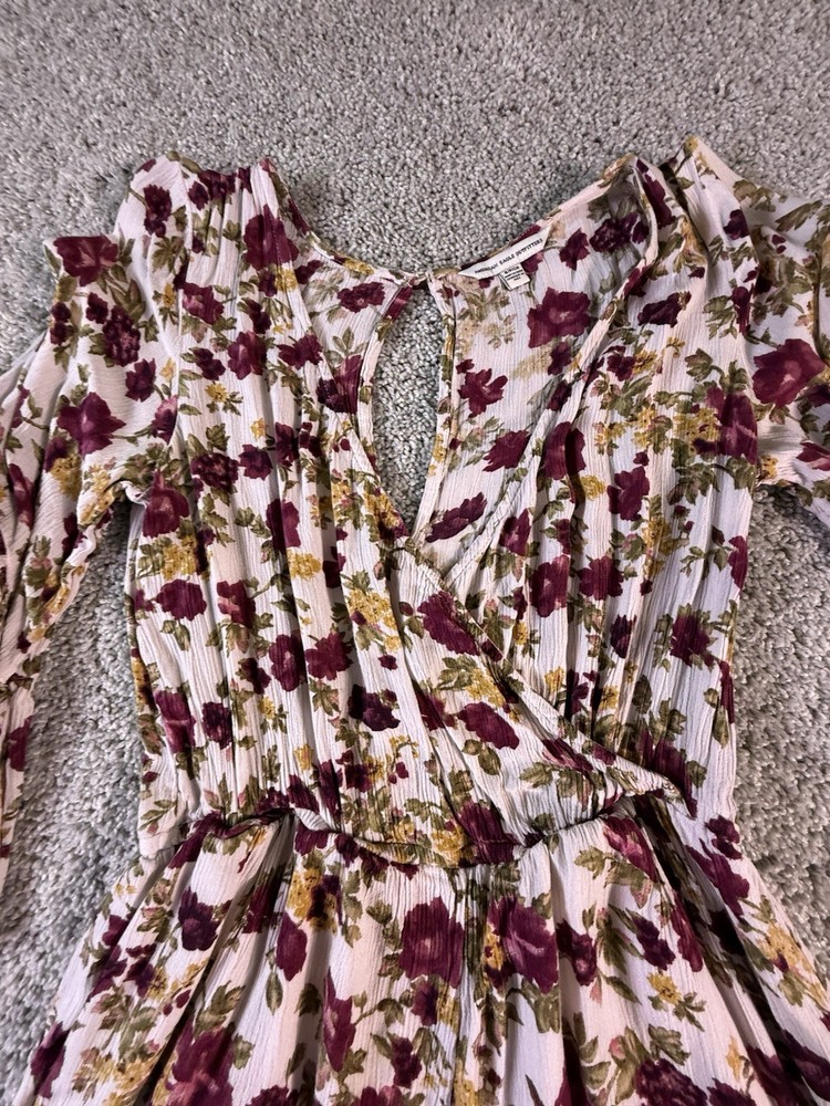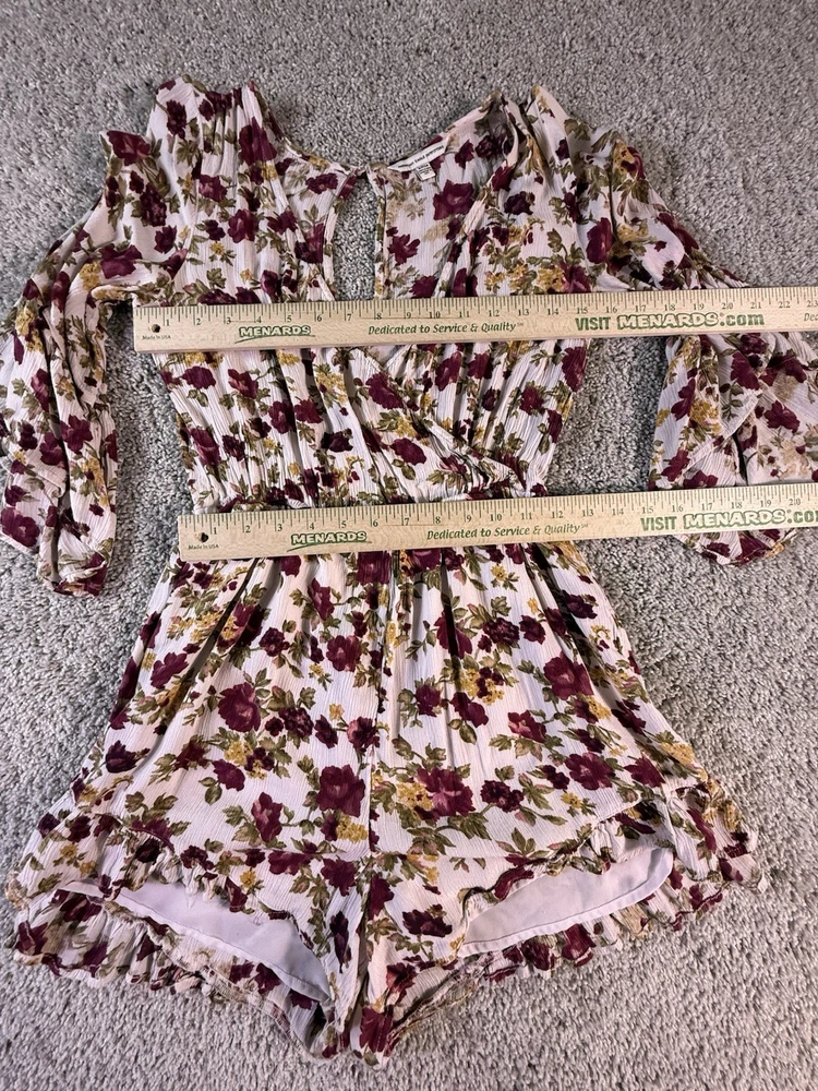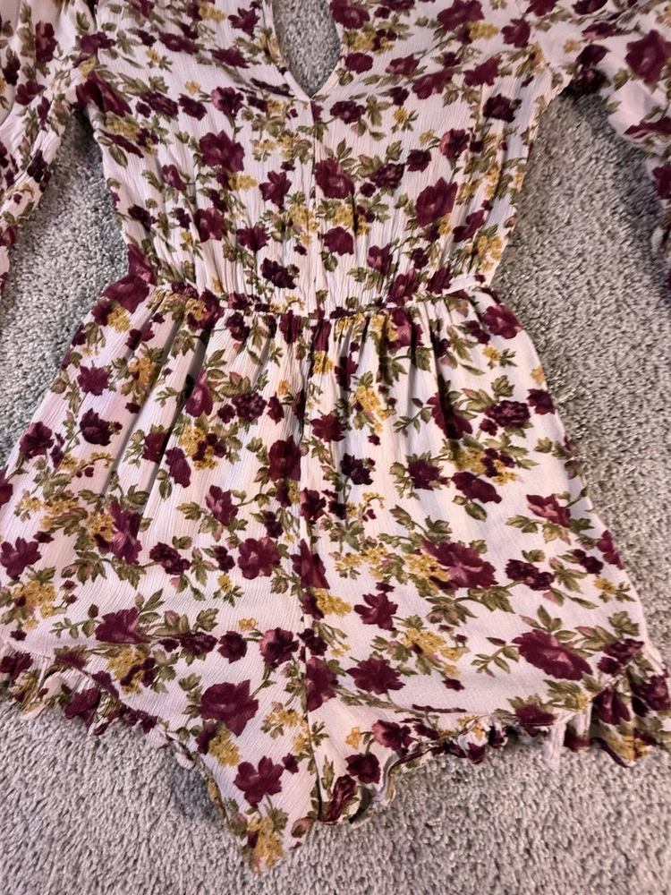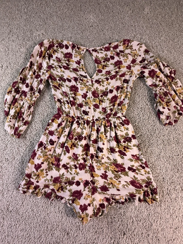 This American Eagle Outfitters woman's romper in size small features a boho floral pattern, long sleeves, and a round neckline. Made of rayon fabric, this one-piece outfit is perfect for travel, parties, or casual occasions. The multicolor design, relaxed fit, and bohemian style make it a trendy and comfortable choice for young women. Machine washable for easy care, this romper is a versatile addition to any wardrobe. 5867