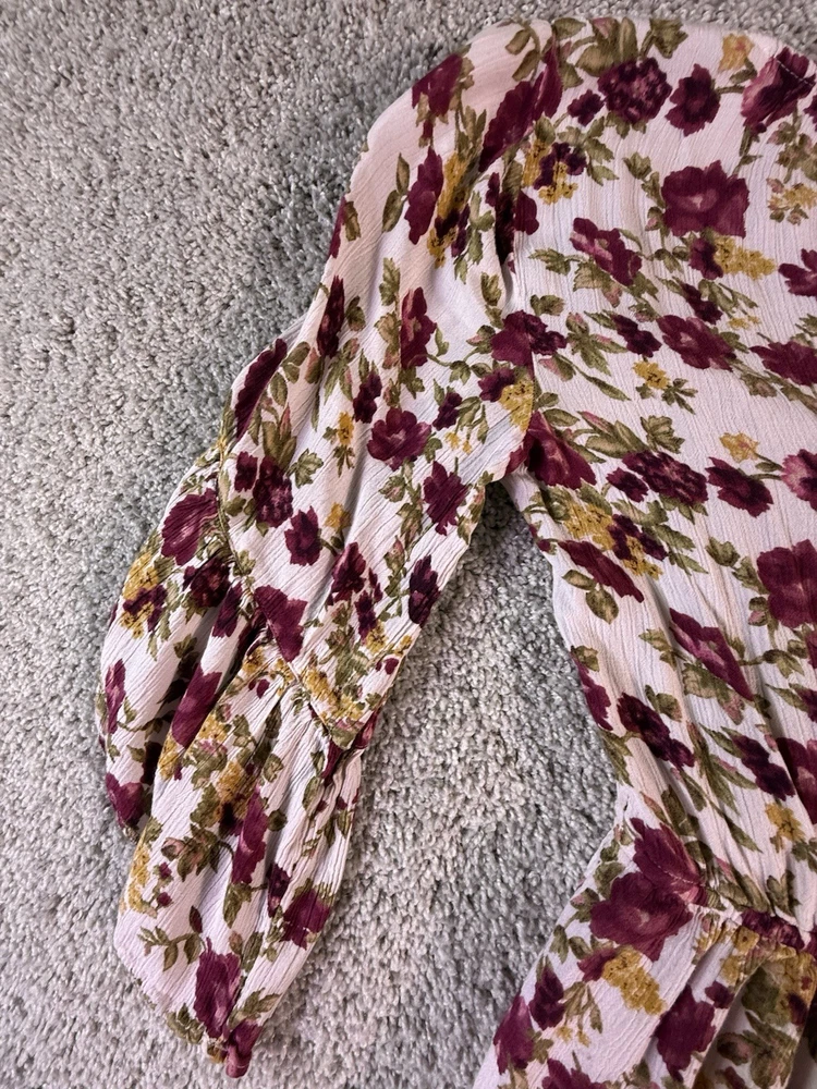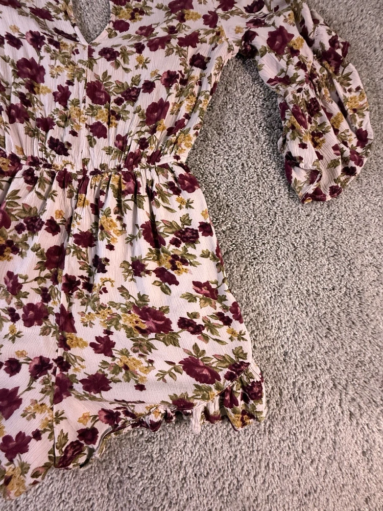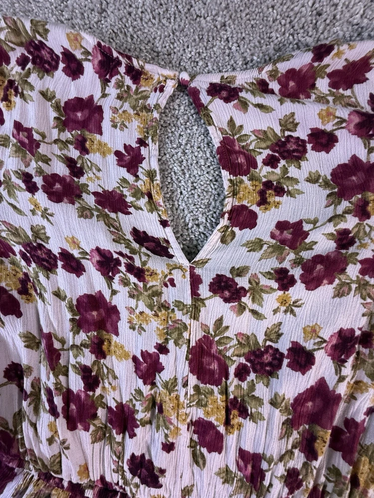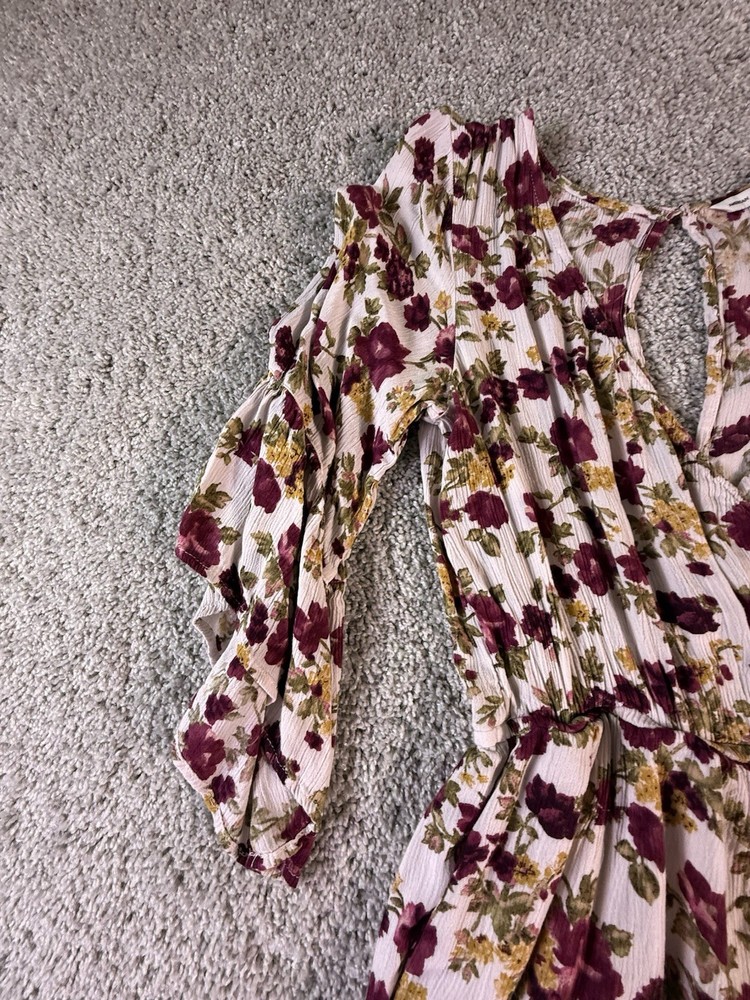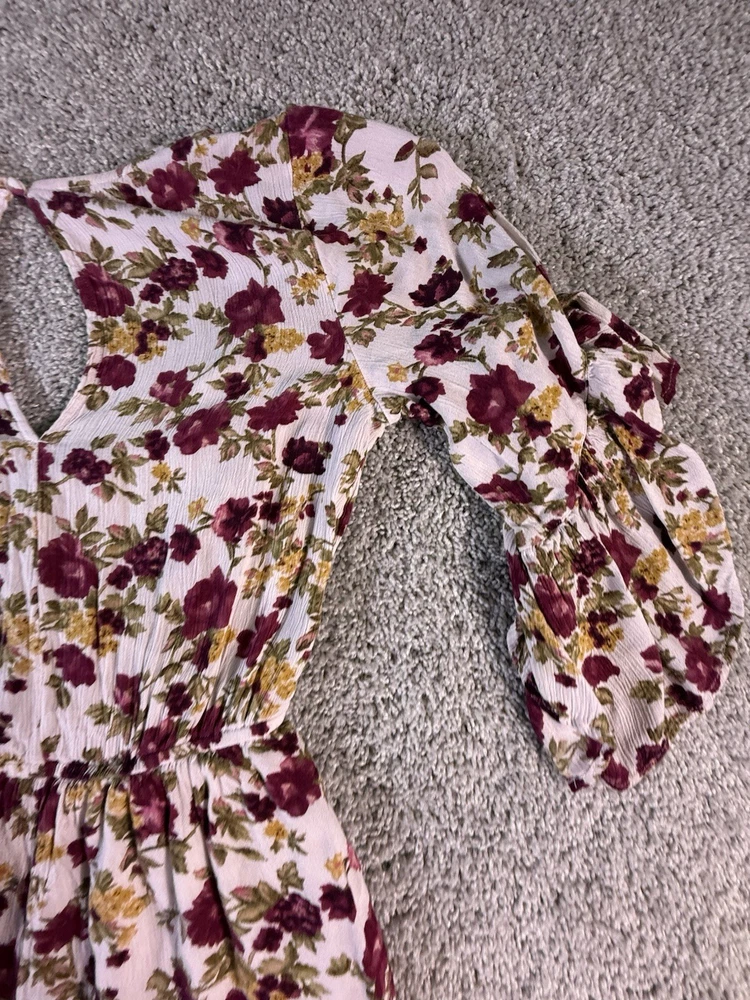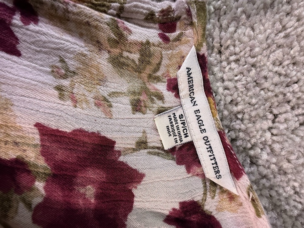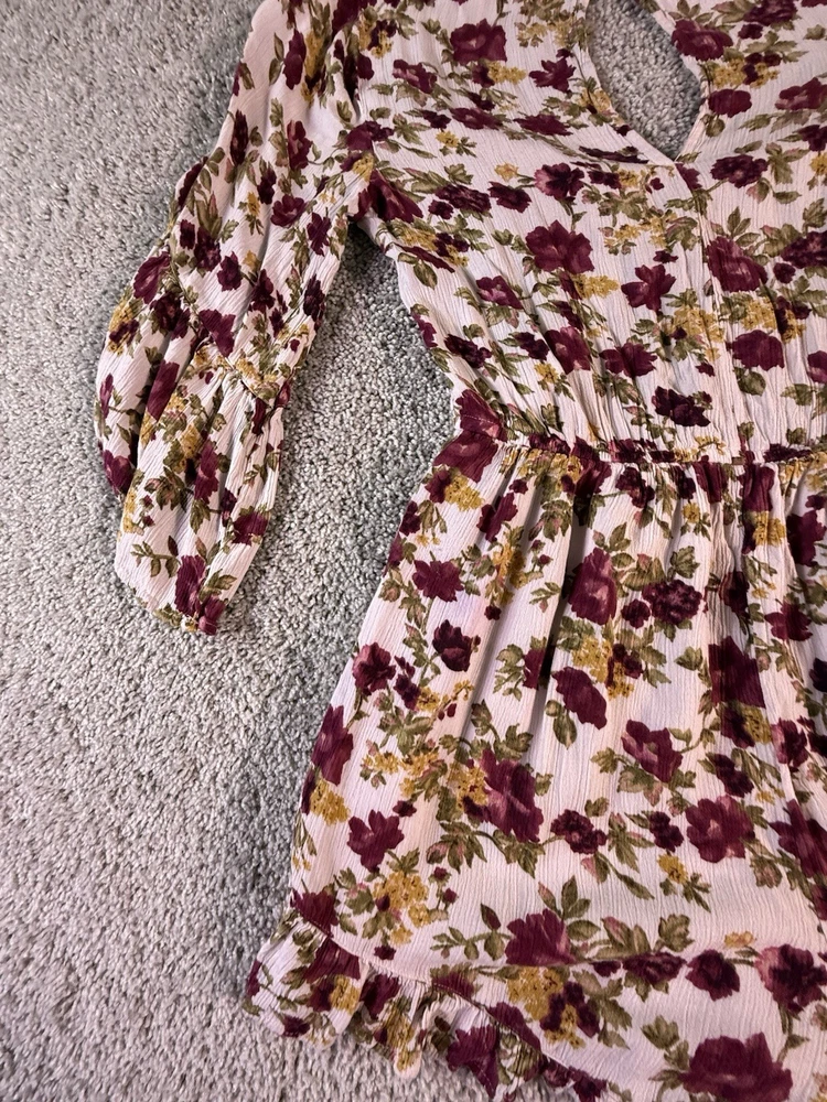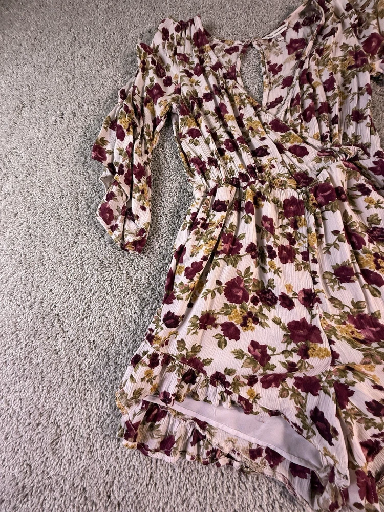 This American Eagle Outfitters woman's romper in size small features a boho floral pattern, long sleeves, and a round neckline. Made of rayon fabric, this one-piece outfit is perfect for travel, parties, or casual occasions. The multicolor design, relaxed fit, and bohemian style make it a trendy and comfortable choice for young women. Machine washable for easy care, this romper is a versatile addition to any wardrobe. 5867