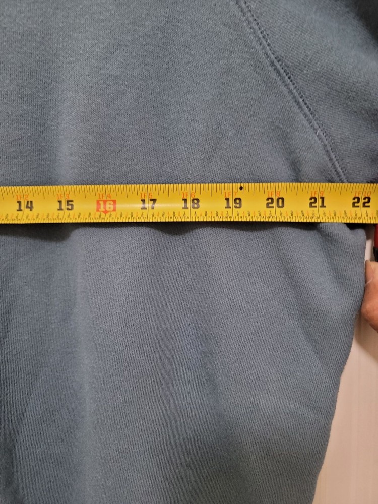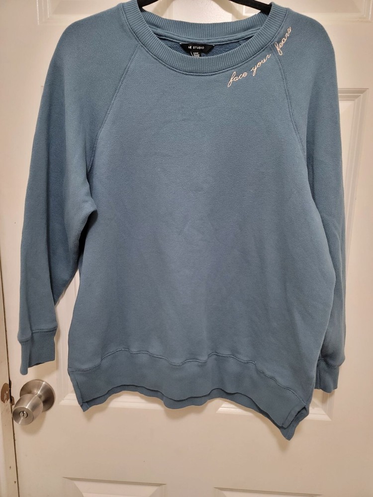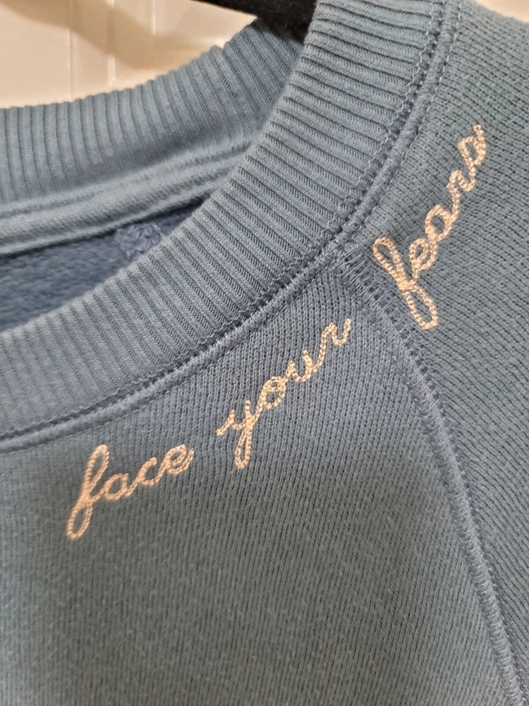 This light blue fleece sweatshirt from Aerie combines comfort with style. Featuring a motivational "Face Your Fears" embroidery, it's perfect for casual wear. • Crewneck with raglan sleeves • Motivational embroidery detail • Comfortable fleece material • Long sleeves with ribbed cuffs Minor pilling may be present. Chest = 22 inches, Sleeve length = 24 inches. CONDITIONS use, minor pilling, good conditions see photos for flaws details and measurements FACE YOUR FEARS