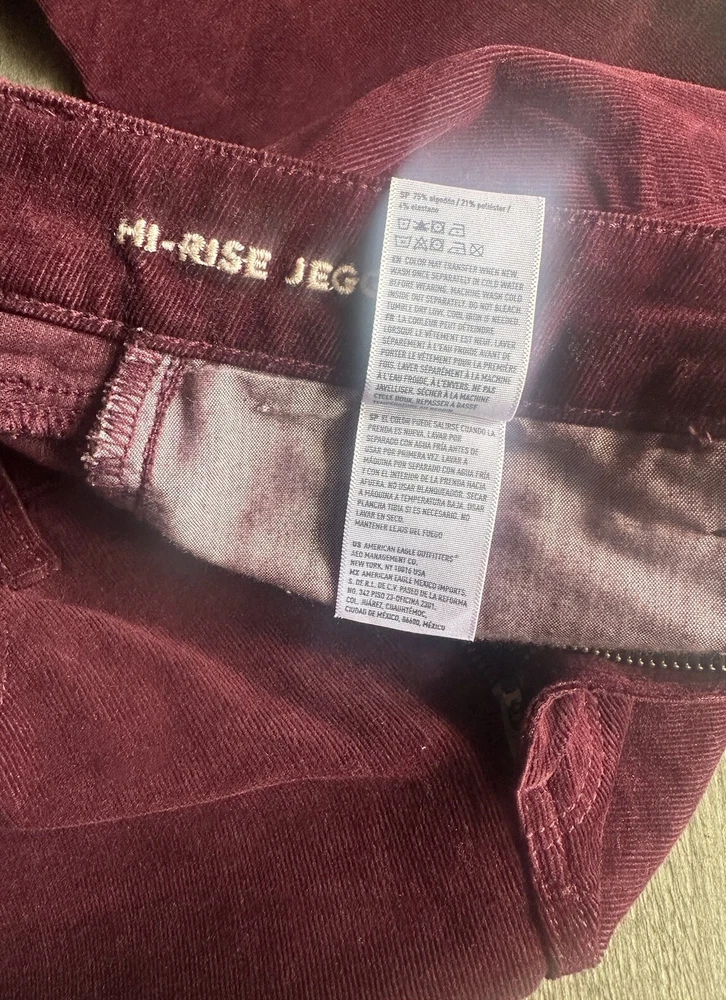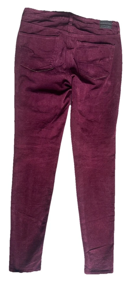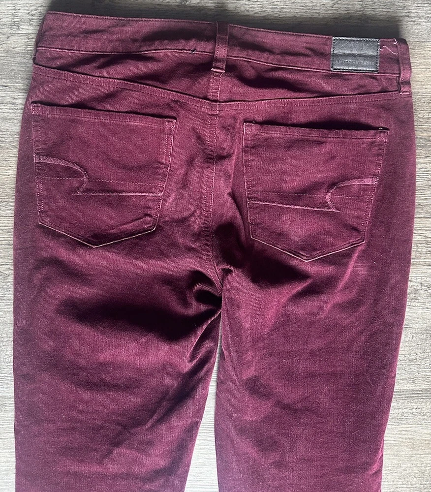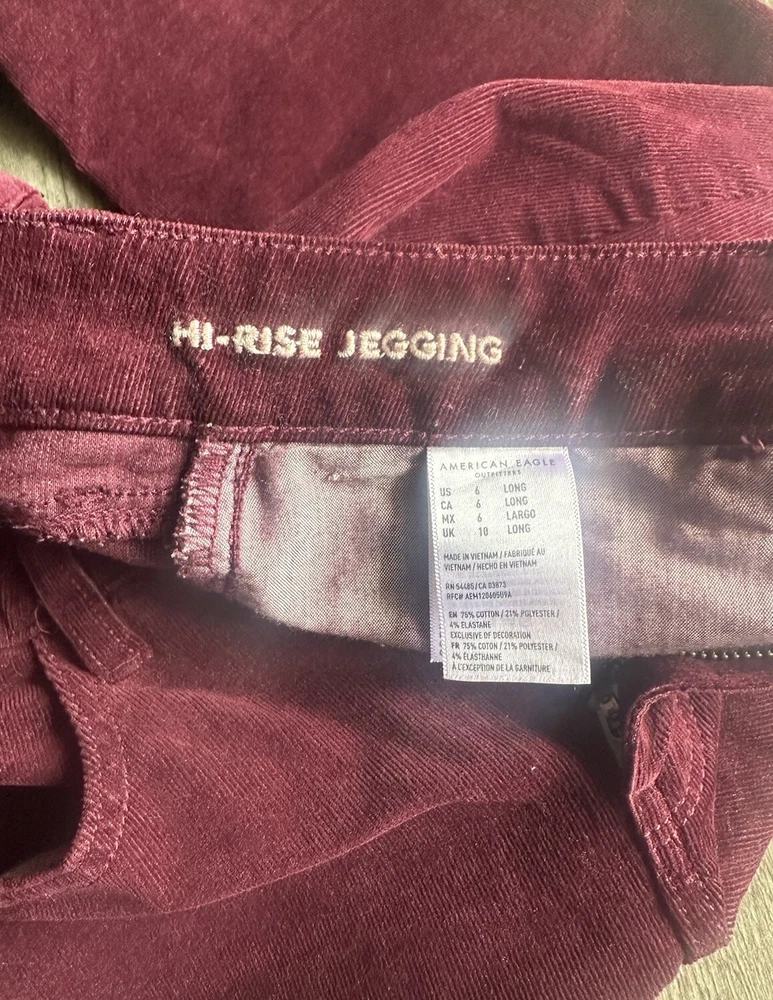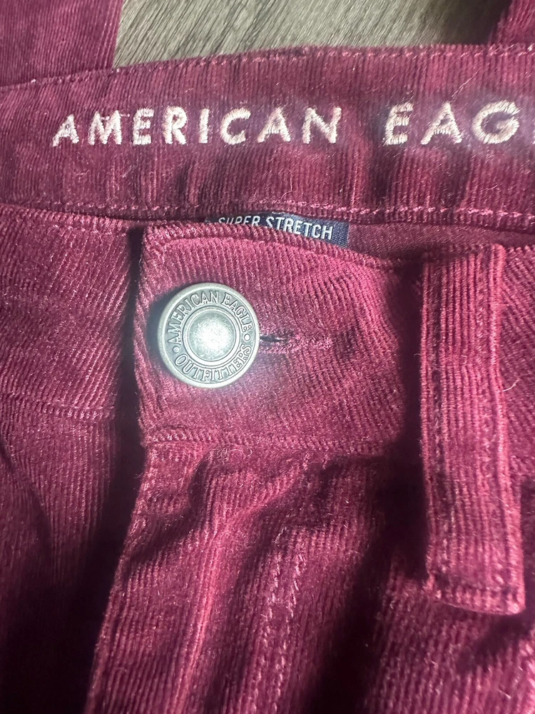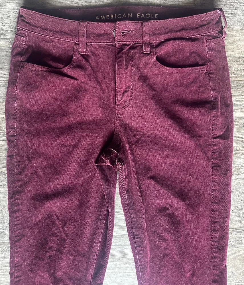 Elevate your denim game with these American Eagle Outfitters burgundy jegging corduroy jeans. Featuring a high-rise waist and a zipper and button closure, these jeans are both stylish and comfortable. The 4-pocket design and solid pattern provide ample space for your belongings, while the light fabric wash adds a touch of sophistication. Crafted from a cotton blend material, these jeans are perfect for all seasons and are available in size 6. The American Eagle jegging model is a classic fit with a 29.5-inch inseam and is ideal for any occasion. Add a touch of 90s nostalgia to your wardrobe with these timeless jeans. It’s pre-owned 👈