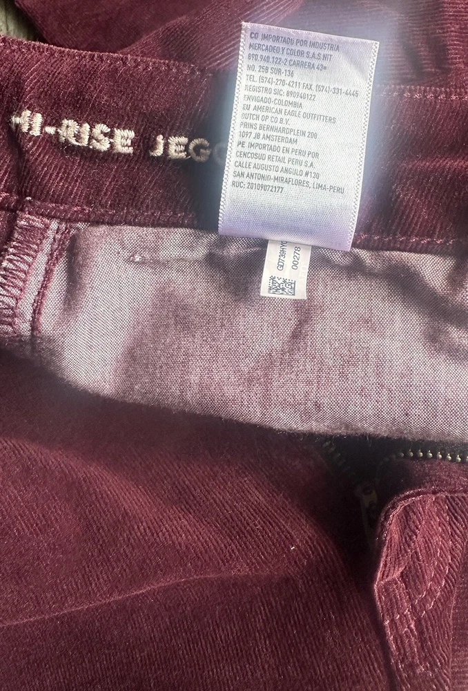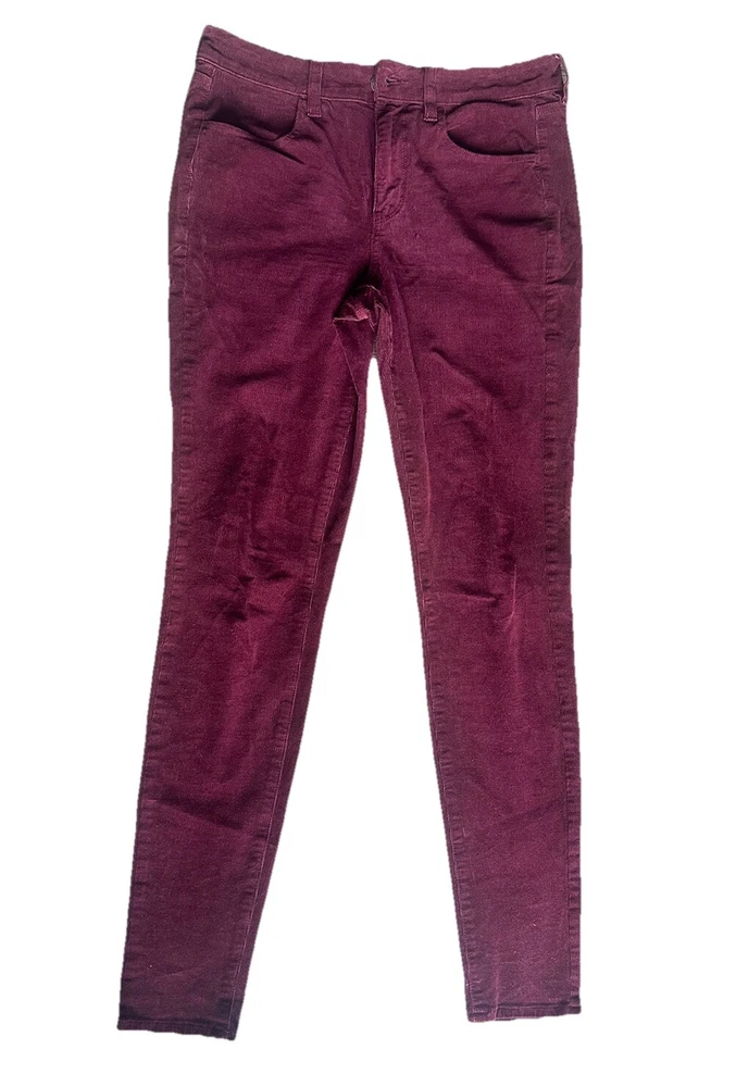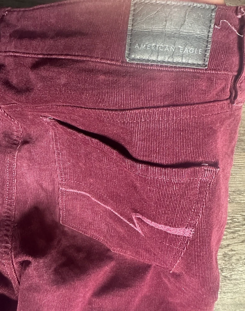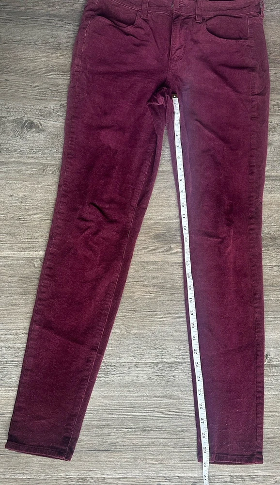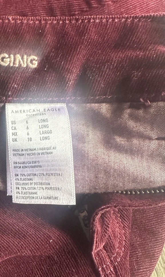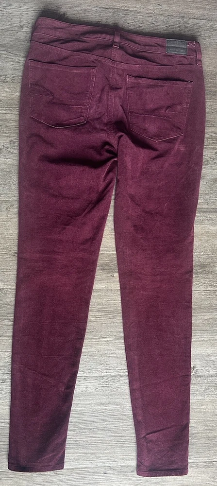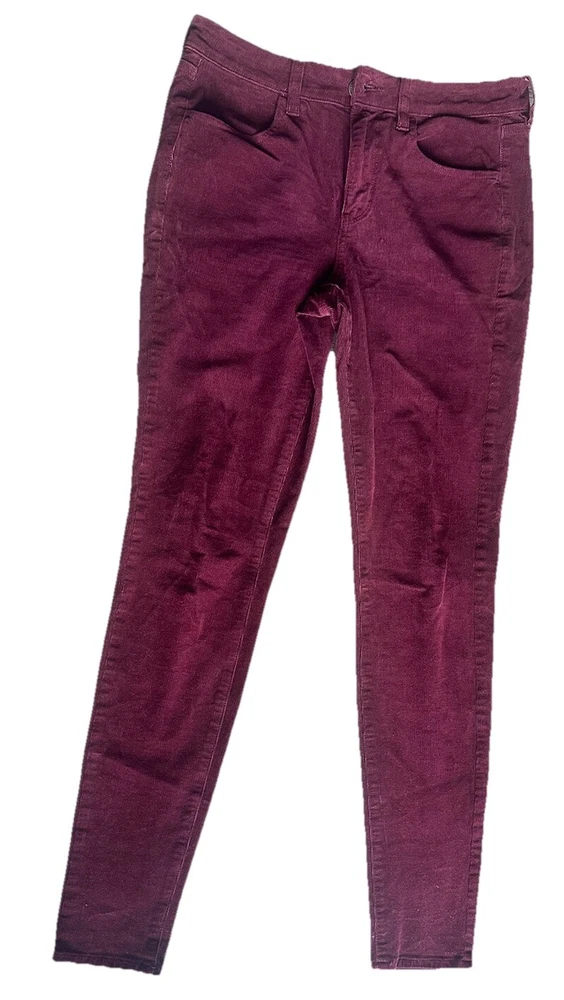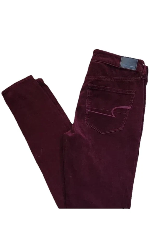 Elevate your denim game with these American Eagle Outfitters burgundy jegging corduroy jeans. Featuring a high-rise waist and a zipper and button closure, these jeans are both stylish and comfortable. The 4-pocket design and solid pattern provide ample space for your belongings, while the light fabric wash adds a touch of sophistication. Crafted from a cotton blend material, these jeans are perfect for all seasons and are available in size 6. The American Eagle jegging model is a classic fit with a 29.5-inch inseam and is ideal for any occasion. Add a touch of 90s nostalgia to your wardrobe with these timeless jeans. It’s pre-owned 👈