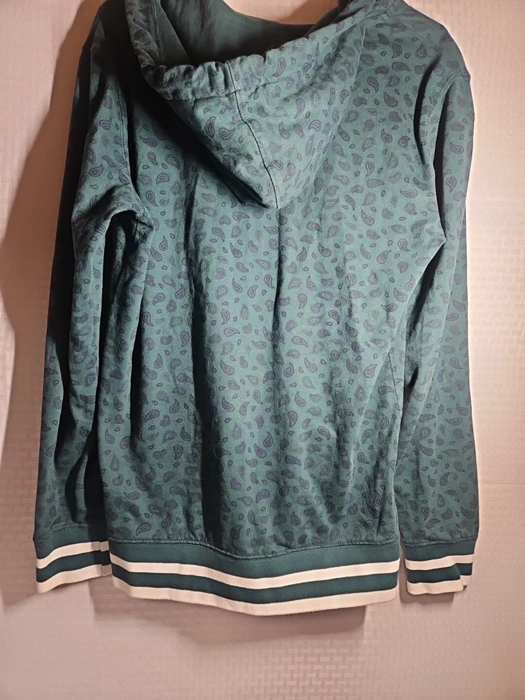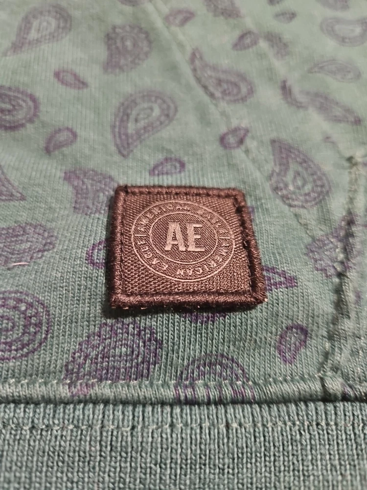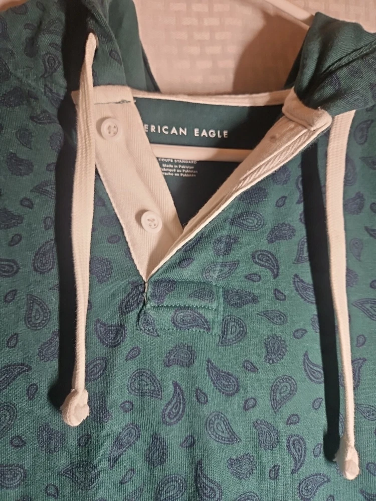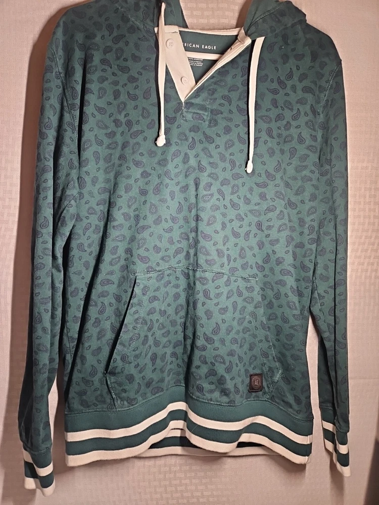 Crafted for comfort and style, this American Eagle women's hoodie in a petite size is a versatile addition to any wardrobe. The vibrant green hue is accented with a playful paisley pattern and white trim, offering a fresh and youthful look. The knit cotton fabric ensures breathability and ease of care, being machine washable for your convenience. The hoodie features a cozy hood, convenient pockets, and an elastic waist, making it ideal for a variety of activities from running errands to hitting the beach. Long sleeves and a regular fit provide a relaxed yet flattering silhouette, perfect for layering or wearing on its own during any season. Whether you're out for a walk or enjoying a casual day in the city, this pullover style hoodie is designed to keep you comfortable and on-trend. The hoodie is in great shape. You can see from the inside tags that it has never or hardly been worn. From a smoke and pet free home.