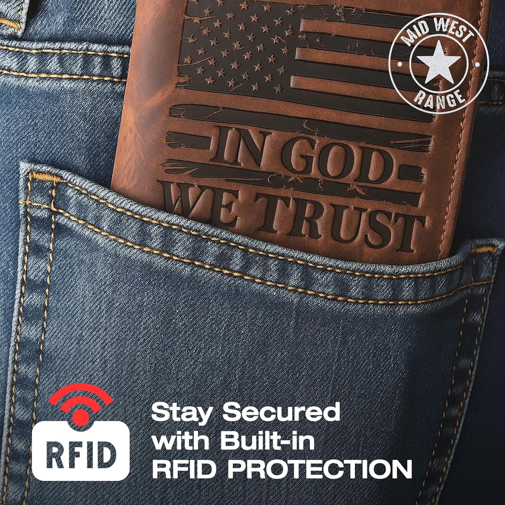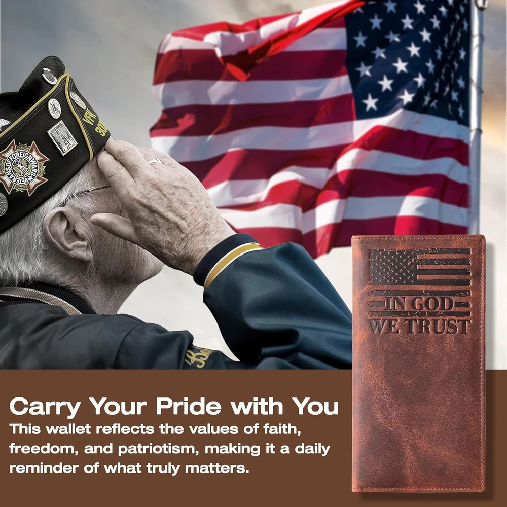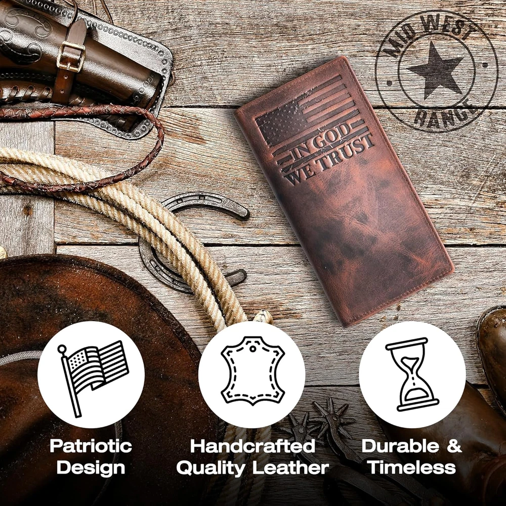 Store New Arrivals Add to Favorite View Feedback Contact Fast deliveries to the customer's home Quality customer service John Make the customers happy! American Flag Long Wallet for Men - Western Wallets for Men with ‘IN GOD WE TRUST’ – Distressed Full Grain Leather – RFID Blocking Long Bifold Cowboy Wallet – Patriotic Christmas Gift (7 Inches) Description SHOW YOUR PATRIOTIC PRIDE – Carry a symbol of faith, freedom, and American heritage with this Leather wallet for men. Embossed with the U.S. flag and “IN GOD WE TRUST,” this piece reflects craftsmanship and conviction. Ideal for those who appreciate patriotic wallets, cowboy wallets, or western wallets for men. A thoughtful men’s wallet Holiday gift that honors both tradition and personal values—great for dad, husband, or anyone proud of their roots. CLASSIC WESTERN DESIGN – This long bifold men’s wallet delivers rugged appeal and authentic western style in a tall, slim silhouette. Built for men who value function and tradition, it fits comfortably in pockets or bags and complements jeans or dress wear alike. Use it as a trucker wallet, cowboy wallet, or rodeo wallets for men, that brings the spirit of the American West into everyday life. SPACIOUS YET SLIM STORAGE – Designed for organization without bulk, this leather wallets for men offers 9 card slots, a photo ID window, and large compartments for bills, checks, and receipts. It’s the ideal slim wallet for men—balancing function and style for modern living. Whether used as a bifold wallet or western wallet, it keeps your essentials secure and accessible while maintaining a sleek, pocket-friendly profile. GENUINE FULL GRAIN LEATHER – Crafted from real distressed leather, each men’s leather wallet is one-of-a-kind in tone and texture. Built to endure years of use, it develops rich character and softness over time, aging beautifully like a true cowboy wallet. This brown leather wallet stands for durability, craftsmanship, and masculine charm—making it a unique Holiday gift for him or a lifelong keepsake. RFID BLOCKING SECURITY – Stay protected from digital theft with built-in RFID blocking technology that helps shield your cards and personal data. Whether for travel, daily use, or gifting, this western wallet for men blends timeless craftsmanship with modern safety. A great leather wallet Christmas gift under $50 for dad, husband, or boyfriend—designed for men who value authenticity, durability, and American pride. TRIBUTE TO SERVICE: Built from premium craftsmanship, this full-grain leather wallet honors the strength and commitment of our veterans from the Marines, Army, Air Force, and Navy. Designed for everyday carry, it reflects years of dedication and discipline with rugged durability and timeless style. Thoughtfully crafted, it stands as a lasting tribute among gifts for heroes—a symbol of service, integrity, and pride that never fades. Product description FEEL THE FREEDOM At Mid West Range, we love the openness and freedom of the American Midwest. Whether you're into fishing, hunting, rodeo, farming or camping, we aim to bring you products that are authentic and real. Crafted in specialty leather houses our designs showcase what we love about the great outdoors. Full Grain Premium Leather Built to last from the finest full grain leather, this long wallet for men only gets better with age. From sunup on the farm to sundown on the trail, it’s durable enough to handle it all. Whether you call it a check book wallet mens, tall wallet, or trucker wallet, this rugged essential stands up to your daily grind while gaining a rich patina that's uniquely yours. RFID Blocking Stay one step ahead of modern threats with advanced RFID blocking technology. Protect your hard-earned money and personal information from digital thieves without sacrificing style or functionality. Uniquely Yours Each leather wallets for men long bifold is hand-finished, making every one truly unique. Like a well-worn saddle, your men long wallet will develop its own character and story over time—reflecting the life you lead and the legacy you build. No two real leather wallets for men are the same. THE ULTIMATE MIDWESTERN GIFT Want the perfect gift for a man who loves the land, lives free, and works hard? The Tall Wallet is a symbol of what it means to be from the Midwest—faithful, tough, and always ready for the next adventure. Our range is designed to speak out loud about; Freedom. Family. Faith. The Midwest. Item model number 'MID-WEST-RANGE-VERTICAL-WALLET-001 Style The Patriot American Flag Rodeo Wallet Color Vintage Brown Pattern American Flag Product Dimensions 4 x 7 x 1 inches Material Leather Item Weight 1.65 Ounces Department Mens ABOUT US We offer the best prices around on high quality products. Our E-store includes media such as books, movies, music and games while offering electronics, toys, sporting apparel, clothing, tools, general home, garden items and more. SHIPPING We are always working hard to ensure your package arrives as soon as possible. Please understand that some factors like weather, high postal traffic, and the performance of shipping companies are outside of our control. We offer free shipping to the lower 48 states and ship within 2 business days of payment, usually sooner. We do not accept P.O. Boxes. Please provide a physical address. For shipping outside of the continental USA, we only use eBay's Global Shipping Program. The item is shipped to KY and then sent to the rest of the world. International customers are responsible for all duties and taxes. Continue to 'check out' to calculate costs for shipping the item to your country. Messages regarding eBay's Global Shipping Program MUST be directed at eBay EXCLUSIVELY. RETURNS We offer a 30-Day Return Policy on items in which you are not completely satisfied with. You have the option of a full-refund or an exchange of the item. No returns are available on items shipped outside of the USA P