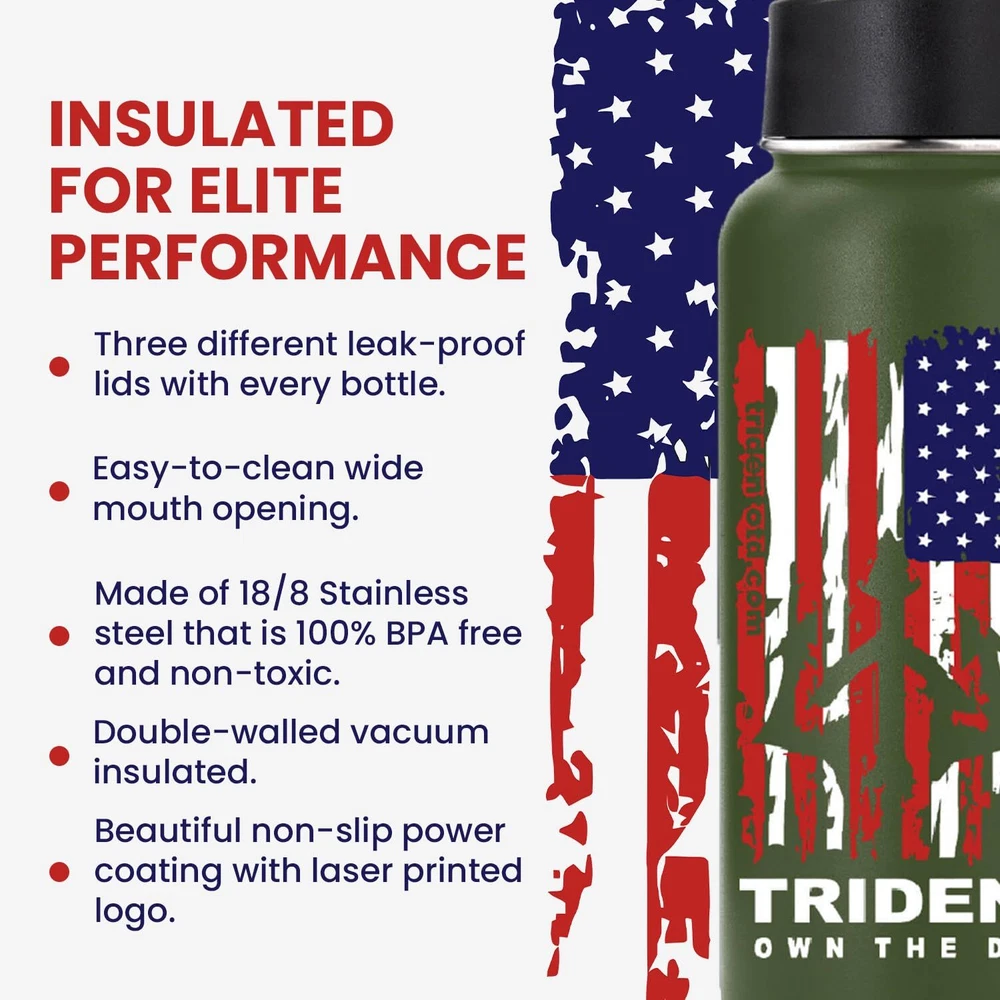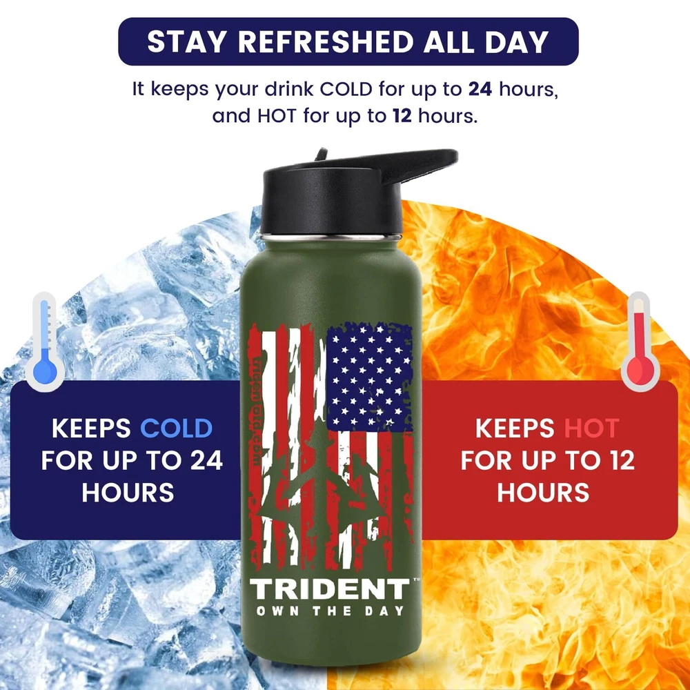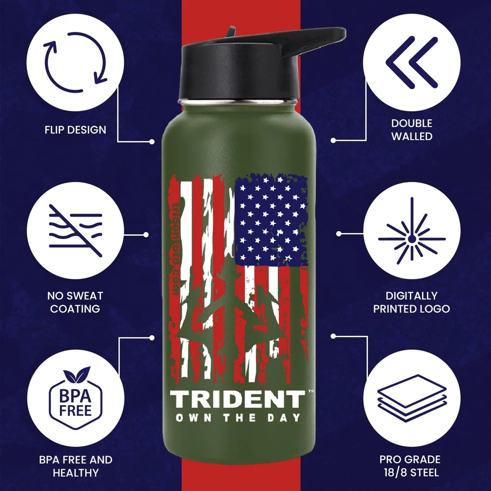 ELITE PERFORMANCE - COLD FOR 24h & HOT FOR 12h: Designed for top-tier hydration, this water bottle 32oz with straw utilizes double-walled construction to achieve elite performance. It effectively maintains the temperature of beverages, keeping them ice cold for up to 24 hours or hot for up to 12 hours. Whether you're dealing with sweltering heat or chilly weather, your drink will stay at the perfect temperature. 3 DIFFERENT LIDS PROVIDED, FOR ALL YOUR NEEDS: with our american flag stainless steel water bottles, we offer 3 different caps: a STRAW LID for easy sipping, a leak-proof METAL CAP for optimal heat retention, and a FLIP-CAP for quick, one-handed closure during activities. Each cap is designed to enhance your experience, whether you're working out, running, exploring the outdoors, or commuting. Choose the one that best suits your needs. THERMO LOCK TECHNOLOGY: our 32 oz water bottles are engineered with Thermo Lock Technology, which provides exceptional durability. The advanced construction of our insulated water bottle safeguards against dents and drops, ensuring the water bottle maintains its integrity and performance over time, even with frequent use and in rugged conditions. HEALTY AND ENVIRONMENTALLY FRIENDLY: our insulated water bottle 32 oz are Made from BPA-free, laser-engraved Pro Grade 18/8 stainless steel. This insulated water bottle is both healthy and eco-friendly. It provides a safe drinking experience, free from harmful chemicals. The no-sweat coating keeps the exterior dry and comfortable to hold, while its reusable nature supports sustainable living by reducing reliance on single-use plastic bottles. RETIRED NAVY COMBAT WOUNDED: proudly offering a superior stainless steel water bottle featuring the iconic American flag and Trident logo, symbolizing strength, honor, and service.