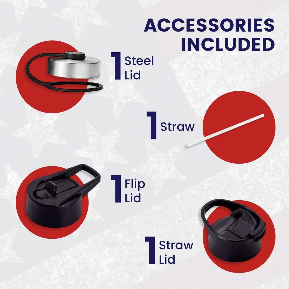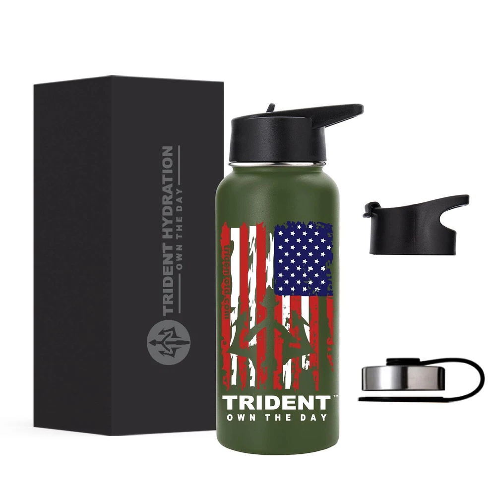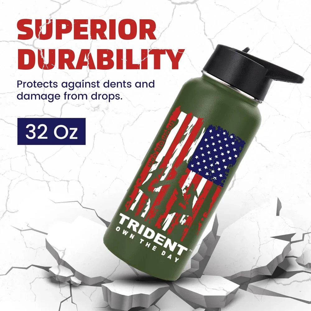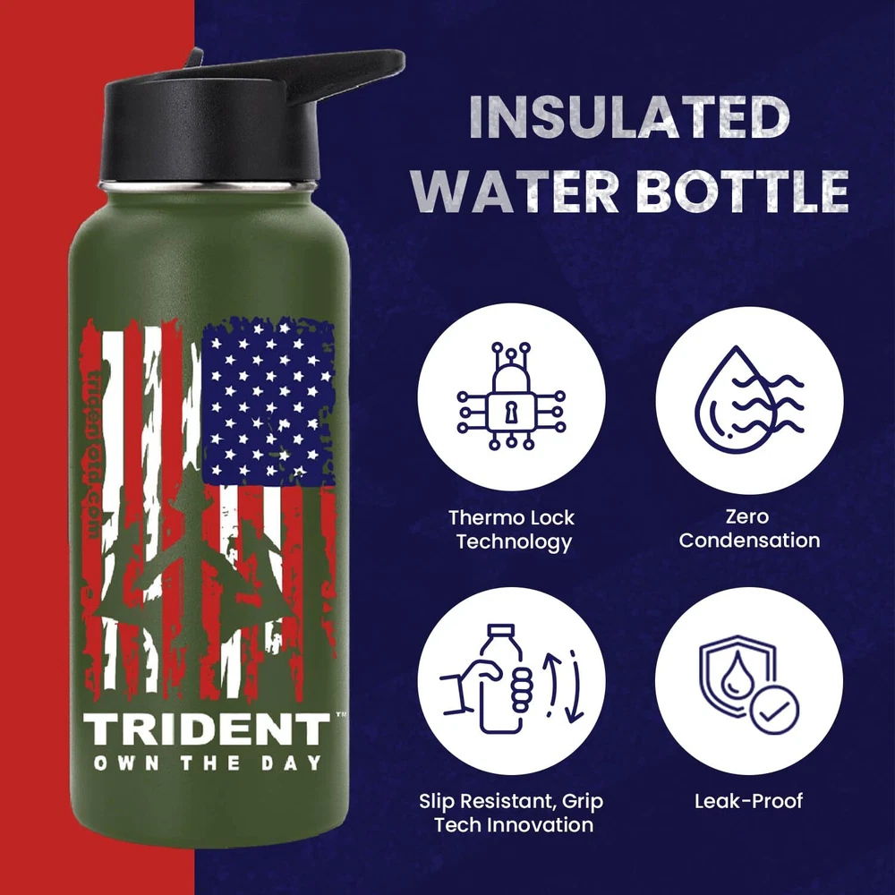 ELITE PERFORMANCE - COLD FOR 24h & HOT FOR 12h: Designed for top-tier hydration, this water bottle 32oz with straw utilizes double-walled construction to achieve elite performance. It effectively maintains the temperature of beverages, keeping them ice cold for up to 24 hours or hot for up to 12 hours. Whether you're dealing with sweltering heat or chilly weather, your drink will stay at the perfect temperature. 3 DIFFERENT LIDS PROVIDED, FOR ALL YOUR NEEDS: with our american flag stainless steel water bottles, we offer 3 different caps: a STRAW LID for easy sipping, a leak-proof METAL CAP for optimal heat retention, and a FLIP-CAP for quick, one-handed closure during activities. Each cap is designed to enhance your experience, whether you're working out, running, exploring the outdoors, or commuting. Choose the one that best suits your needs. THERMO LOCK TECHNOLOGY: our 32 oz water bottles are engineered with Thermo Lock Technology, which provides exceptional durability. The advanced construction of our insulated water bottle safeguards against dents and drops, ensuring the water bottle maintains its integrity and performance over time, even with frequent use and in rugged conditions. HEALTY AND ENVIRONMENTALLY FRIENDLY: our insulated water bottle 32 oz are Made from BPA-free, laser-engraved Pro Grade 18/8 stainless steel. This insulated water bottle is both healthy and eco-friendly. It provides a safe drinking experience, free from harmful chemicals. The no-sweat coating keeps the exterior dry and comfortable to hold, while its reusable nature supports sustainable living by reducing reliance on single-use plastic bottles. RETIRED NAVY COMBAT WOUNDED: proudly offering a superior stainless steel water bottle featuring the iconic American flag and Trident logo, symbolizing strength, honor, and service.