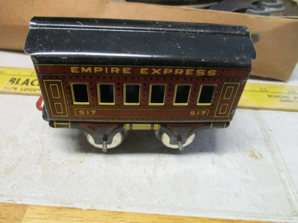 This is a antique american flyer empire express wind up cast iron toy train set american toys. This does wind and work but the box is a little rough.