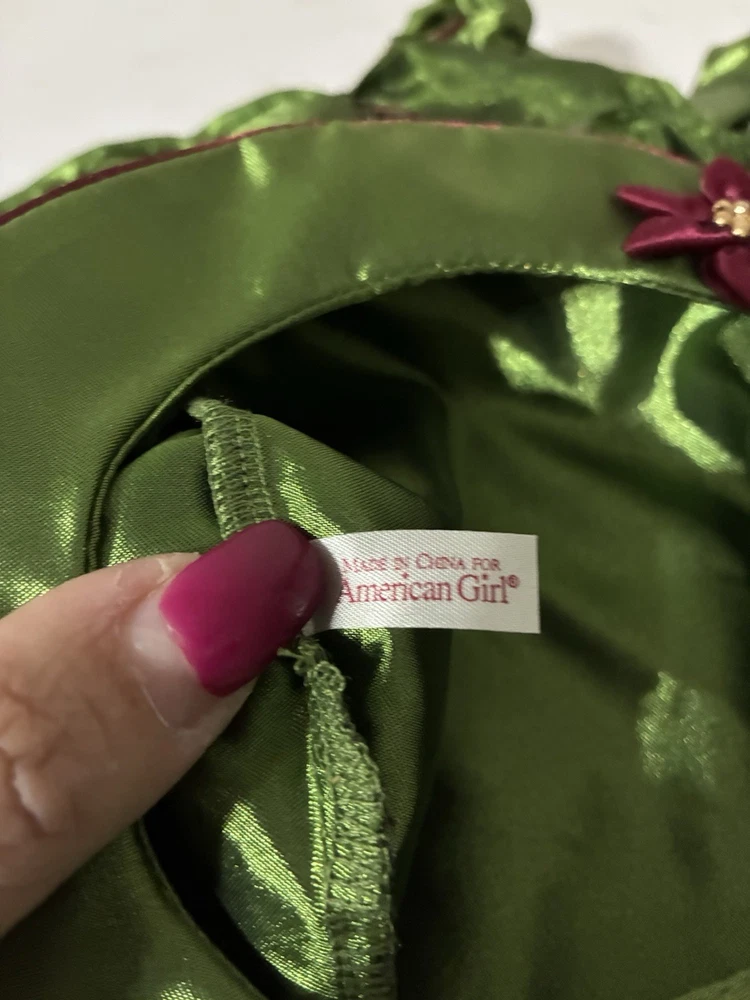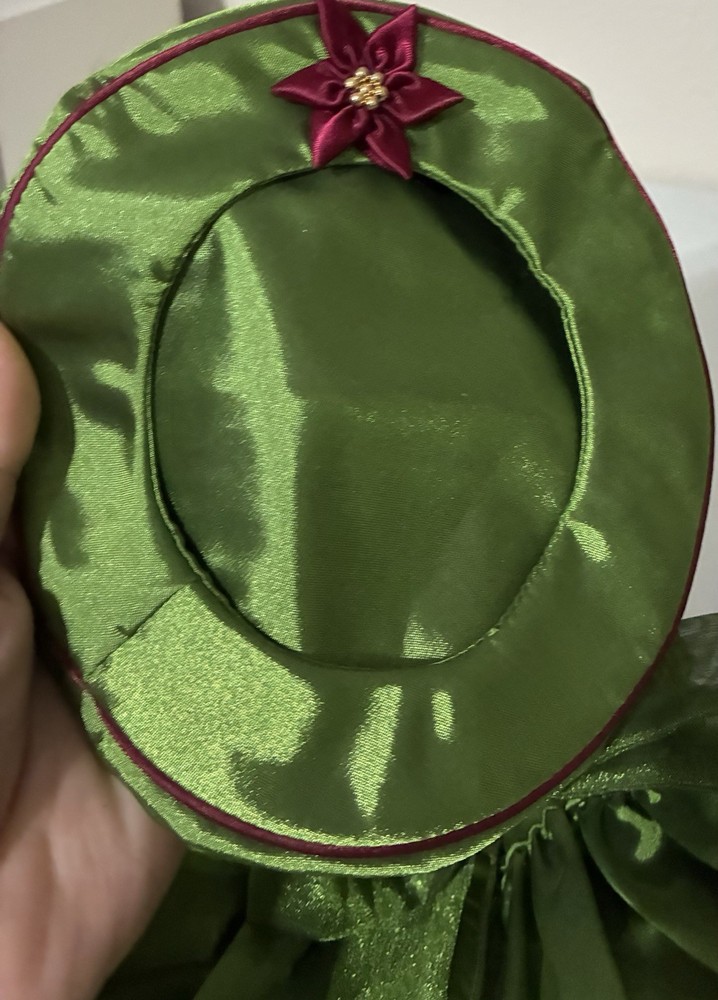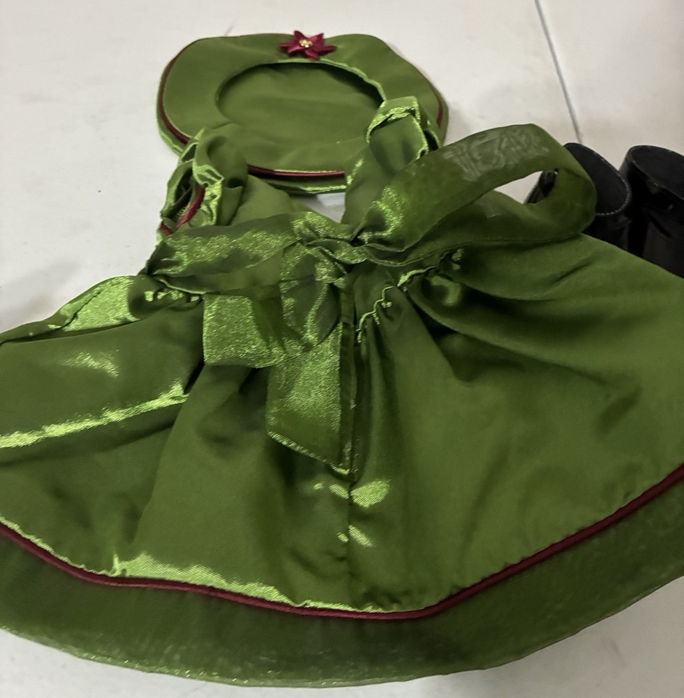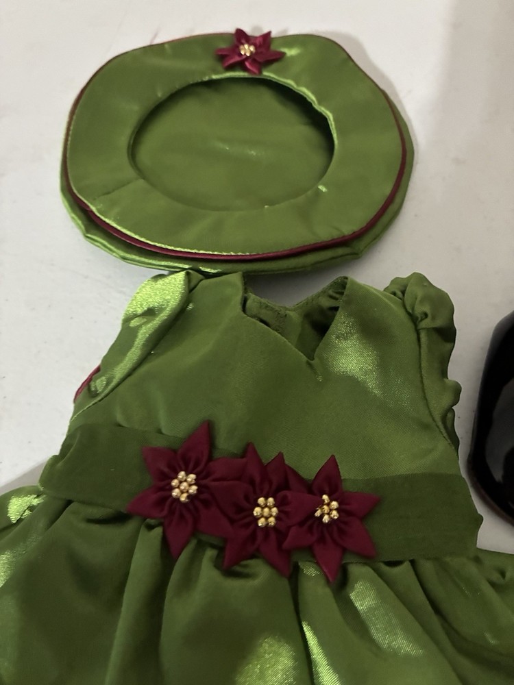 The American Girl Bitty Baby Holiday Dress set is a vintage collection from the year 2000 under the Pleasant Company franchise. This adorable outfit includes a green satin dress with a poinsettia design, patent shoes, a matching hat, and a bell. Perfect for Christmas, this set is ideal for baby doll owners who want to dress up their little one in a festive holiday style. The brand, American Girl, ensures high-quality and timeless doll clothes and accessories, making this set a must-have for any Bitty Baby enthusiast.