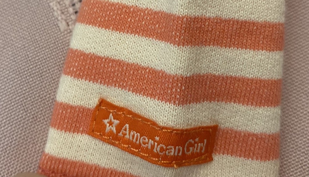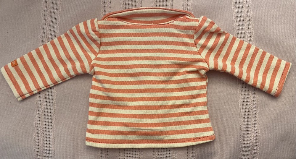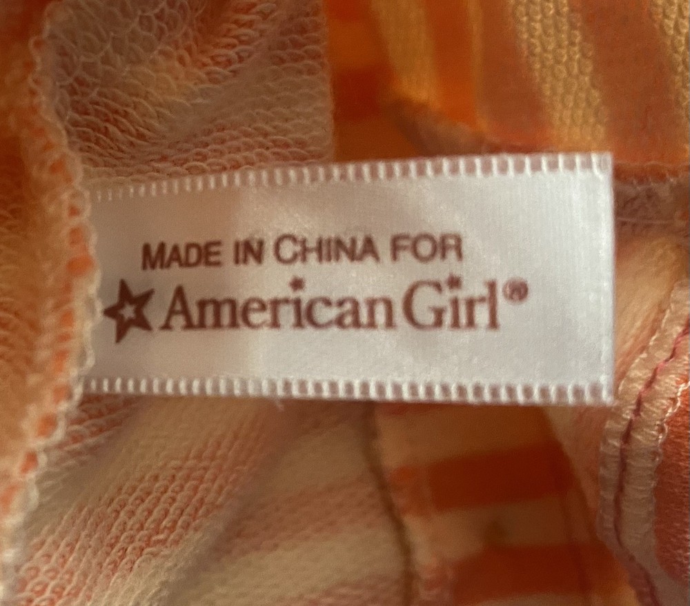 American Girl Bright Stripes Outfit Jacket Only 2014. This jacket is perfect for your 18-inch doll. The jacket is made of cloth and has a bright orange and white pattern with yellow buttons. It is a great addition to any doll's wardrobe and is perfect for playtime. The jacket is part of the Truly Me product line and was manufactured in China. PLEASE SEE LAST PHOTO, as there is a small dark smudge on the back side of the right sleeve.