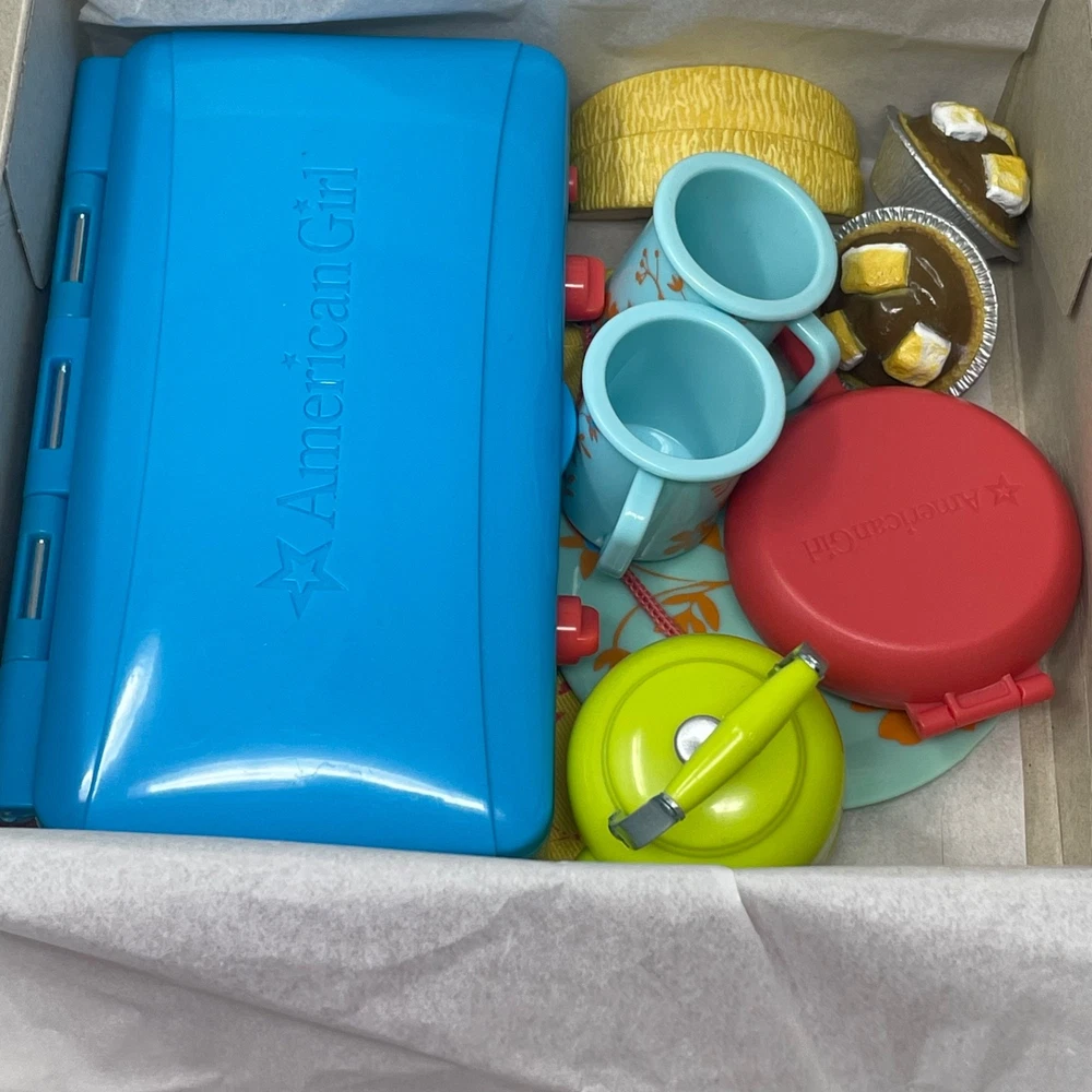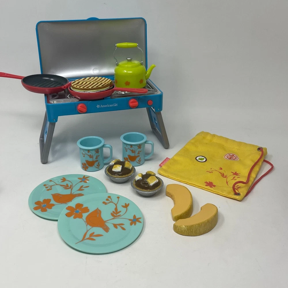 American Girl Doll My American Girl Camp Treat Set Released - 2014 Retired - 2016 Camp Treats Set comes in Original Box!! Includes: Original Box, Camp Stove, Tea Kettle, Grill Pan, Grilled Sandwiches (2), Chocolate Pies (2), Melon Slices (2), Plates (2), Cups (2), Storage Bag, Missing Dish Towel Set is in excellent condition. Please refer to the images as they are part of the description.