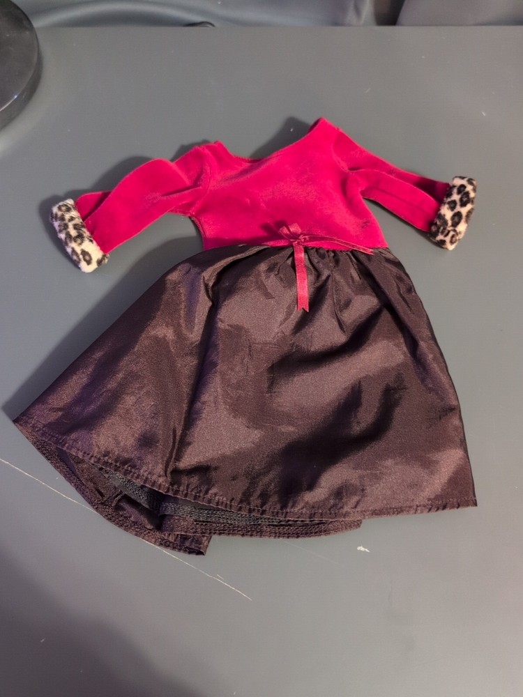 The American Girl Doll CHOCOLATE CHERRY outfit is a retired clothing set for a girl doll. This outfit includes a dress and accessories, but is missing the shoes. It is designed for play dolls and features a chocolaty cherry theme.