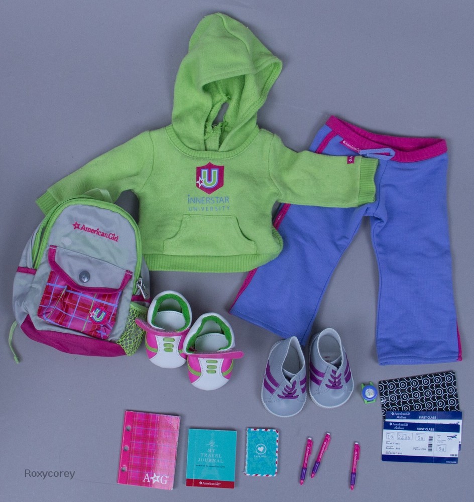DESCRIPTION: American Girl Doll InnerStar University Green Hoodie & Purple Pants Outfit, Backpack, Sneakers, Notebooks & Pens Used in a great condition RETURNS: Your satisfaction is important. Please contact us via eBay regarding any problems before leaving negative feedback. Any defects, damages, or material differences with your item, must be reported to us within 7 days of receipt of the item or 30 days from date of shipment Returned merchandise must be postmarked within 30 days of the shipment notification Return shipping will be paid by the buyer We will contact you within 14 days after receiving the item Refund will be given as money back or exchange if available