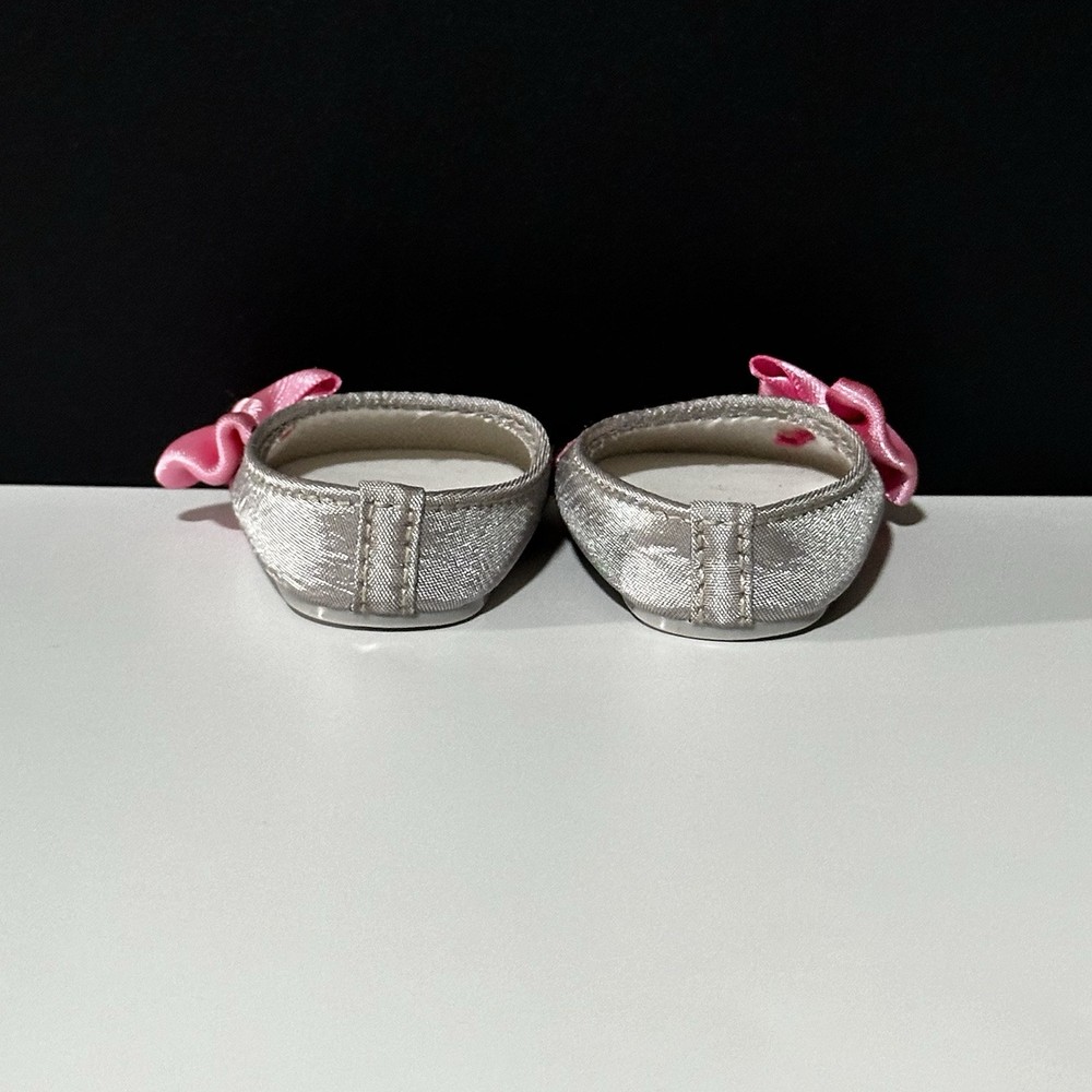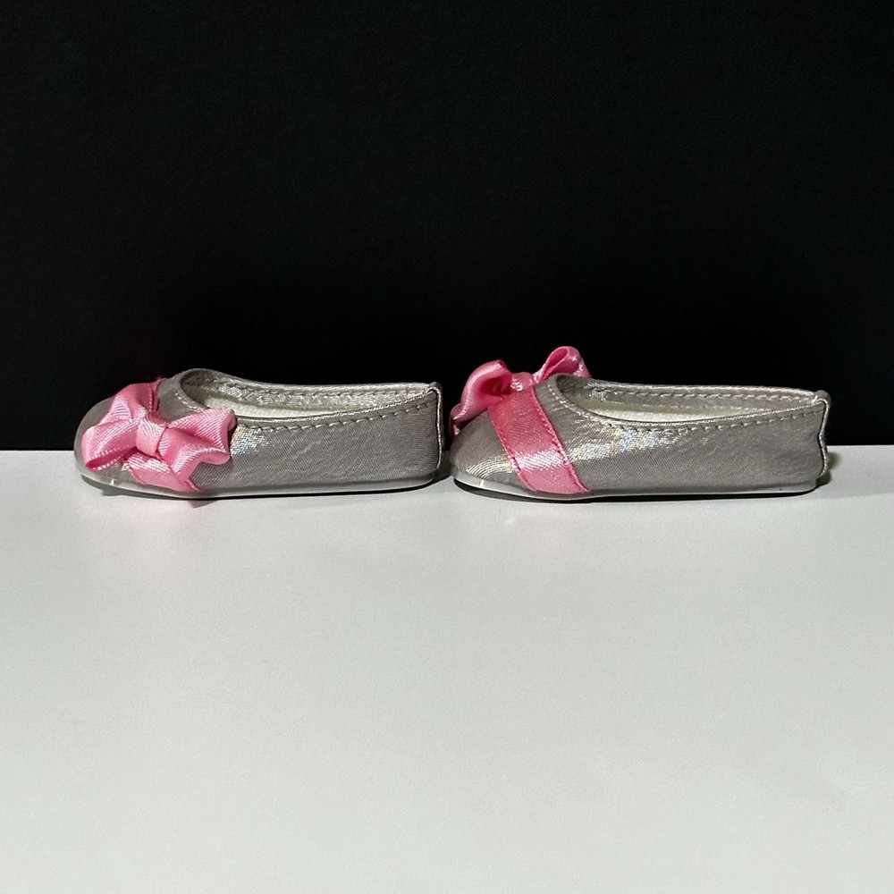 These silver flats are part of the Twirly Tiered Dress for the Bitty Baby American Girl dolls. From the 2014 Bitty Baby line. The flats have a pink ribbon across the top and a bow on the outside of the each shoe. The shoes are in great played in condition with normal signs of wear from use and time. Please review all photos for condition and ask any questions as this is sold as is. To ensure satisfaction with your items, I photograph and record the entire packing process. Returns will only be accepted if the item is returned in the same condition it was sold. Thank you for your time! :)