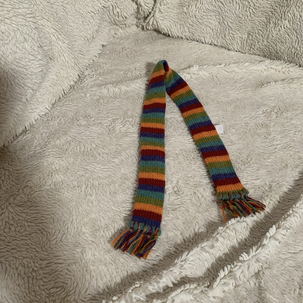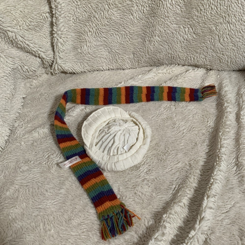The product is an American Girl JULIE Albright doll hat and scarf set from 1974, designed for an 18-inch girl doll. The multicolor clothing accessories are part of the Historical Characters product line, featuring a scarf and hat to complete the Dog Walking outfit. Perfect for collectors or those looking to add unique pieces to their doll clothing and accessories collection, this set captures the essence of the American Girl brand with its attention to detail and historical accuracy. This set is in excellent pre-owned condition, with no stains, rips or odors. All items come from a pet-free and smoke-free environment and have been carefully stored to preserve their quality.