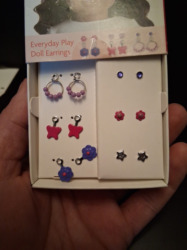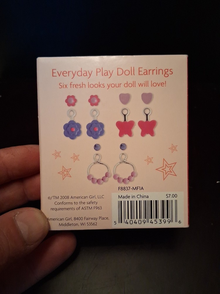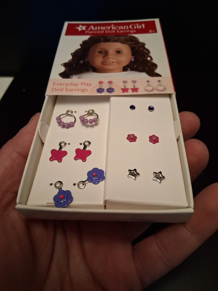 Add a touch of sparkle to your American Girl doll's everyday wardrobe with these charming pierced doll earrings. These multicolor earrings are perfect for any occasion and will add a fun accessory to any outfit. Made of metal and manufactured in 2010, these earrings are compatible with 18-inch dolls and are part of the My American Girl collection. Brand new see pictures for details perfect for any little girls favorite doll could make a great gift shipped right out USPS ground advantage These original earrings come in a sealed box and are brand new, making them a great addition to any doll collection. Whether your doll is going to a party or just playing around, these earrings will add a fun and fashionable touch to her look.