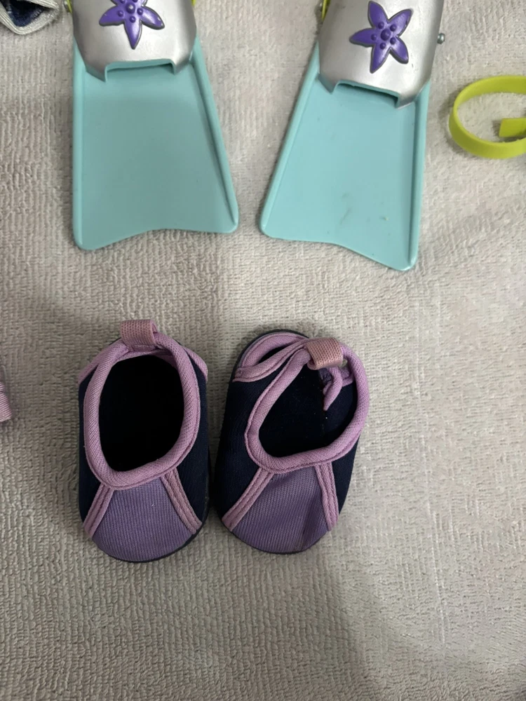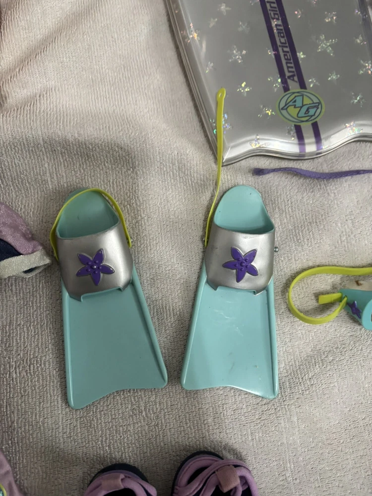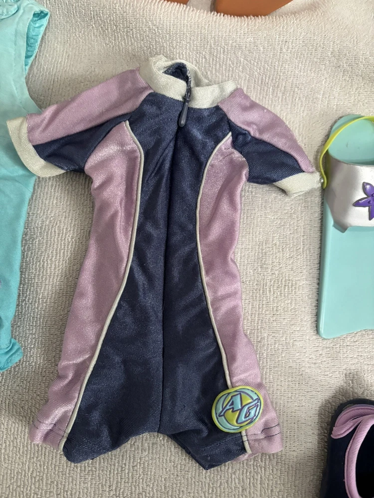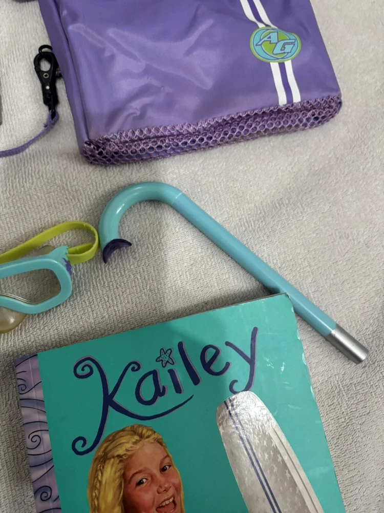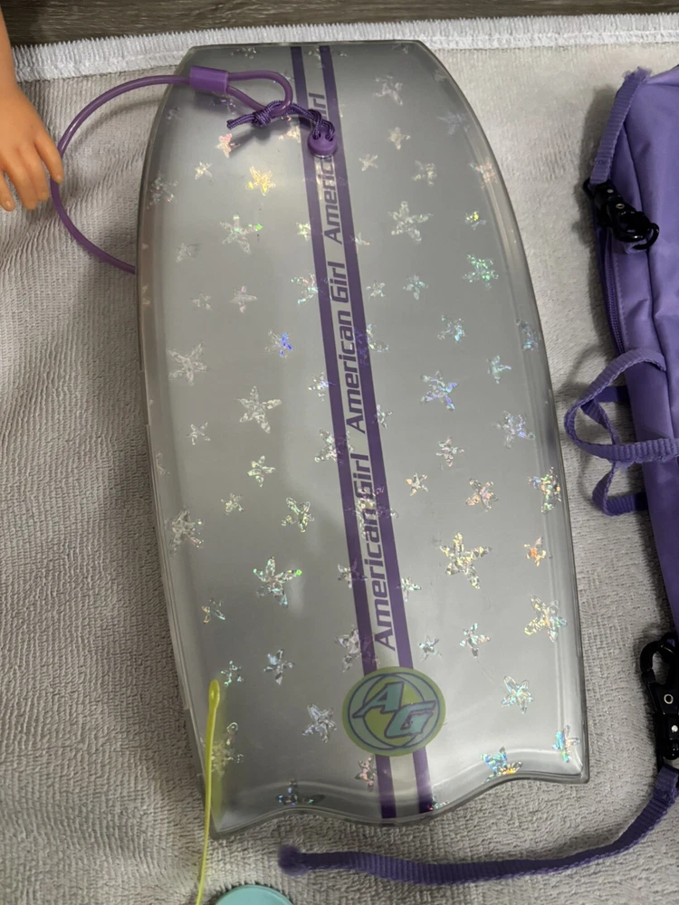 American Girl/Pleasant Company 2003 Kaylie. Retired. Many accessories but not inclusive to original. Kaylie has marks on her legs please see pictures. Accessories according to pictures for condition. Surf board, surf board carrying case. Dress, swim outfit, with swim shoes, goggles , tube and flappers. Original book. Original Owner.