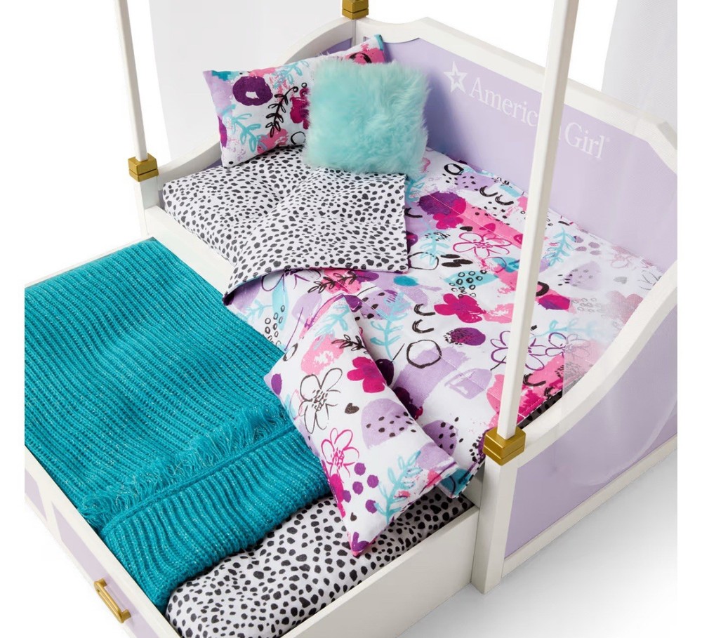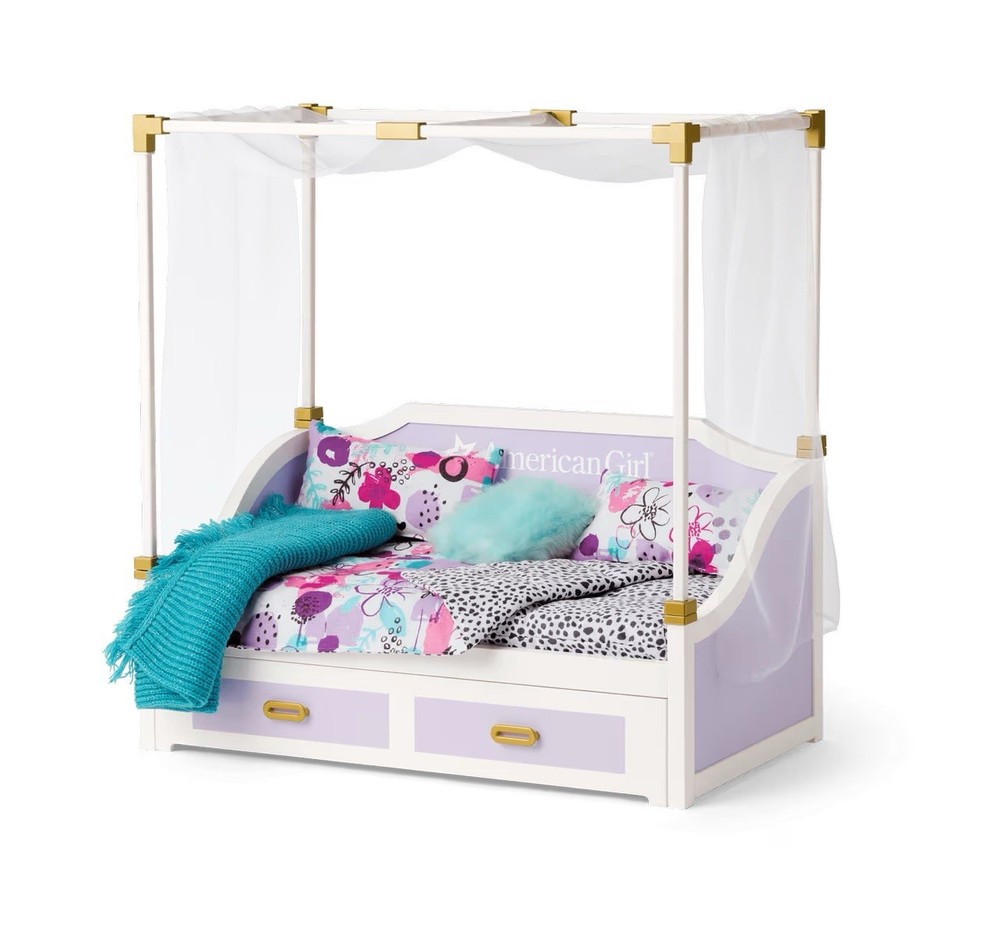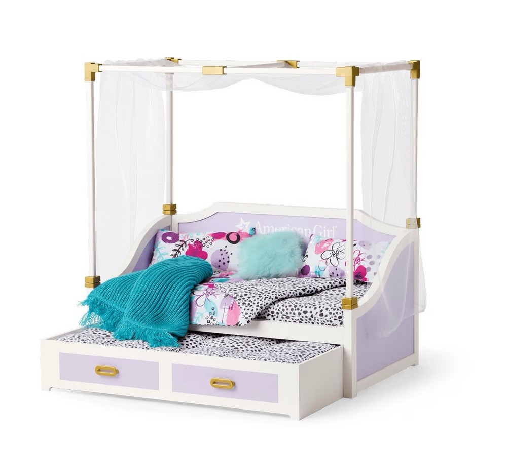Details Take sleepovers to a whole new level with a bed that fits a friend too! This set includes: A bed with a canopy that has lavender panels and metallic gold hardware A trundle bed that slides out from under the canopy bed with gold handles to help pull it out Two mattresses with a modern black-and-white dot print A reversible blanket with a black-and-white dot print on one side and a colorful abstract floral print on the other Two pillows for snoozing or to make the bed like a daybed A mint-colored furry throw pillow A teal throw blanket with a bit of gold sparkle knit in A white sheer drape that goes over the canopy to finish off a sweet sleep space. Never removed from box. Doll not included. Smoke and pet free.