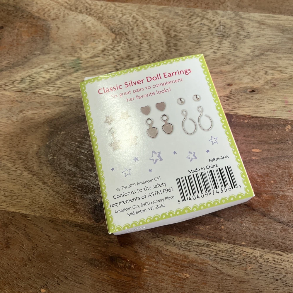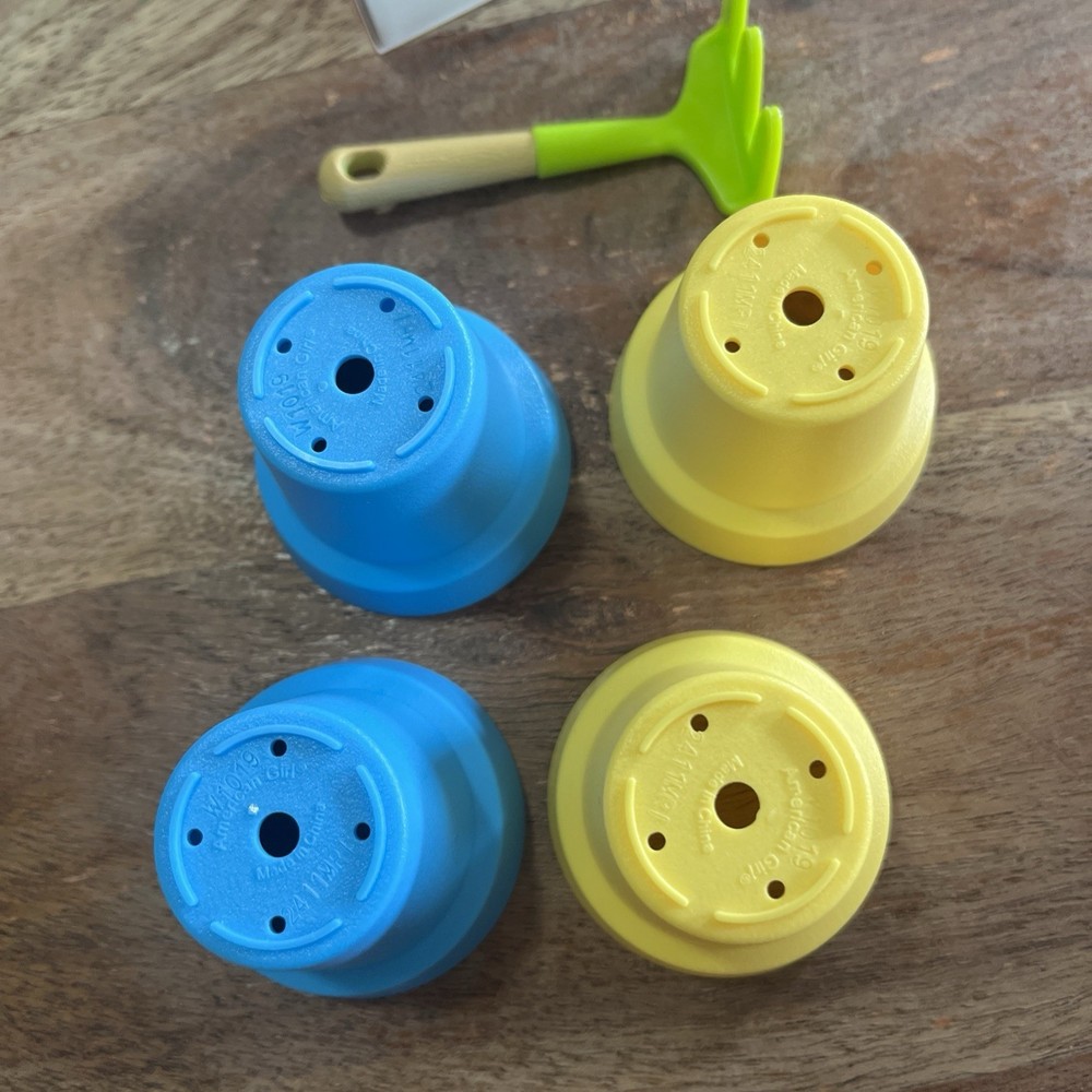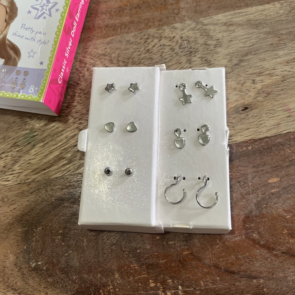 Add some sparkle to your American Girl doll's wardrobe with these classic silver pierced earrings. These earrings are perfect for any occasion and will add a touch of glamour to any outfit. The set includes 4 planters, 1 rake, and 2 bags, all made of plastic and adjustable to fit your doll's head. The earrings were manufactured in 2008 and are in excellent condition. They are a great addition to any doll collection and will make a perfect gift for any occasion. Get your hands on these American Girl Classic Silver Pierced Doll Earrings today! Mixed lot!