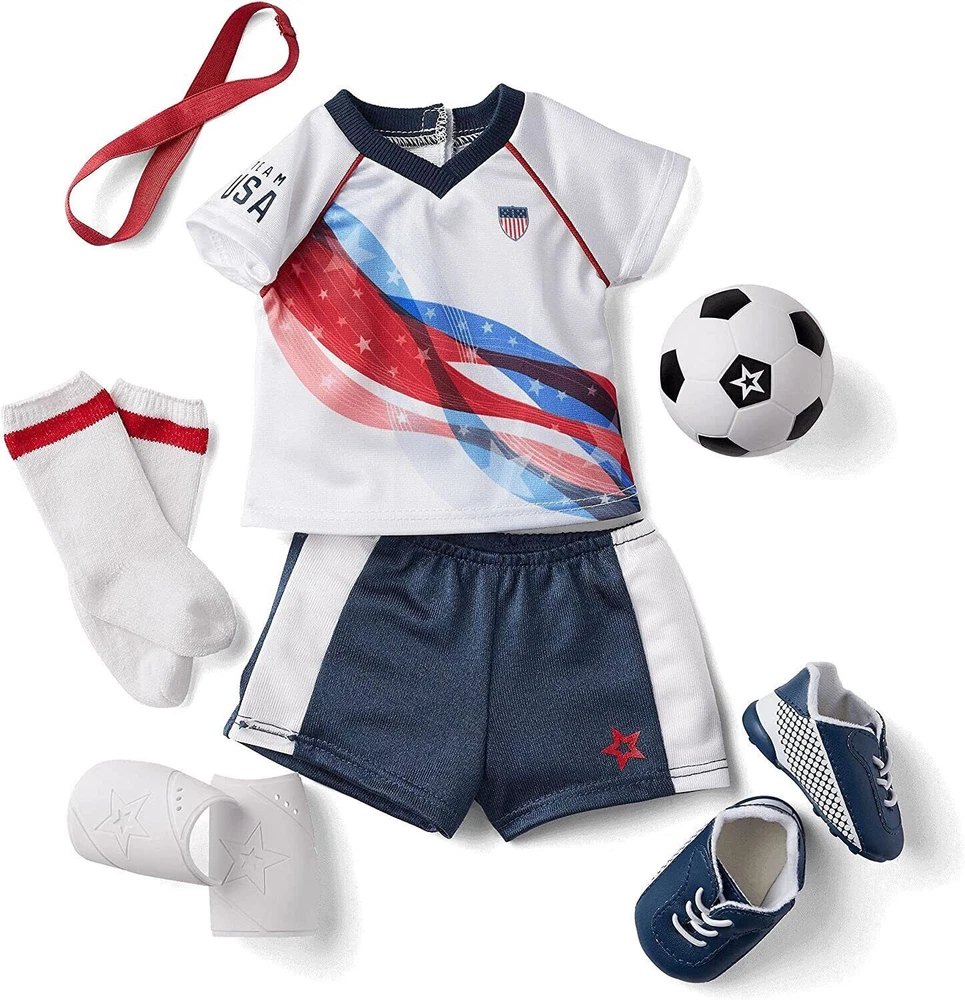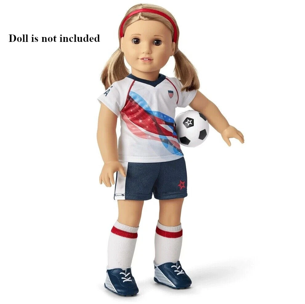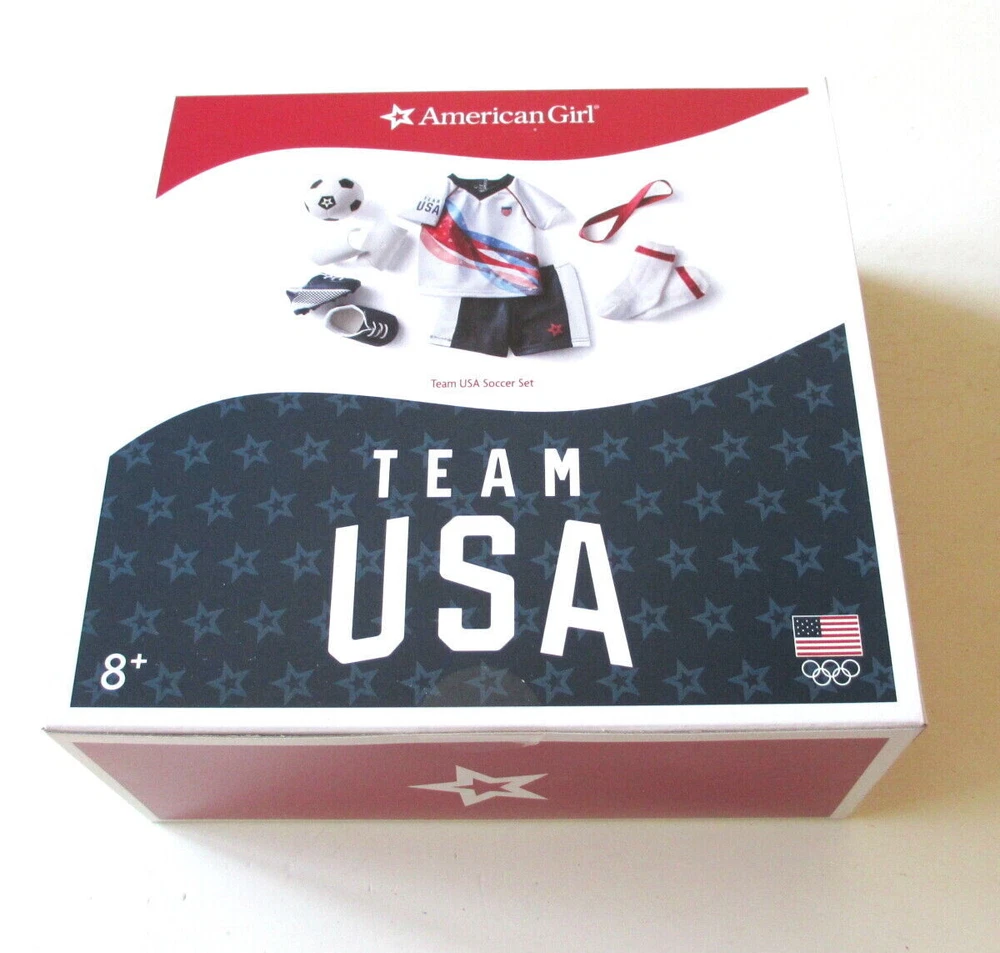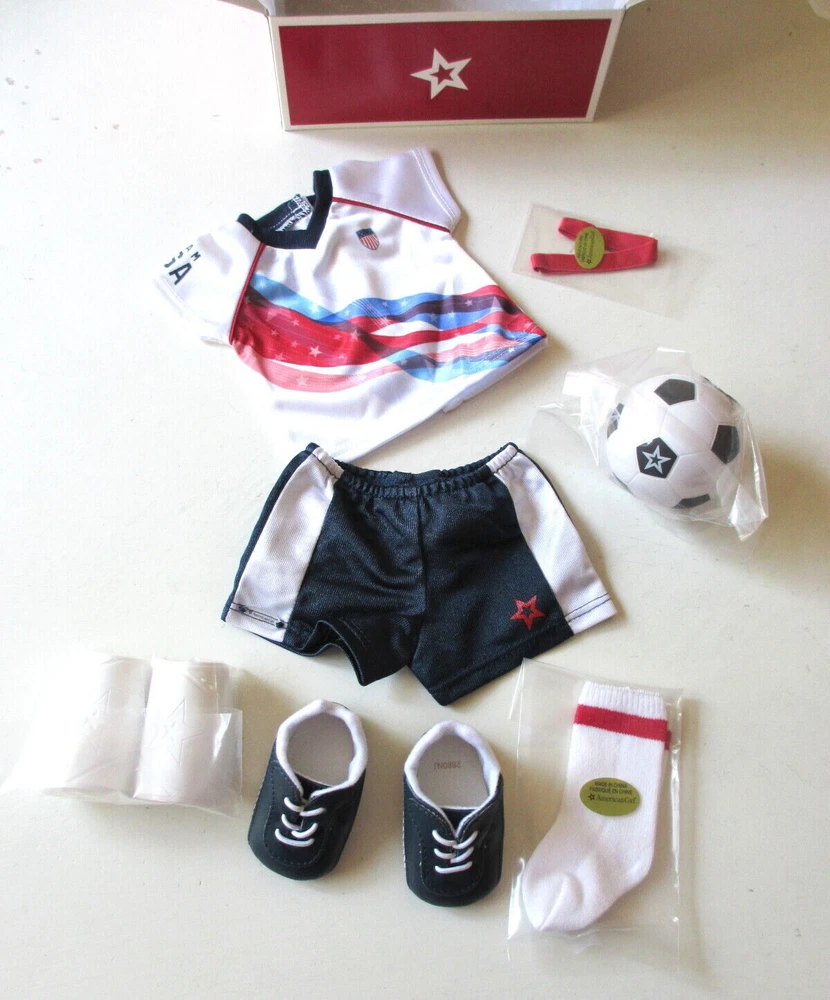 American Girl Team USA Soccer Set for 18" Dolls Doll is not included Brand new in box - retired Smoke-free pet-free environment Goal! Score one for Team USA with this set. It includes: A soccer jersey with a fun stars-and-stripes graphic on the front A pair of blue shorts with a side stripe and star logo A headband to keep her hair back A pair of socks with red stripes A pair of shin guards that clip on under a doll’s socks A pair of cleats with stripes on the side A foam soccer ball with the American Girl Inner Star logo $6.50 ground shipping or $9.50 priority.