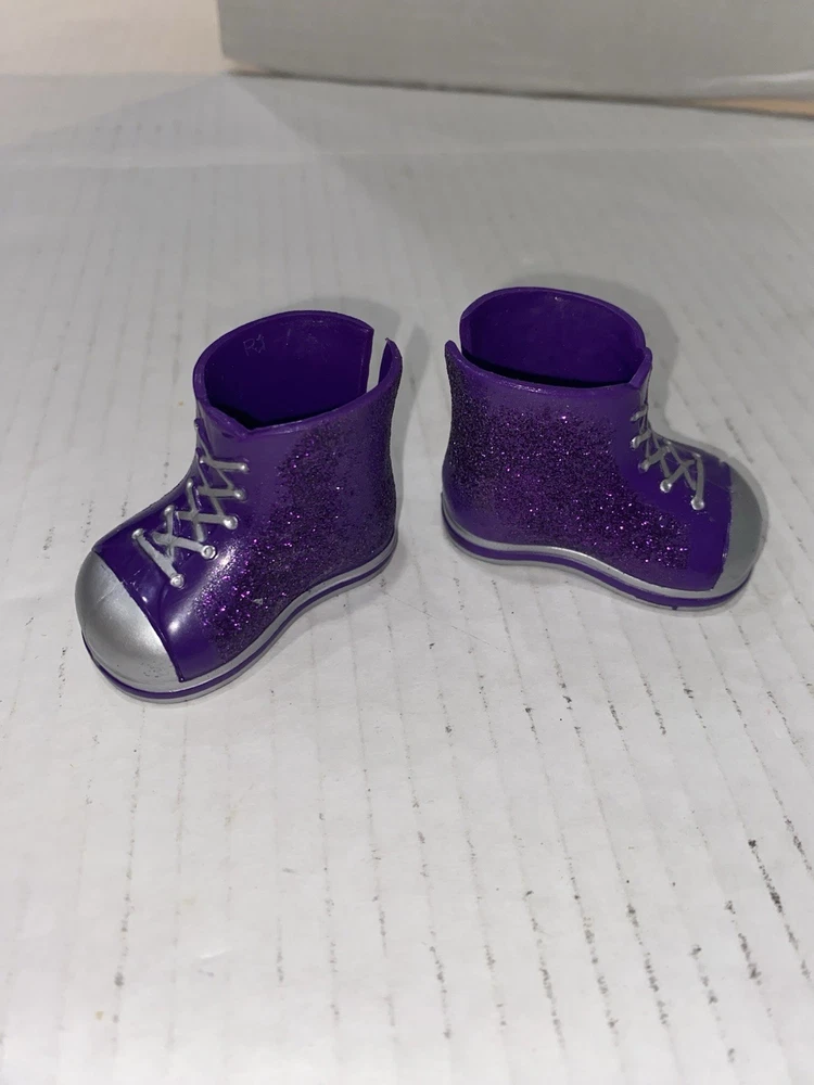 The American Girl Wellie Wishers Rock Star Boots in purple glitter are high-top boots designed for American Girl dolls. This set includes both the boots and glasses, making it a complete outfit for creative play and dress-up. The glitter material adds a touch of sparkle and glamour to the boots, perfect for a rock star theme or imaginative storytelling. Ideal for young doll enthusiasts who love to accessorize their dolls with stylish and unique clothing items.