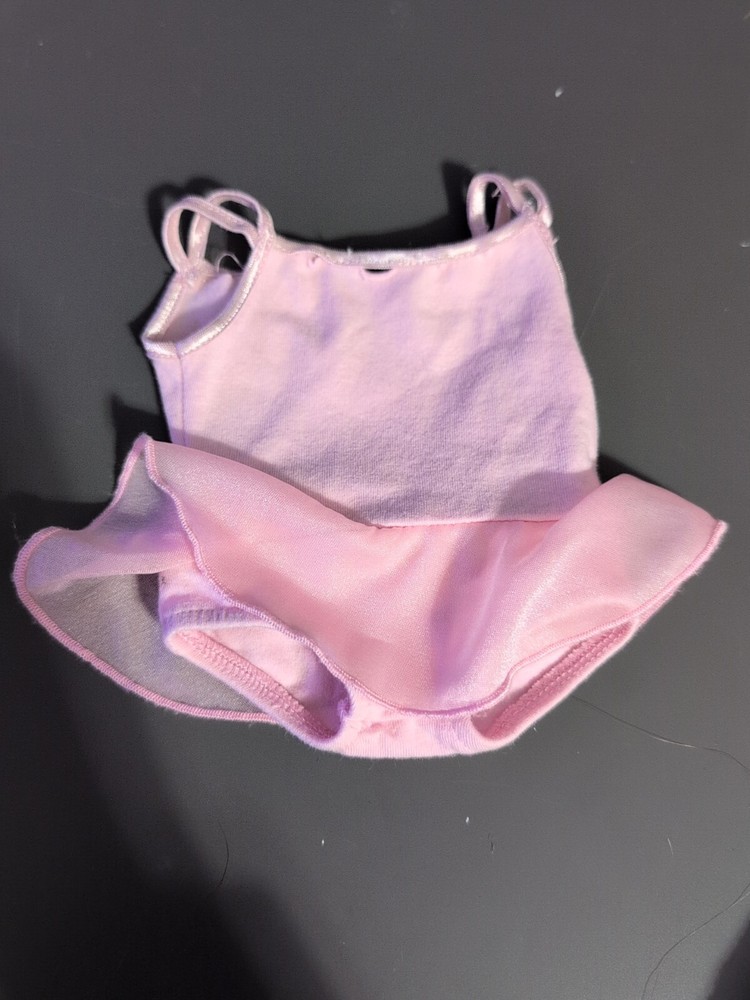 American Girl Ballet Class Outfit from the Truly Me collection in 2012. This set includes a pink skirt, sweater, top, headband, shoes, leg warmers, and socks/tights. The outfit is designed for a 18-inch girl doll and is suitable for all occasions. Please note that the slippers and hair ties are missing, and there is a hole on the top.