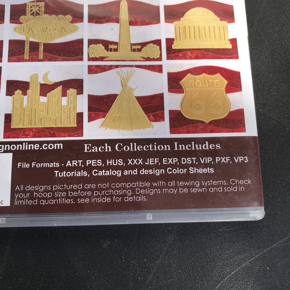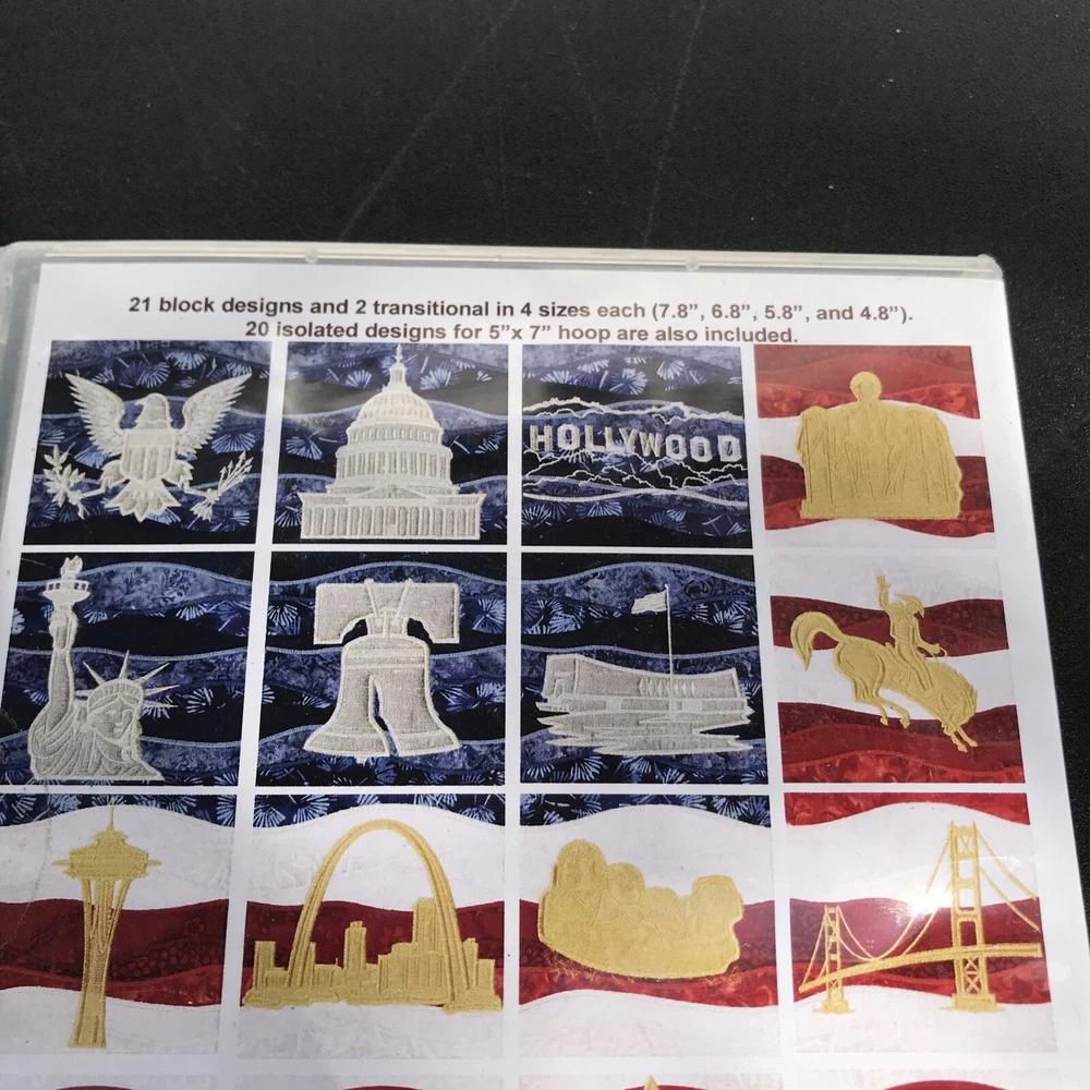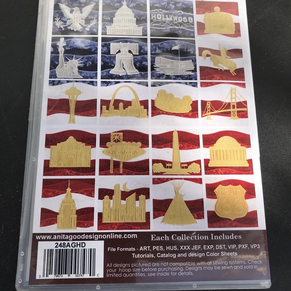 This American Landmarks Anita Goodesign Embroidery Machine Design CD is a must-have for all embroidery enthusiasts. The CD contains a variety of designs, including Hoop sizes 5” x 7” to 8” x 12”, and formats such as ART, PES, HUS, XXX, JEF, EXP, DST, VIP, PXF, and VP3. Made in the United States, this CD is a great addition to your collection and perfect for creating beautiful and unique embroidery designs. Item is sealed