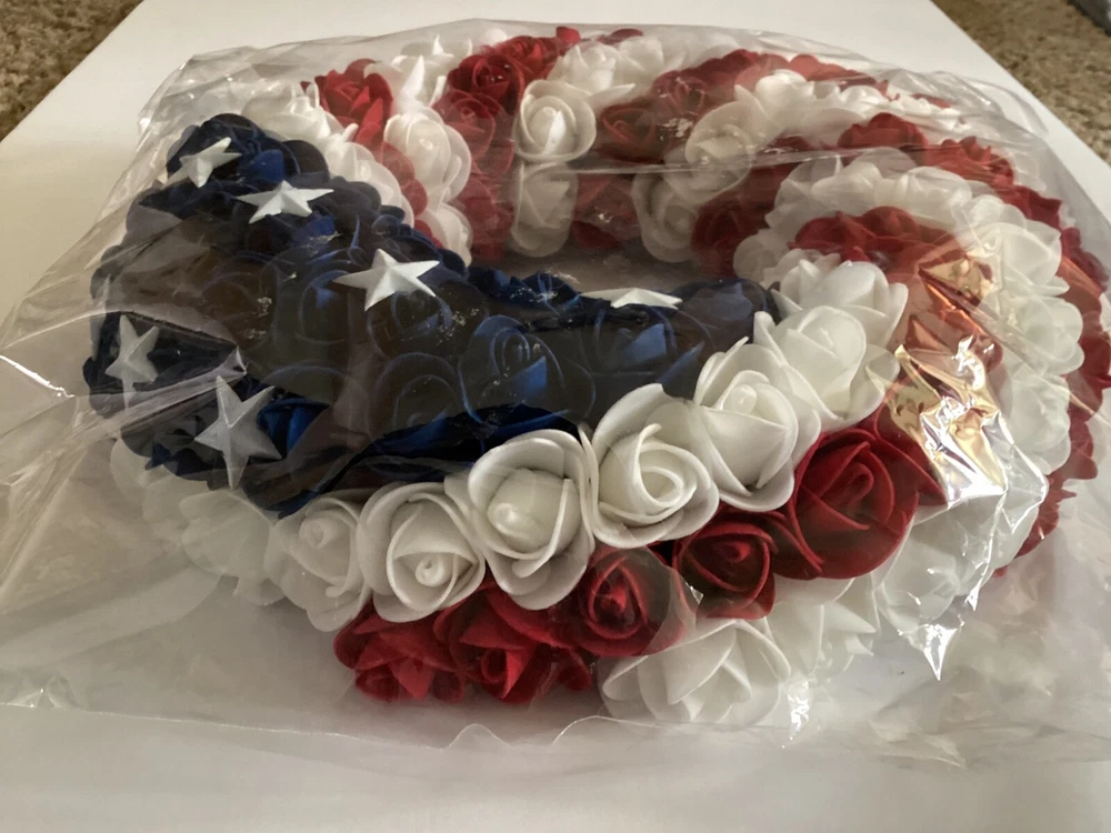 This wreath is stunning—perfect for showing patriotic pride! The foam roses and metal stars look high-quality, and the lightweight design makes hanging a breeze. The craftsmanship is impressive, and it’s versatile enough for doors, caskets, or grave decorations (though not weatherproof). Even with the bag opened for photos, it arrived in great condition. Love it!