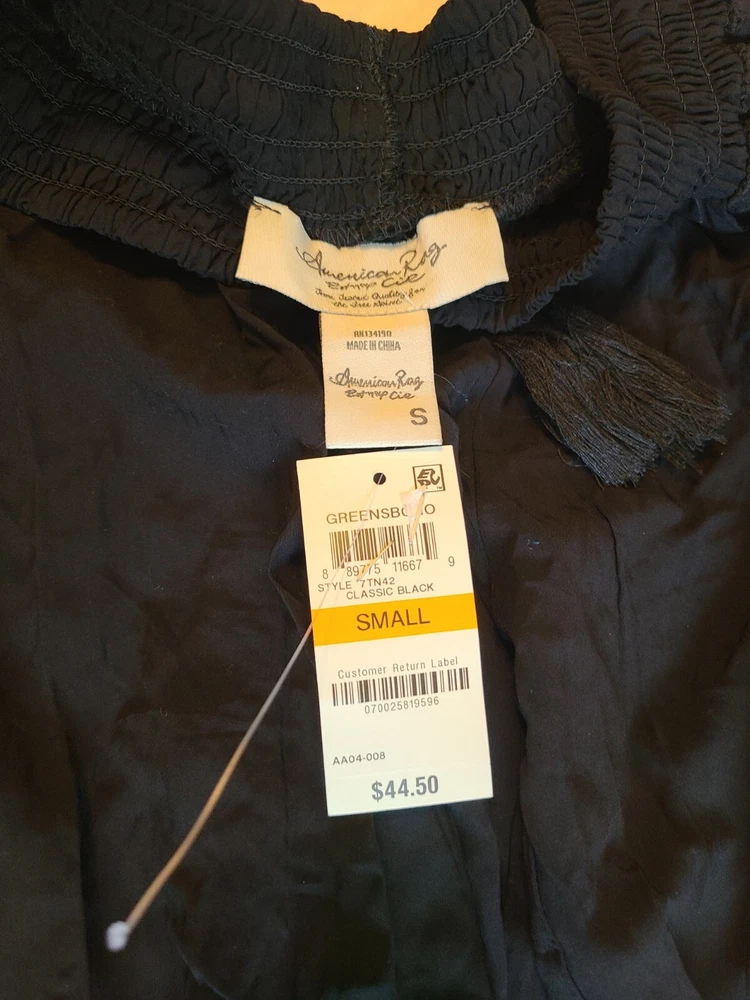 Elevate your casual wardrobe with these American Rag soft pants. Featuring an elastic waist and cuffs with crochet trim, front pockets and tasseled accents, these pants are perfect for travel, workwear, or everyday casual occasions. The high-rise pants have a straight leg style and are made of 100% rayon material, making them comfortable to wear in any season - winter, summer, fall, or spring. These black pants come in size S and have a pull-on closure with a drawstring. They have a flat front and are machine washable. Ideal for women who want to look stylish and comfortable, these pants are a great addition to any wardrobe. See photos for measurements approximate. NWT. Retail value $44.00. Soft, comfortable, and classy!