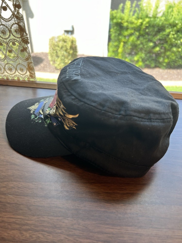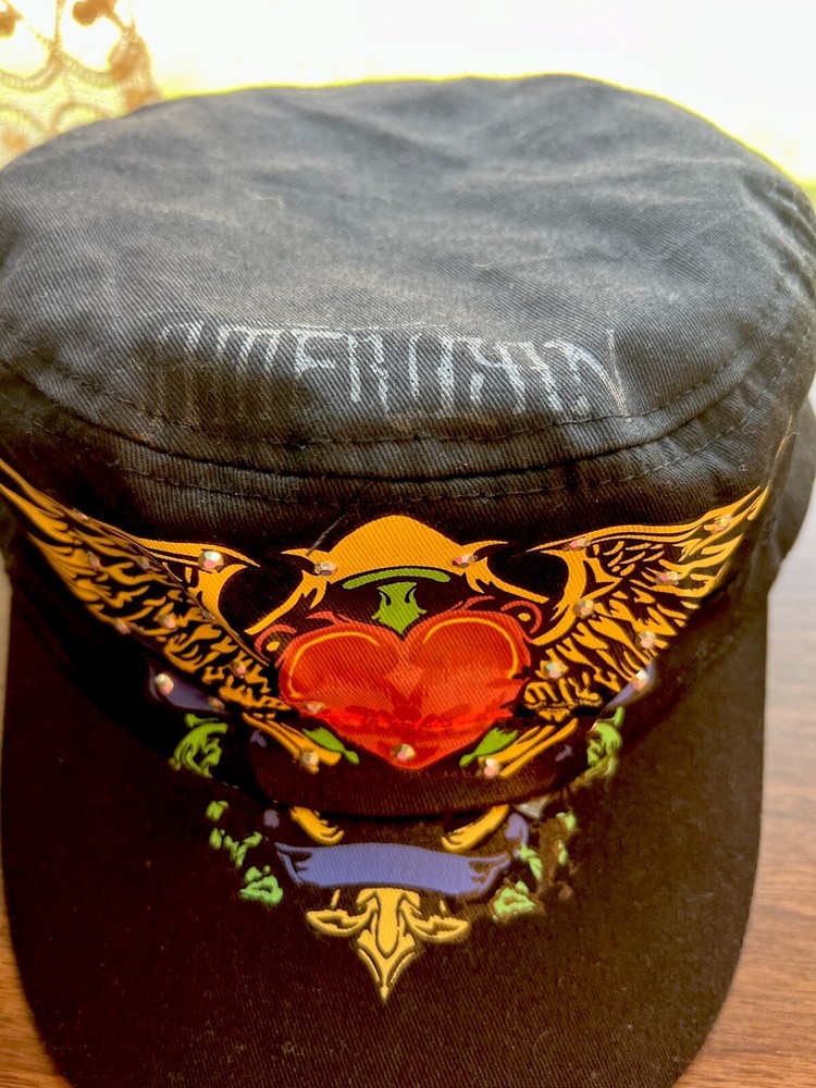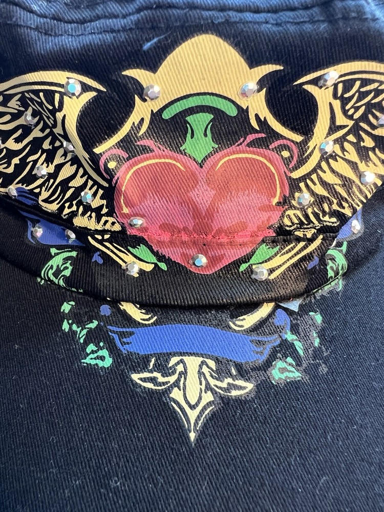 This black baseball cap by AMERICAN TATTOO WEAR features clear rhinestones and a eagle and heart design. Made of 100% cotton canvas, it has a vintage style with accents of rhinestones and a logo. The cap is lightweight, breathable, and adjustable, suitable for casual wear, travel, or activewear. The theme includes elements like biker, tattoo, gothic, and punk, making it a stylish accessory for outdoor and festival occasions.