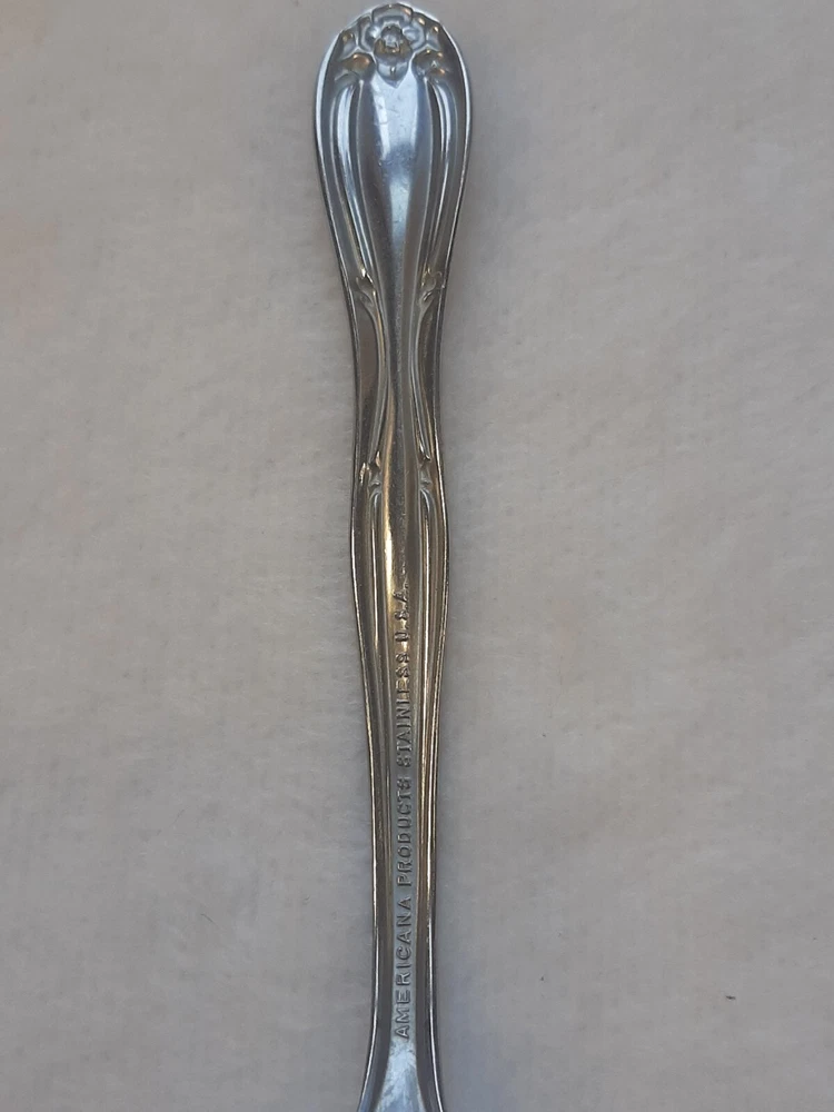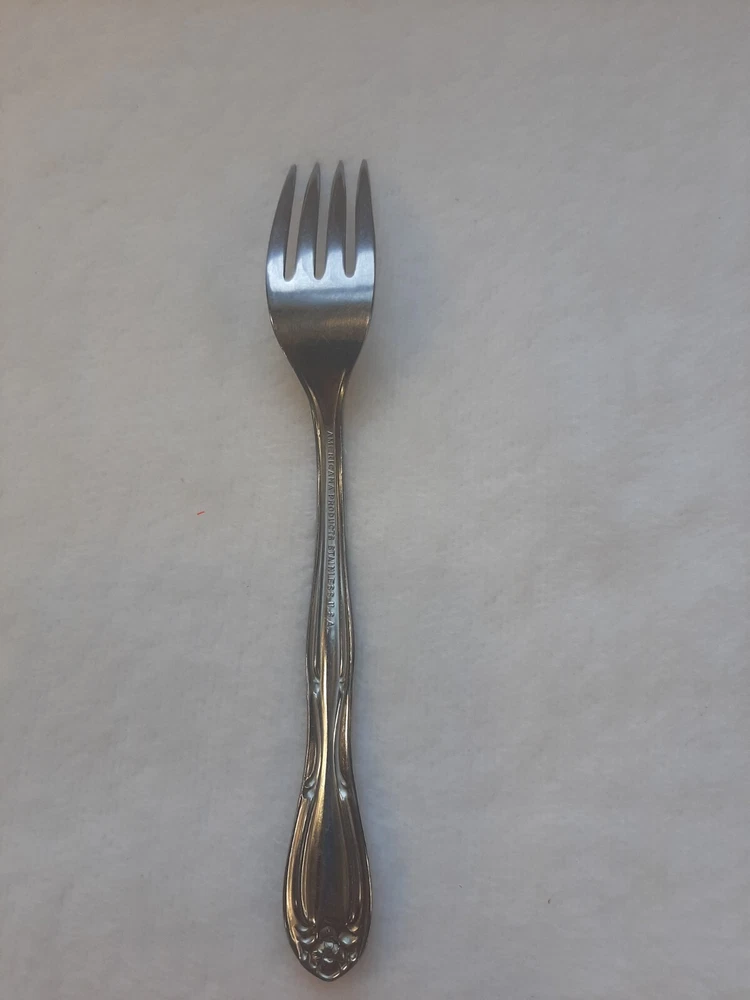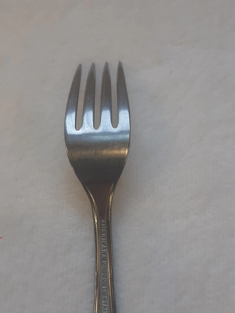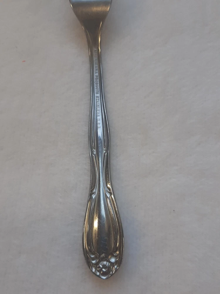 Americana Products Stainless USA 7" Floral Pattern Handle Replacement Fork In good pre-owned condition may show signs of wear from use/handling/storage/display. Please view all pics for condition/details/flaws/issues. SOLD AS IS There is/maybe marks/spots/dirt/debris please see photos 1-12, there is/maybe paint loss/sticker loss please see photos 1-12, there is lite discoloration please see photos 1-12, there are surface scratches to item please see photos 1-12, please see all photos for condition/issues/details.