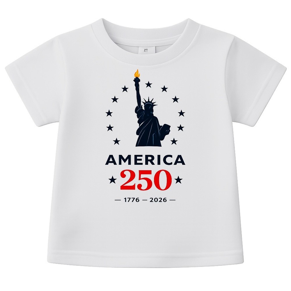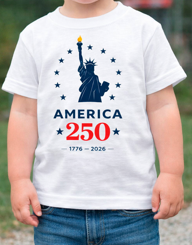 America 250 Infant/Toddler T-Shirt • 1776-2026 • U.S. Historic Commemorative Semiquincentennial Celebrate America’s 250th anniversary with this patriotic infant and toddler T-shirt featuring a bold America 250 design. Printed on a soft, comfortable infant and toddler tee, this shirt is made for everyday wear while commemorating a historic American milestone. The design features a stylized Statue of Liberty surrounded by stars, paired with America 250 and the dates 1776–2026, creating a timeless, family-friendly patriotic look. Details Gildan brand infant & toddler T-shirt White shirt with full-color printed design Soft, durable fabric suitable for active babies and toddlers Short sleeves with classic crew neck Perfect for Fourth of July celebrations America 250 / Semiquincentennial events Family photos and patriotic occasions Gifts for babies and toddlers Available Sizes Infant & Toddler sizes: 6M–6T Infant sizes (6M–24M) offer a roomier fit for younger children Toddler sizes (2T–6T) feature a slightly longer, more upright fit --------- Mockup images are for display purposes only. Actual print placement and scale may vary slightly by size. This item is produced on demand to ensure quality and consistency. Not affiliated with or endorsed by any government agency or official organization.