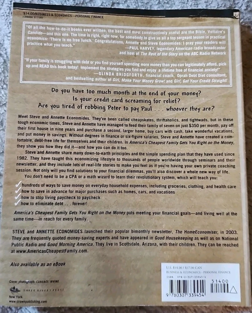 Discover the secrets to living a fulfilling life with America's Cheapest Family Gets You Right on the Money: Your Guide to Living Better, Spending Less, and Cashing in on Your Dreams. Written by Steve and Annette Economides, this book is a comprehensive guide that covers personal finance, budgeting, motivation, and sociology. Published in 2007 by Crown Publishing Group, T.H.E., this book is a must-read for anyone looking to improve their financial and personal life. With 288 pages, it provides valuable insights into how to save money, live simply, and find joy in the little things. Get your copy today and start your journey towards financial and emotional freedom.