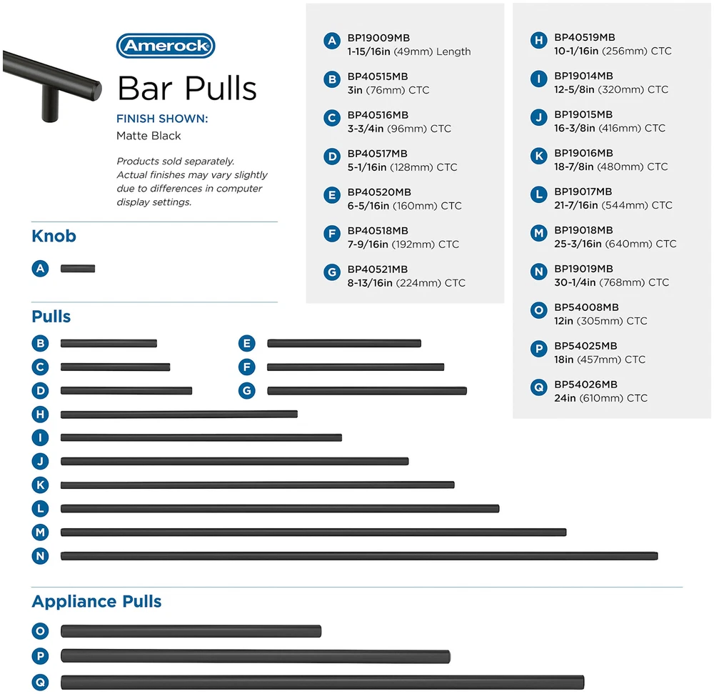 Powered by Frooition All Categories Amerock BP54008 Bar Pulls 12 Inch Center to Center Bar Appliance Pull Overview Item Description Features: Constructed of solid stainless steel for durability and dependability Coordinates with other items from the Bar Pulls collection Includes mounting hardware: #10-24 x 3/4 in., #10-24 x 1 in., #10-24 x 1-1/4 in., #10-24 x 1-1/2 in. and #10-24 x 1-3/4 in. Phillips Head Screw Covered by Amerock's limited lifetime manufacturer warranty Includes a single (1) pull Contemporary style adds an easy designer upgrade to any cabinet drawer, cabinet door or furniture piece Dimensions: Center to Center: 12" Length: 14-5/8" Width: 3/4" Projection: 2" Why Choose BuildInc? OUR PROMISE TO YOU About Us At Build, we promise to provide the best selection we can, most competitive pricing, and unmatched customer service. Our store has quality home improvement products from trusted manufacturers like Moen, American Standard, Delta, Kraus, Kichler, Progress Lighting, Schlage, Kwikset, Baldwin, Broan, NuTone, Air King, and Rev-A-Shelf. With over 200,000 home improvement products for you to choose from, we have just what you need to get your project done. Fast & Free Shipping We promise to make it our priority to get you your items as fast as we can. We ship from 440 warehouses around the country, ensuring that your product will get to you as soon as possible. We know you're eager to get your hands on your new purchase, we would be too. As a bonus, most items ship for free. Returns We are happy to accept returns of unused or defective items for a refund within 30 days from the date of delivery. For returns outside 30 days, please contact our Customer Service team to go over our options. For full details, please view the Shipping and Payments tab above. To initiate a return simply go to the eBay Returns Portal and submit a return request. We ask that all items be returned with all original components via a traceable method. Once your return is received and processed, we will quickly get your refund or replacement issued. If for any reason you are unsatisfied with your purchase or for product or warranty questions, please contact Customer Service team for assistance. More Items! View more great items! About Us | Shipping | Returns | Contact Us | FAQ | Collections | Special Offers! Powered by Frooition Frooition Frooition | No-js Template | eBay design, eBay store design, eBay shop design, eBay template design, eBay listing design (ver:froo_no_js) This listing is currently undergoing maintenance, we apologize for any inconvenience caused.