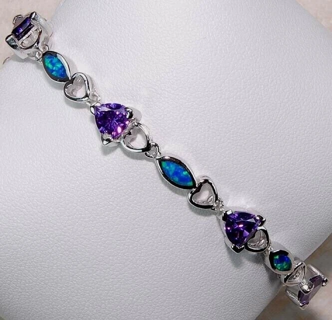 Country of Origin: Thailand Style: Tennis Main Stone Treatment: Not Enhanced Color: Blue Theme: Fashion & Costumes Type: Bracelet Number of Diamonds: Not Applicable Chain Type: Not Applicable Main Stone: Amethyst Occasion: Anniversary, Birthday, Engagement, Confirmation/Communion Diamond Color Grade: Not Applicable Brand: Handmade Cut Grade: Excellent Setting Style: Prong Item Length: 7 in Features: Nickel-Free Metal: Sterling Silver Diamond Clarity Grade: Not Applicable Metal Purity: 925 Base Metal: Sterling Silver Main Stone Shape: Trillion Country/Region of Manufacture: Thailand Main Stone Color: Purple Secondary Stone: Opal Gemstone Clarity Grade: Eye Clean Number of Gemstones: Not Applicable Material: Gemstone