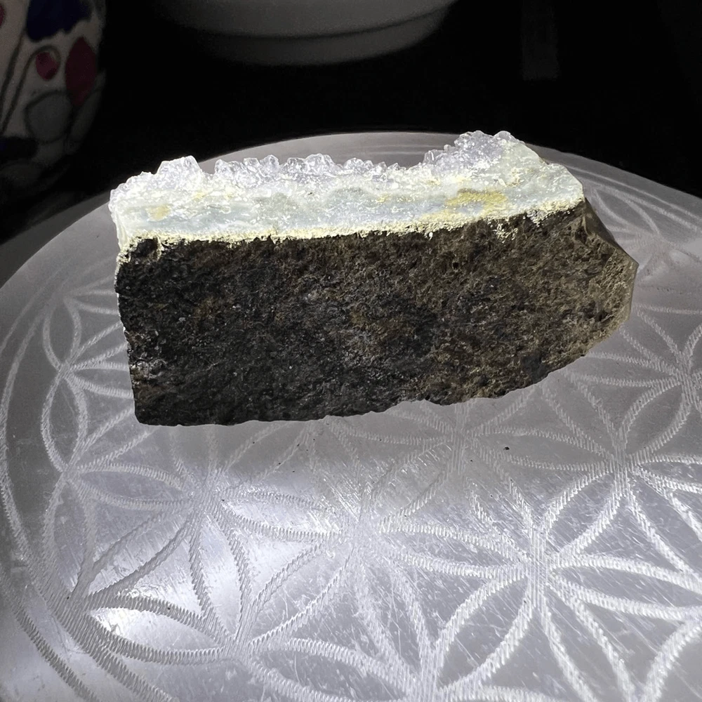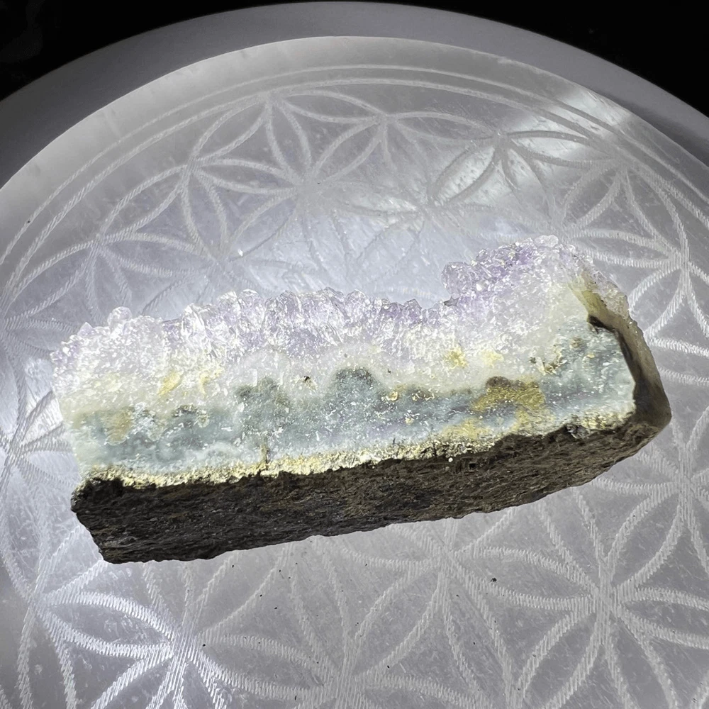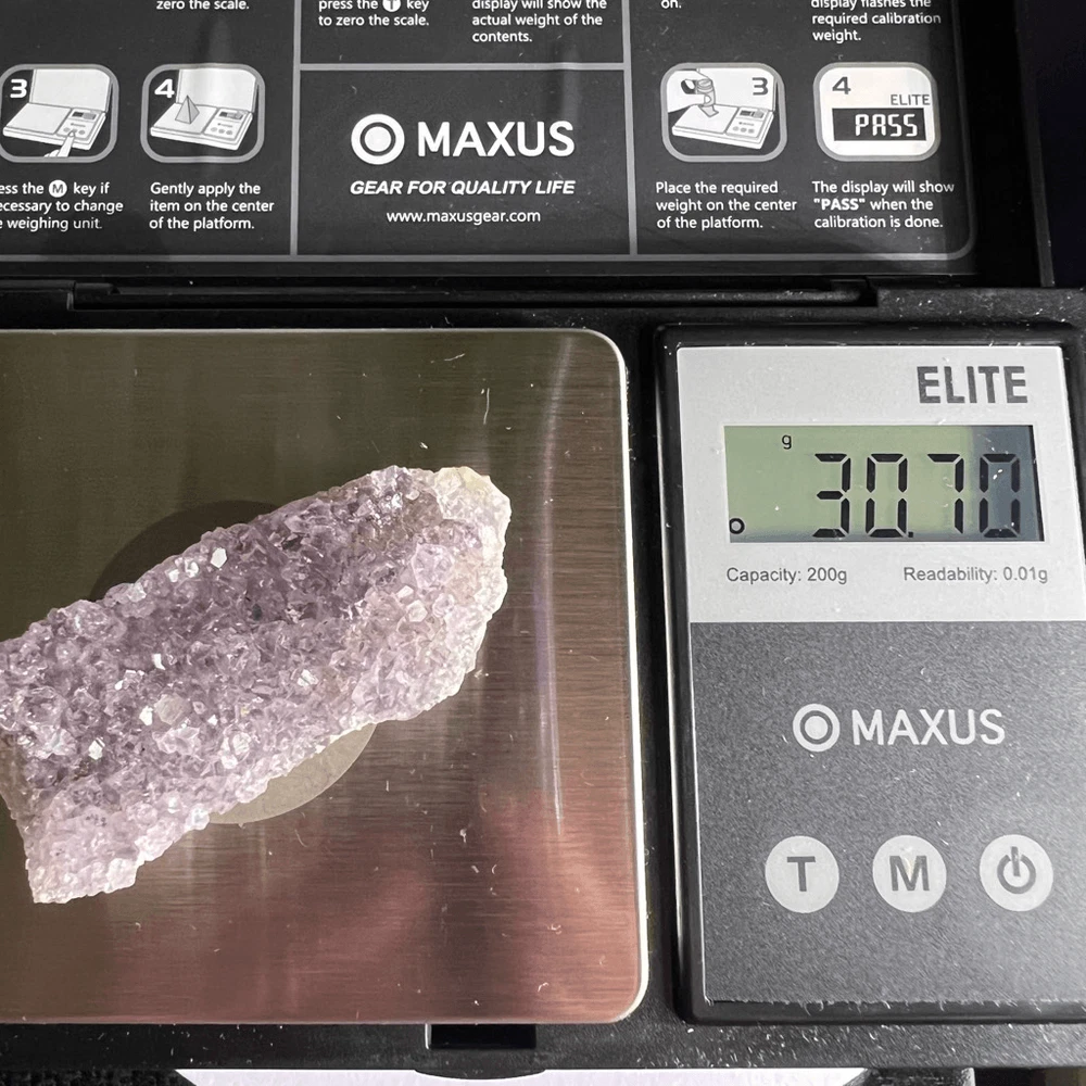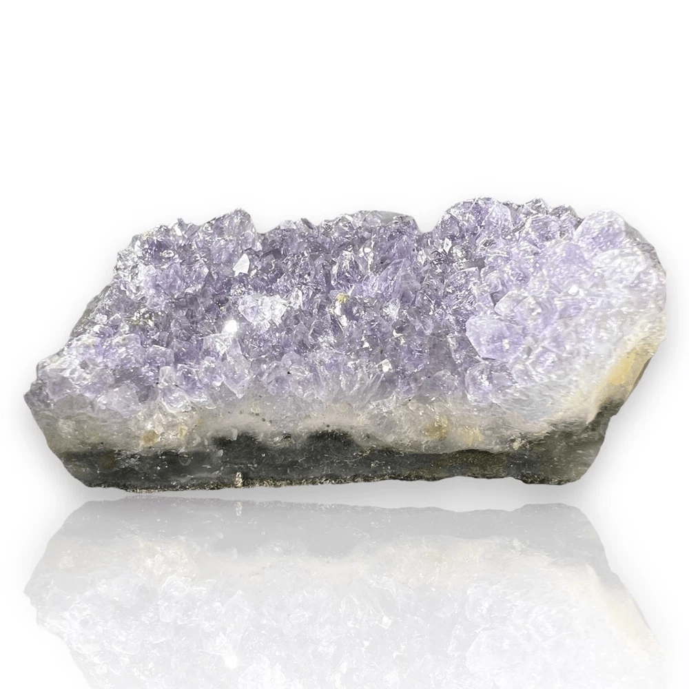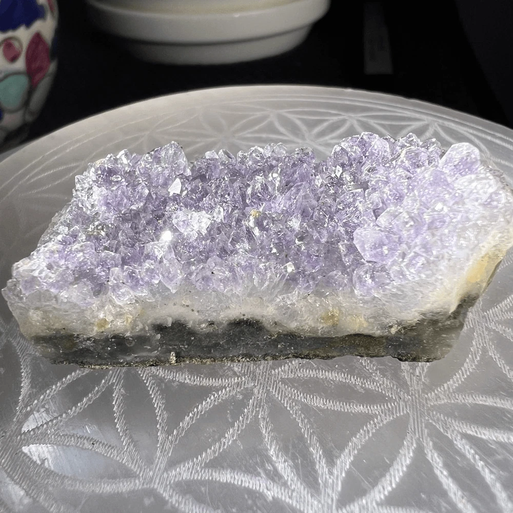Amethyst Crystal Druzy Cluster (#3) ***LISTING IS FOR ONE ITEM *** An amethyst cluster is a stunning violet-hued crystal formation, characterized by its multitude of interconnected, pointed crystals. This exquisite specimen radiates tranquility and spiritual energy, making it a popular choice for meditation and stress relief. Amethyst is renowned for its ability to enhance intuition, promote emotional balance, and aid in sobriety. Its harmonizing properties create a soothing ambiance, ideal for enhancing one's spiritual practice and promoting a sense of inner peace and clarity. Approximate Measurements 30.70 grams 1.94” x 0.82” x 0.71” Please note natural stones are one of a kind and tend to have imperfections. Certian Lighting may alter the crystal’s color display in photos. Smoke Free | Pet Free Environment