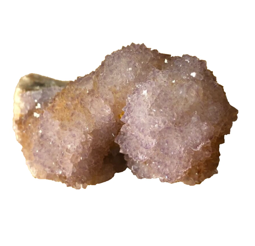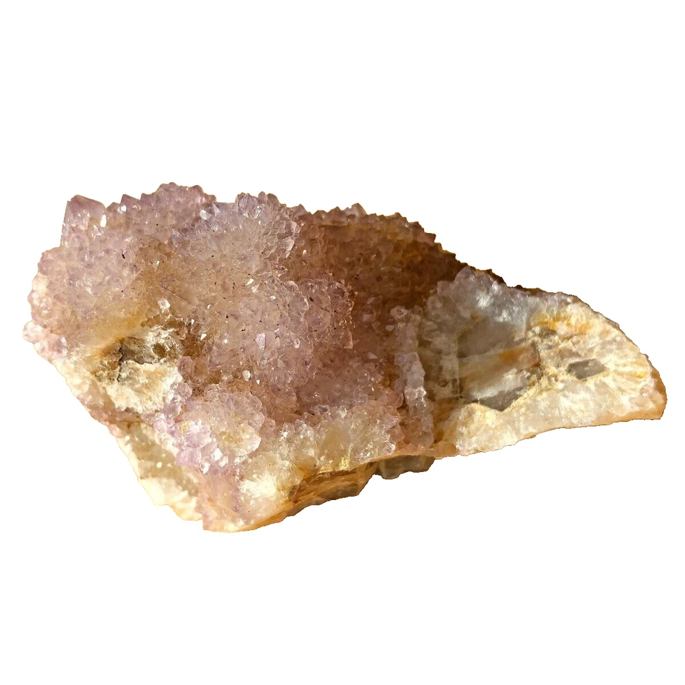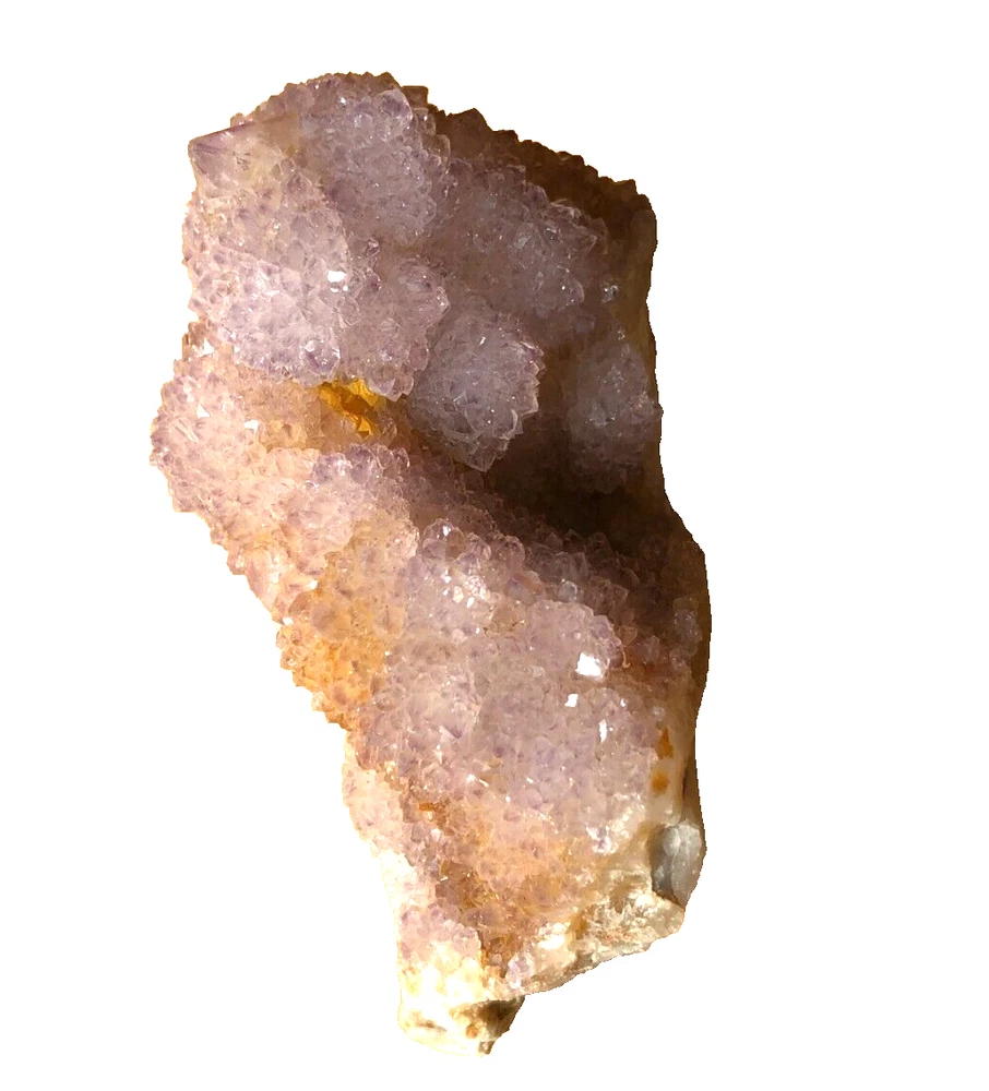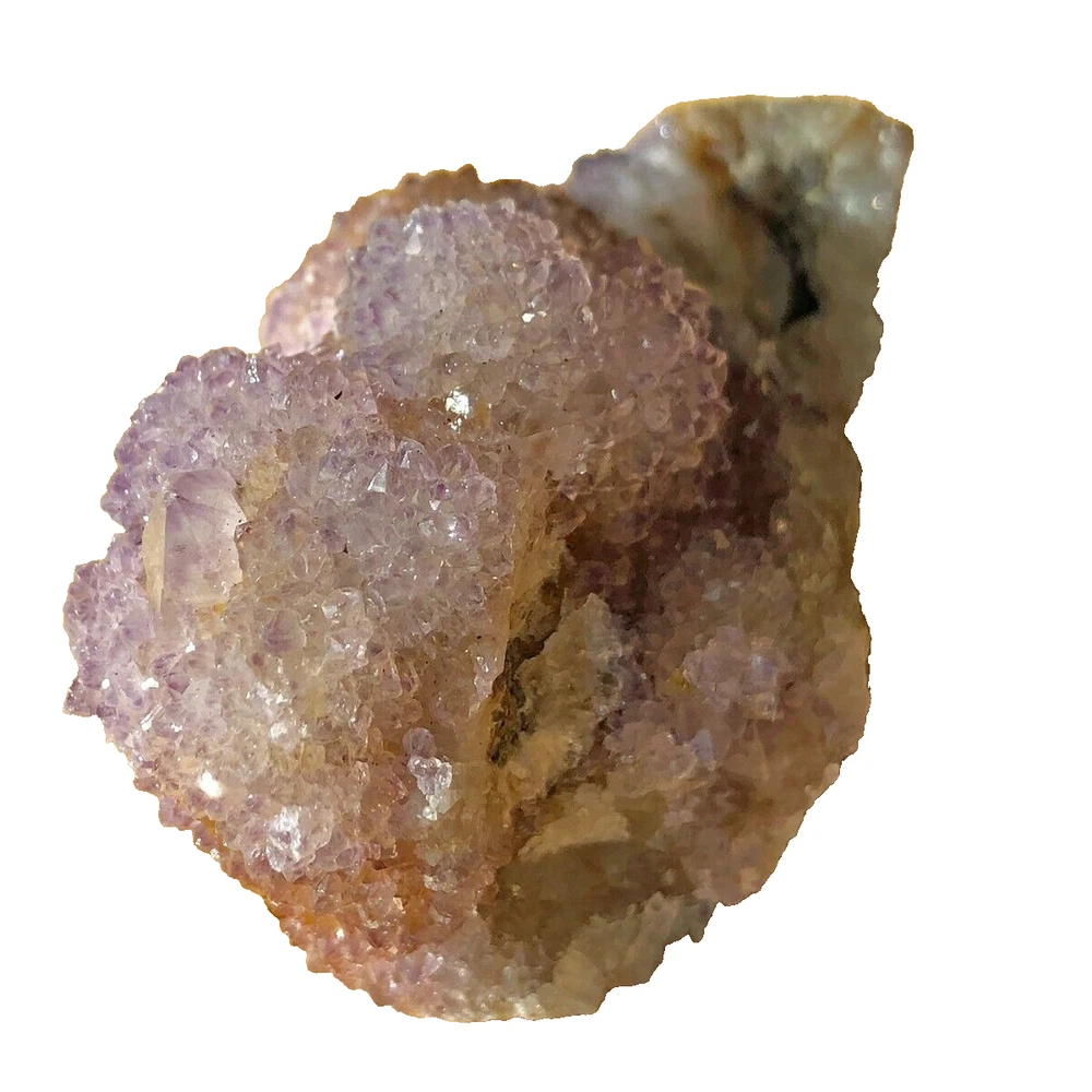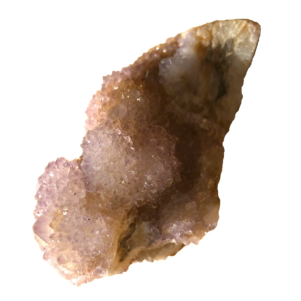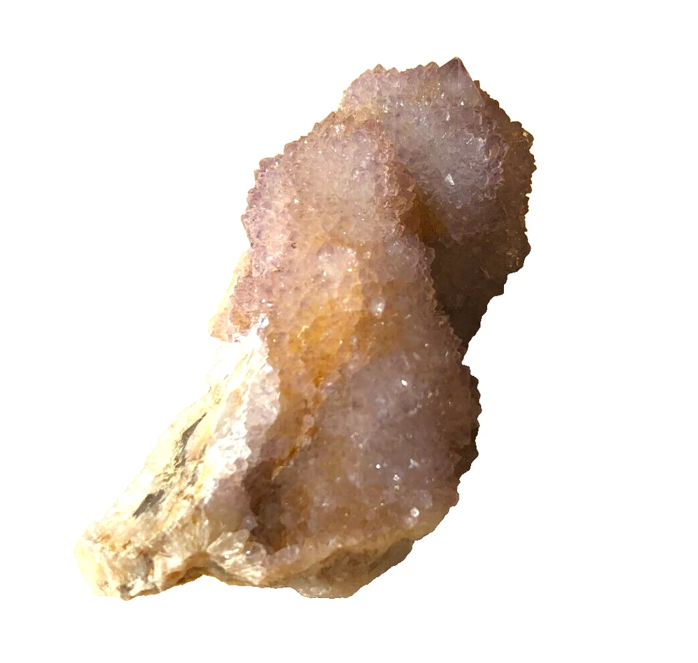 Cactus Quartz or Spirit Quartz Size Approximately 3.5 cm x 6 cm x 3.5 cm 70 g View My Other Items For Sale Visit My eBay Store Add me to your Favorite Sellers A cactus or spirit quartz is a quartz crystal that is encrusted by a second generation of smaller crystals grown on its prism faces. These crystals were first discovered in 1986 in the Magaliesberg Mountain Range near Pretoria, South Africa. It occurs as quartz, citrine and amethyst, and comes in a wide range of colors, including purple amethyst, violet amethyst, smoky, milky clear and golden citrine. FAQ/Tips Crystals are priced by quality, color and size. Purple amethyst is more highly prized and will cost more for a smaller lesser quality crystal. Lavender is the most common color and where you will find the best quality/value for price Crystals change colors with changes in type angle and intensity of light. Color may also vary between monitors. Pictures were taken in bright natural light. We do our best to give you many views so you can judge the quality of the given crystals. If you have questions please ask before bidding or buying. Many of the crystals have special color properties: Many have phantoms, not just the ones we?ve indicated. Some have ?floating? purple tips. The placement of darker purple against purple or white crystals appears to change as the crystal is turned. Many are a mixture of citrine and amethyst. The ones called ?Golden Healers? or ?Sunshine? have a rainbow effect on crystal faces. We value your feedback please contact us with problems. Items are returnable. Track Page Views With Auctiva's FREE Counter