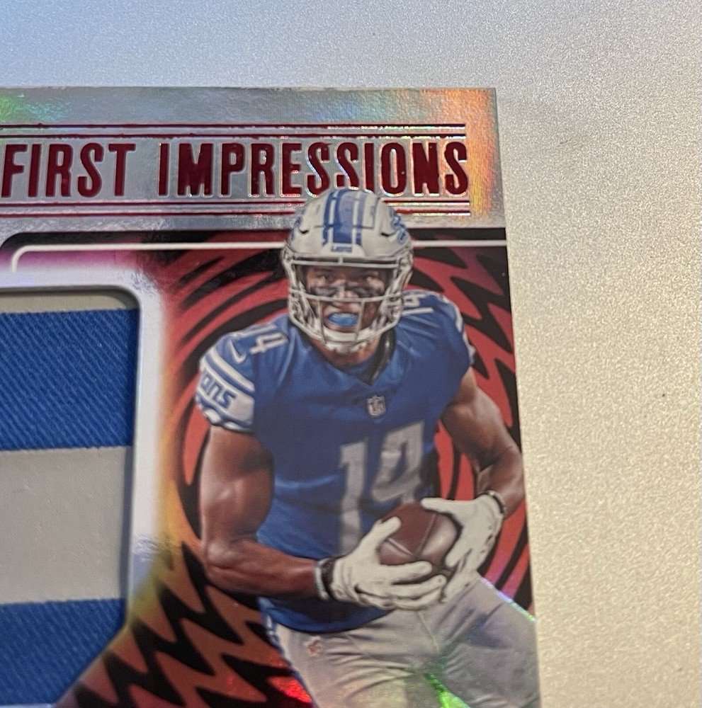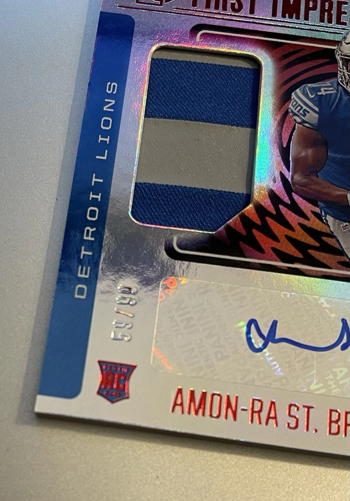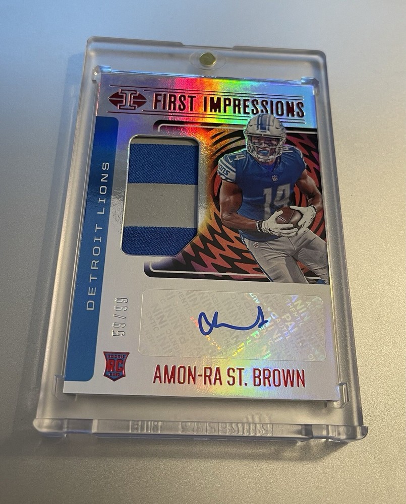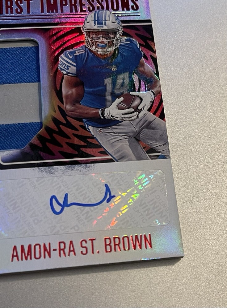 Elevate your collection with the Amon-Ra St. Brown 2021 Panini Illusions First Impressions Autographed Card, limited to just 99 copies. This exclusive rookie card captures the burgeoning career of the All-Pro standout. Crafted by renowned manufacturer Panini, this card is a must-have from the 2021 Illusions set, showcasing the talent and potential of Amon-Ra St. Brown. Whether you're a dedicated Detroit Lions fan or a passionate collector of sports memorabilia, this card is a perfect addition to any collection.