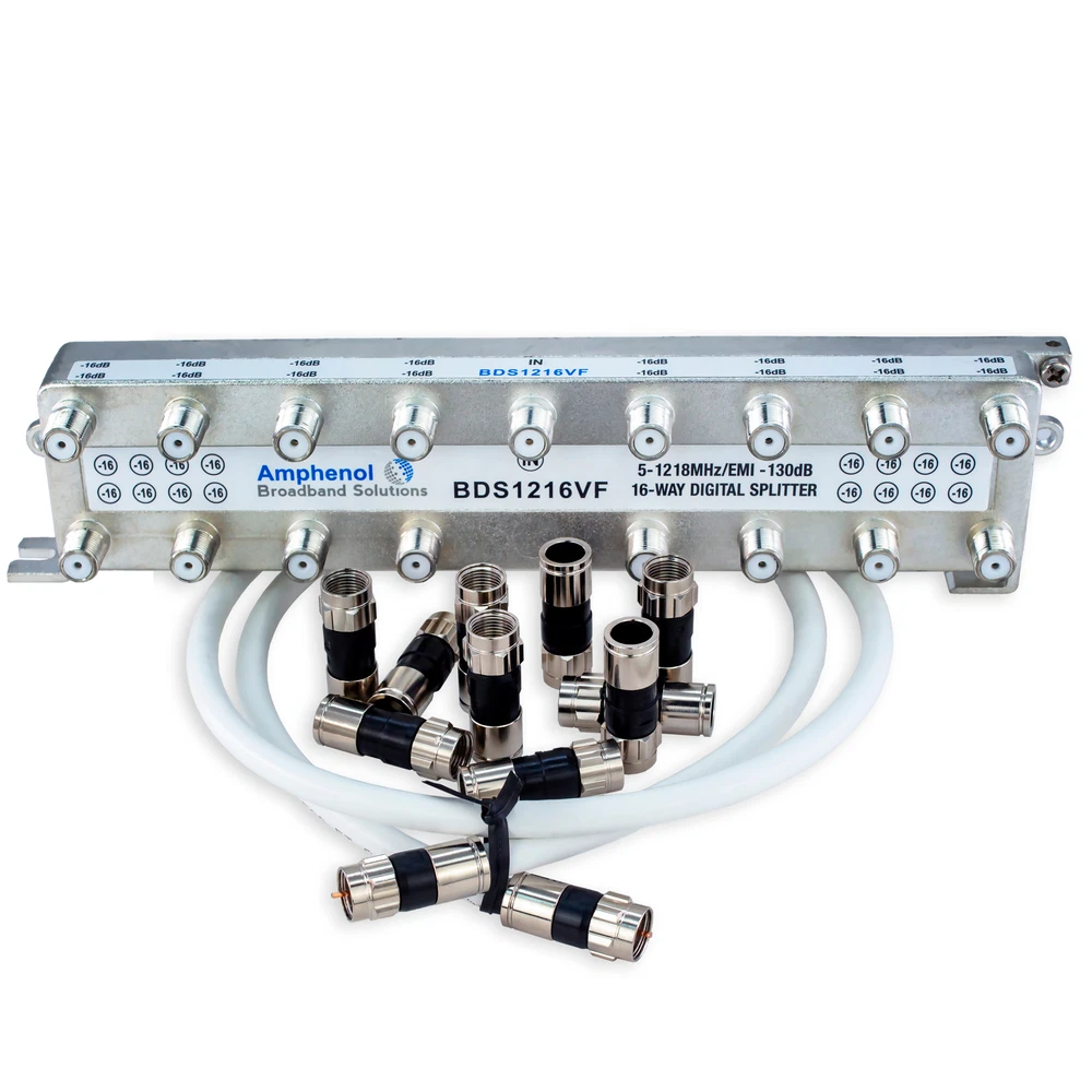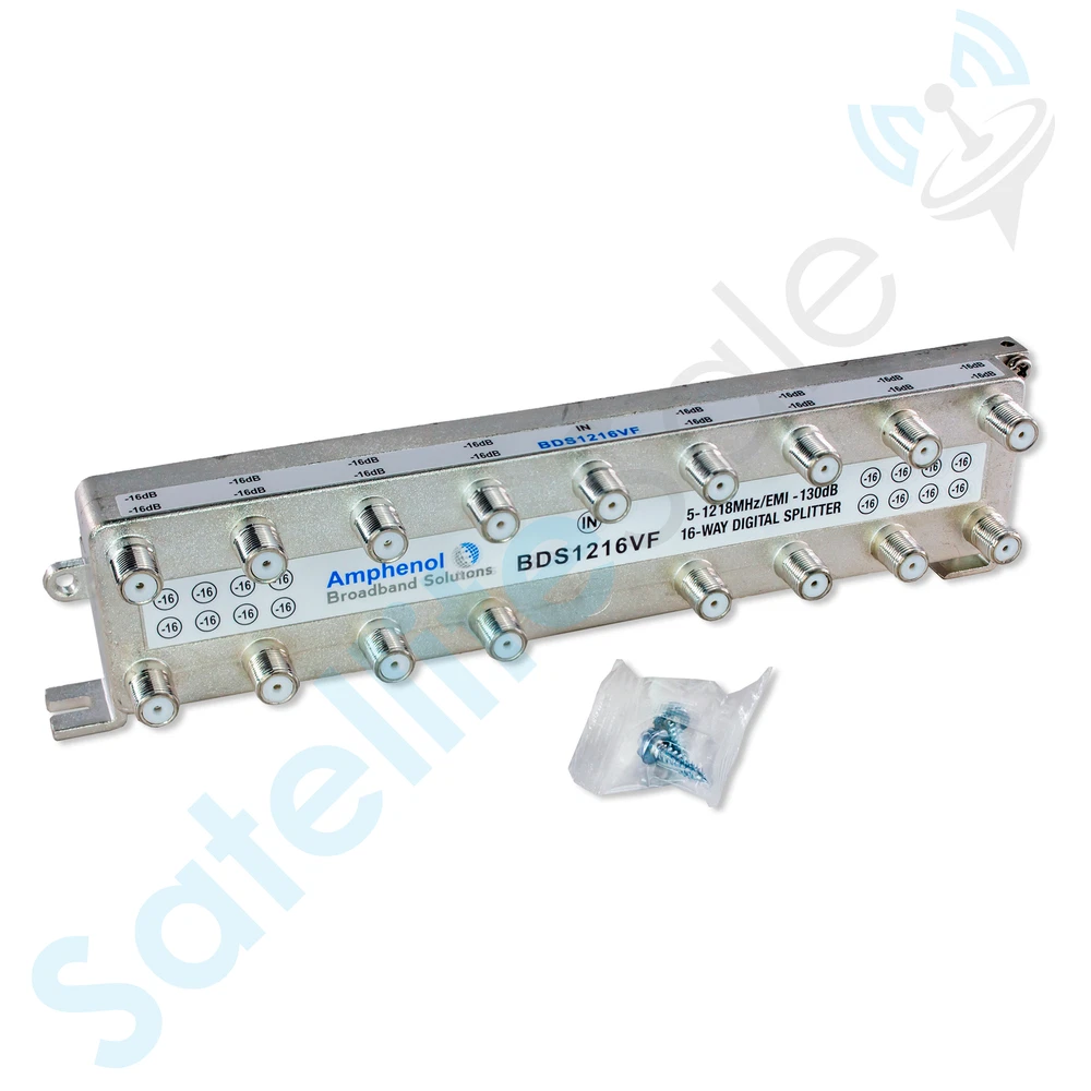 Trusted source for all technician's needs ≡ Audio&Video HDMI Optical RCA Coaxial Cables&Connectors Coax Cables Coax Connectors Splitters and Amplifiers Remote Controls Installation Accessories Satellite Equipment Adhesives Amphenol Digital High-Performance 16-Way Coaxial Splitter BDS1216FV Kit (5-1218 Mhz / EMI -130dB) by SatelliteSale About this item Amphenol Digital High-Performance 16-Way Coaxial Splitter is designed to meet the highest technical performance in the broadband industry. This splitter is designed to replace your old 16-Way Extreme HD BDS116H splitter. Zinc housing and fully soldered back ensure the best electrical performance in various splitter types and outputs. In addition, precisely engineered electrical components and materials guarantee peak performance in every condition, location, and environment. Deliver HD audio/video and data signals over existing coaxial cables. This digital coax splitter is designed for HDTV signals, High-Speed Internet Modems, Cable TV, Amplified Antennas, Amplifiers, and other coaxial devices. Compatible with AT&T, Charter Communications, Comcast, Verizon, Cox Communications, Altice USA, Frontier Communications, Cablevision, and Cable One equipment. Amphenol Broadband bought Extreme Broadband in Q3 2014 year and slowly going through re-branding all Extreme Broadband products. Amphenol BDS1216FV 16-Way splitter is a direct replacement for the 16-Way Extreme HD BDS116H splitter. Kit by SatelliteSale includes High-Performance Amphenol 16-Way Coaxial Splitter, SatelliteSale Coaxial White Indoor Cable (3 feet), and RG-6 Coaxial Indoor Connectors (Pack of 10 pcs). Product Description Amphenol Digital High-Performance 16-Way Coaxial Splitter meets the highest technical performance in the broadband industry. Replace your old 16-Way Extreme HD BDS116H splitter. Zinc housing and fully soldered back ensure the best electrical performance in various splitter types and outputs. Its design provides fast and easy installation. In addition, precisely engineered electrical components and materials guarantee peak performance in every condition, location, and environment. It allows optimal connectivity, corrosion resistance, and compatibility with your coaxial cables. Deliver HD audio/video and data signals over existing coaxial cables. This digital coax splitter is designed for HDTV signals, High-Speed Internet Modems, Cable TV, Amplified Antennas, Amplifiers, and other coaxial devices. Compatible with AT&T, Charter Communications, Comcast, Verizon, Cox Communications, Altice USA, Frontier Communications, Cablevision, and Cable One equipment. Amphenol Broadband bought Extreme Broadband in Q3 2014 year and slowly going through re-branding all Extreme Broadband products. Amphenol BDS1216FV 16-Way splitter is a direct replacement for the 16-Way Extreme HD BDS116H splitter. Kit by SatelliteSale comes pre-packed with SatelliteSale Coaxial White Indoor Cable (3 feet) and RG-6 Coaxial Indoor Connectors (Pack of 10 pcs). What is in the box: 16-Way Splitter Coaxial White Indoor Cable (3 feet) RG-6 Coaxial Indoor Connectors (Pack of 10 pcs). Free Shipping We offer FREE Shipping on all orders above in the United States via United States Postal Service. We also provide "expedited" and "next day delivery". USA-Based Distributor SatelliteSale is a homegrown company, with satisfied customers all over the world. We love our customers and appreciate hearing how we can improve your experience. Same Day Handling Orders placed before 4:00 PM Eastern Time (Monday-Saturday) will be shipped out the same business day, all other orders will be shipped the next business day. Unbeatable lifetime warranty SatelliteSale assures the lifetime service of our product to maintain the satisfaction of our clients. Customer-oriented company Friendly and caring SatelliteSale Customer Support is here to solve any of your issues and concerns in a timely manner. Trouble-free returns 30-day window for hassle-free item replacements and returns.