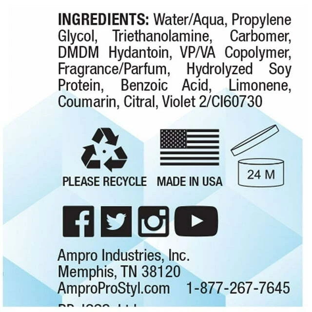 Product Description Ampro Clear Ice Ultra Hold Styling Gel for Resistant Hair Textures 8.8oz (4 Pack) Clear Ice Ultra Hold Protein Styling Gel is a vegan, alcohol-free styling gel designed to provide ultra-hold for even the most resistant hair textures. The updated formula is creamy smooth, making it easy to distribute through hair and perfect for layering. With soy protein that bonds with hair’s natural amino acids, this gel may help strengthen hair, encourage growth, and reduce breakage. Additionally, special emollients help protect hair during thermal styling. This unisex product is suitable for both women and men. Ultra-hold styling gel gives the extra control needed for the most resistant hair textures. Protein rich formula provides thermal protection and helps strengthens hair Non-flaking styling gel adds a non-greasy, healthy-looking shine to all hair textures and hair colors. Vegan formula is alcohol and paraben free Clear Ice Ultra Hold Gel is ideal for men and women with textured hair who need extra control Alcohol-free formula that adds beautiful shine. Great for sculpted hair styles. Moisturizing Unisex Ingredients Aqua, Propylene Glycol, Triethanolamine, Carbomer, DMDM Hydantoin, VP/VA Copolymer, Fragrance, Hydrolyzed Soy Protein, Benzoic Acid, Limonene, Coumarin, Citral, Violet 2/CI60730