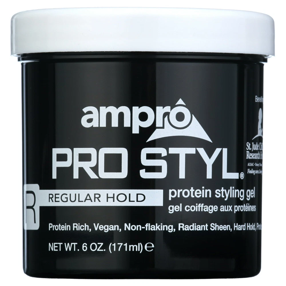 Product Description Ampro Pro Styl Regular Hold Protein Hair Styling Moisturizing Gel, Unisex, 6oz (24 Pack) Ampro Pro Styl Regular Hold Protein Unisex Styling Gel - because you want a styling gel that gives you the perfect look the first time, every time! Our legendary vegan, alcohol-free styling gel is uniquely formulated to provide the hard, firm hold you need to achieve the styles you desire. This gel is designed for sculpting and molding hair styles and for protective hair styles with resistant hair textures. SAY GOODBYE TO FLYAWAYS. With this wonder-working gel, you can define your natural hair and tame lose strands with a firm, non-greasy hold, while also giving your hair a fresher, healthier shine. PROTEIN RICH FORMULA. Strengthen your hair with this protein-enriched gel, to boost your hair's resilience and leave it looking and feeling healthy. It protects your hair during styling and is great for natural hair and textured styles. GOODBYE FLAKES AND GREASE. Enjoy soft, manageable waves and curls by using this non-greasy gel. The moisturizing formula is non-flaking and distributes easily throughout your hair, to help create any hairstyle on any hair texture. A LEGACY PRODUCT LINE. Ampro, which stands for American Products, is a leading beauty manufacturer, established since 1947. We produce top-quality personal care products for hair, body, and skin, free of alcohol, parabens, sulfates, and dyes. MULTICULTURAL HAIR CARE PRODUCTS. Ampro is continuously expanding its hair care line by adding exciting new products, like our Shine 'n Jam Magic Fingers, the Ampro Pro Styl Olive Oil Styling Gel, and our newest kid's line, Ampro's Beautiful Child. Ingredients Water/Aqua, Carbomer, Sodium Hydroxide, Caramel, Propylene Glycol, DMDM Hydantoin, Fragrance/Parfum, Hydrolyzed Soy Protein, Benzoic Acid, Limonene, Iodopropynyl Butylcarbamate, Coumarin, Citral, Linalool, Citronellol