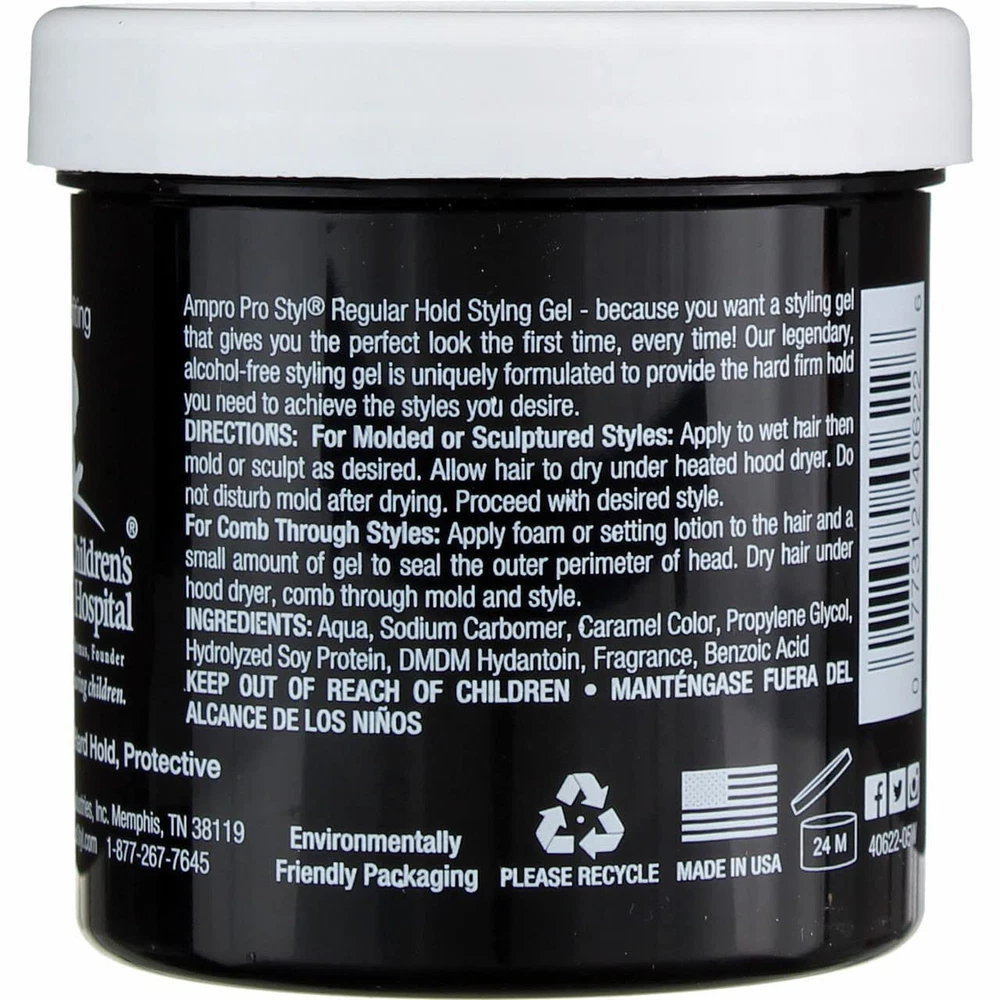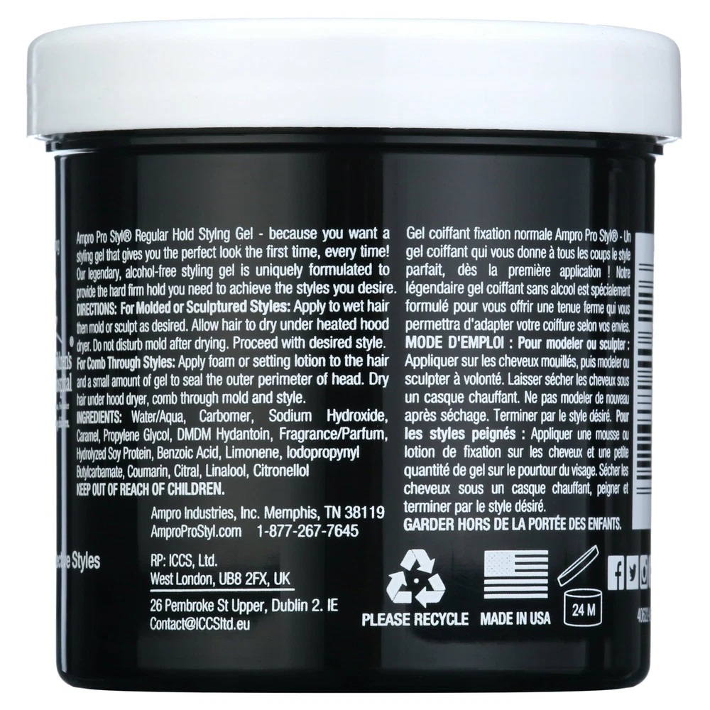 Product Description Ampro Pro Styl Regular Hold Protein Hair Styling Moisturizing Gel, Unisex, 6oz (3 Pack) Ampro Pro Styl Regular Hold Protein Unisex Styling Gel - because you want a styling gel that gives you the perfect look the first time, every time! Our legendary vegan, alcohol-free styling gel is uniquely formulated to provide the hard, firm hold you need to achieve the styles you desire. This gel is designed for sculpting and molding hair styles and for protective hair styles with resistant hair textures. SAY GOODBYE TO FLYAWAYS. With this wonder-working gel, you can define your natural hair and tame lose strands with a firm, non-greasy hold, while also giving your hair a fresher, healthier shine. PROTEIN RICH FORMULA. Strengthen your hair with this protein-enriched gel, to boost your hair's resilience and leave it looking and feeling healthy. It protects your hair during styling and is great for natural hair and textured styles. GOODBYE FLAKES AND GREASE. Enjoy soft, manageable waves and curls by using this non-greasy gel. The moisturizing formula is non-flaking and distributes easily throughout your hair, to help create any hairstyle on any hair texture. A LEGACY PRODUCT LINE. Ampro, which stands for American Products, is a leading beauty manufacturer, established since 1947. We produce top-quality personal care products for hair, body, and skin, free of alcohol, parabens, sulfates, and dyes. MULTICULTURAL HAIR CARE PRODUCTS. Ampro is continuously expanding its hair care line by adding exciting new products, like our Shine 'n Jam Magic Fingers, the Ampro Pro Styl Olive Oil Styling Gel, and our newest kid's line, Ampro's Beautiful Child. Ingredients Water/Aqua, Carbomer, Sodium Hydroxide, Caramel, Propylene Glycol, DMDM Hydantoin, Fragrance/Parfum, Hydrolyzed Soy Protein, Benzoic Acid, Limonene, Iodopropynyl Butylcarbamate, Coumarin, Citral, Linalool, Citronellol
