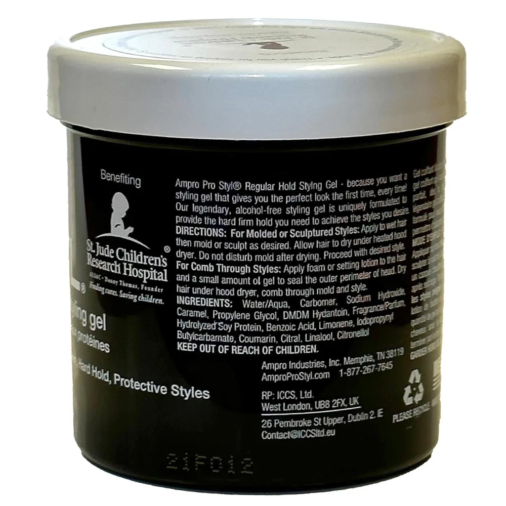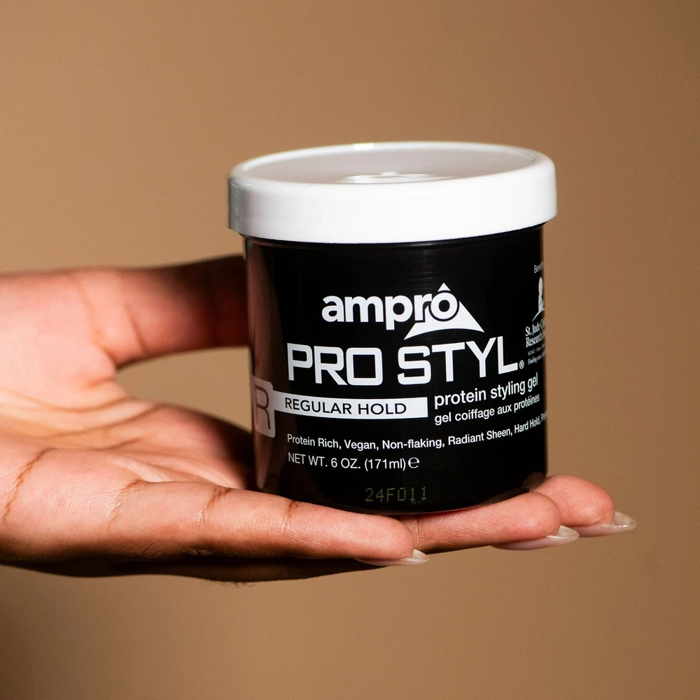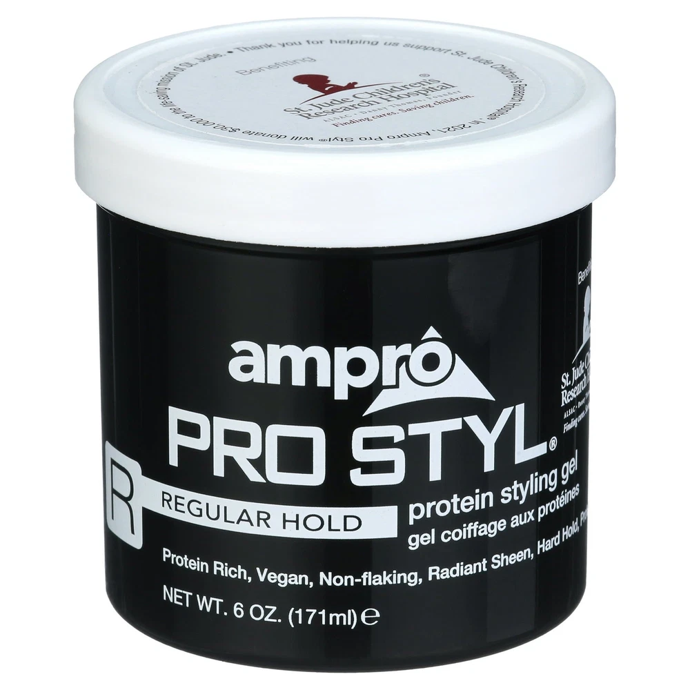 Product Description Ampro Pro Styl Regular Hold Protein Hair Styling Moisturizing Gel, Unisex, 6oz (4 Pack) Ampro Pro Styl Regular Hold Protein Unisex Styling Gel - because you want a styling gel that gives you the perfect look the first time, every time! Our legendary vegan, alcohol-free styling gel is uniquely formulated to provide the hard, firm hold you need to achieve the styles you desire. This gel is designed for sculpting and molding hair styles and for protective hair styles with resistant hair textures. SAY GOODBYE TO FLYAWAYS. With this wonder-working gel, you can define your natural hair and tame lose strands with a firm, non-greasy hold, while also giving your hair a fresher, healthier shine. PROTEIN RICH FORMULA. Strengthen your hair with this protein-enriched gel, to boost your hair's resilience and leave it looking and feeling healthy. It protects your hair during styling and is great for natural hair and textured styles. GOODBYE FLAKES AND GREASE. Enjoy soft, manageable waves and curls by using this non-greasy gel. The moisturizing formula is non-flaking and distributes easily throughout your hair, to help create any hairstyle on any hair texture. A LEGACY PRODUCT LINE. Ampro, which stands for American Products, is a leading beauty manufacturer, established since 1947. We produce top-quality personal care products for hair, body, and skin, free of alcohol, parabens, sulfates, and dyes. MULTICULTURAL HAIR CARE PRODUCTS. Ampro is continuously expanding its hair care line by adding exciting new products, like our Shine 'n Jam Magic Fingers, the Ampro Pro Styl Olive Oil Styling Gel, and our newest kid's line, Ampro's Beautiful Child. Ingredients Water/Aqua, Carbomer, Sodium Hydroxide, Caramel, Propylene Glycol, DMDM Hydantoin, Fragrance/Parfum, Hydrolyzed Soy Protein, Benzoic Acid, Limonene, Iodopropynyl Butylcarbamate, Coumarin, Citral, Linalool, Citronellol