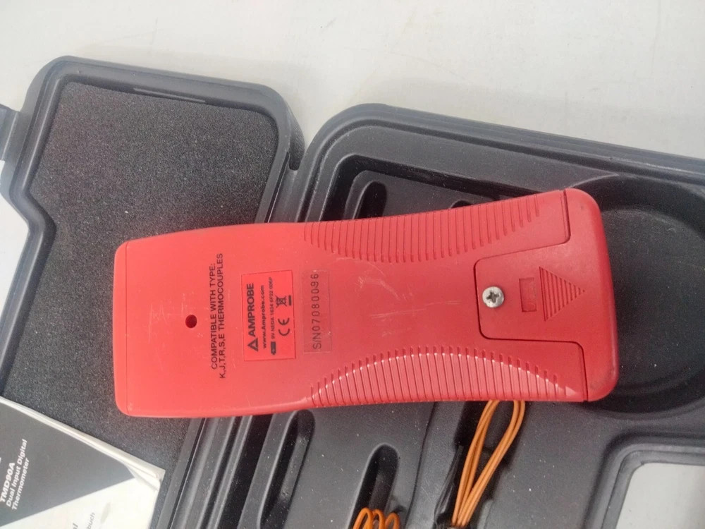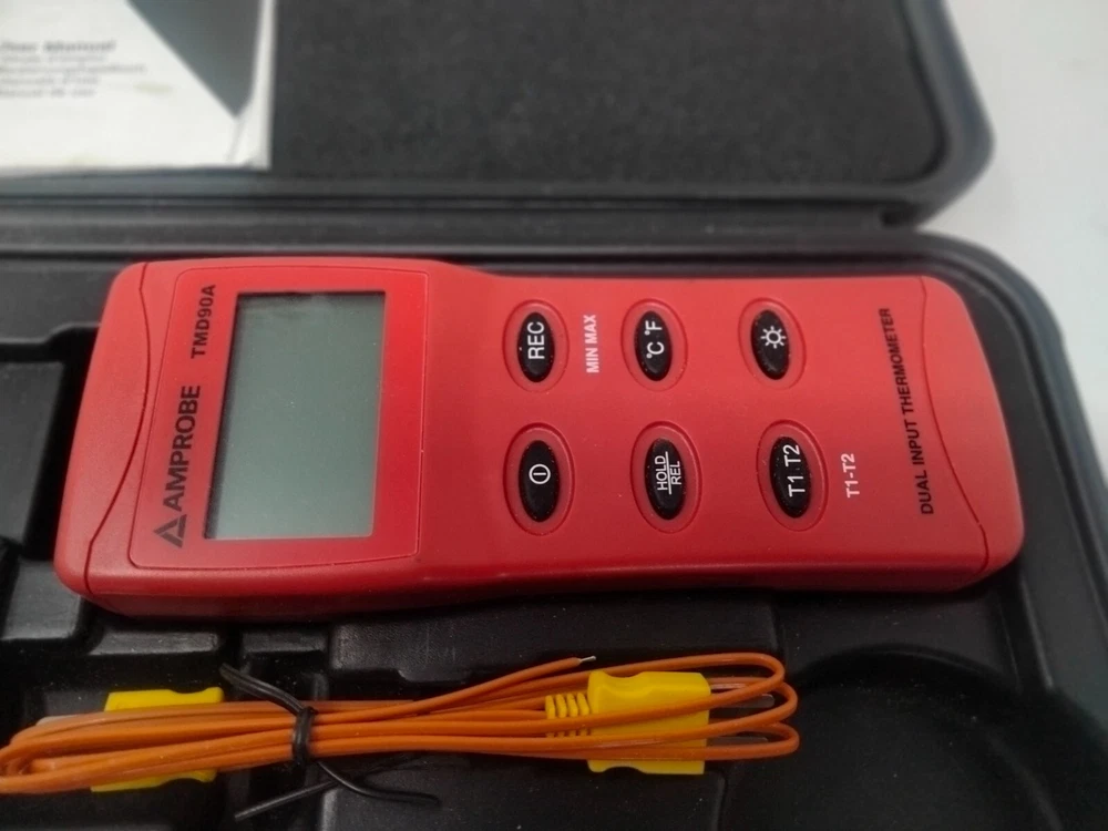 Amprobe TMD90A Thermocouple Dual Input Thermometer Indicator Calibrator Meter Description: This listing is for a Amprobe Model TMD90A Thermocouple Dual Input Thermometer. The unit has been tested with a 9-volt battery and powers on, I cycled through the buttons and they appear to function, but I haven't the equipment to properly test all functions. The unit includes wires with probes, and an instruction manual. The unit has small blemishes from handling, the instruction manual cover has a few stains. The 9-volt device battery box is very clean (battery is not included). The unit comes in an ABS-style plastic case, which shows shelf wear, but the latches close firmly. Please see images for more detail. PLEASE ASK ANY QUESTIONS YOU MAY HAVE FOR THIS ITEM! PLEASE CHECK OUT MY OTHER LISTINGS ON EBAY, I AM ALWAYS ADDING NEW ITEMS! THANK YOU FOR YOUR INTEREST!
