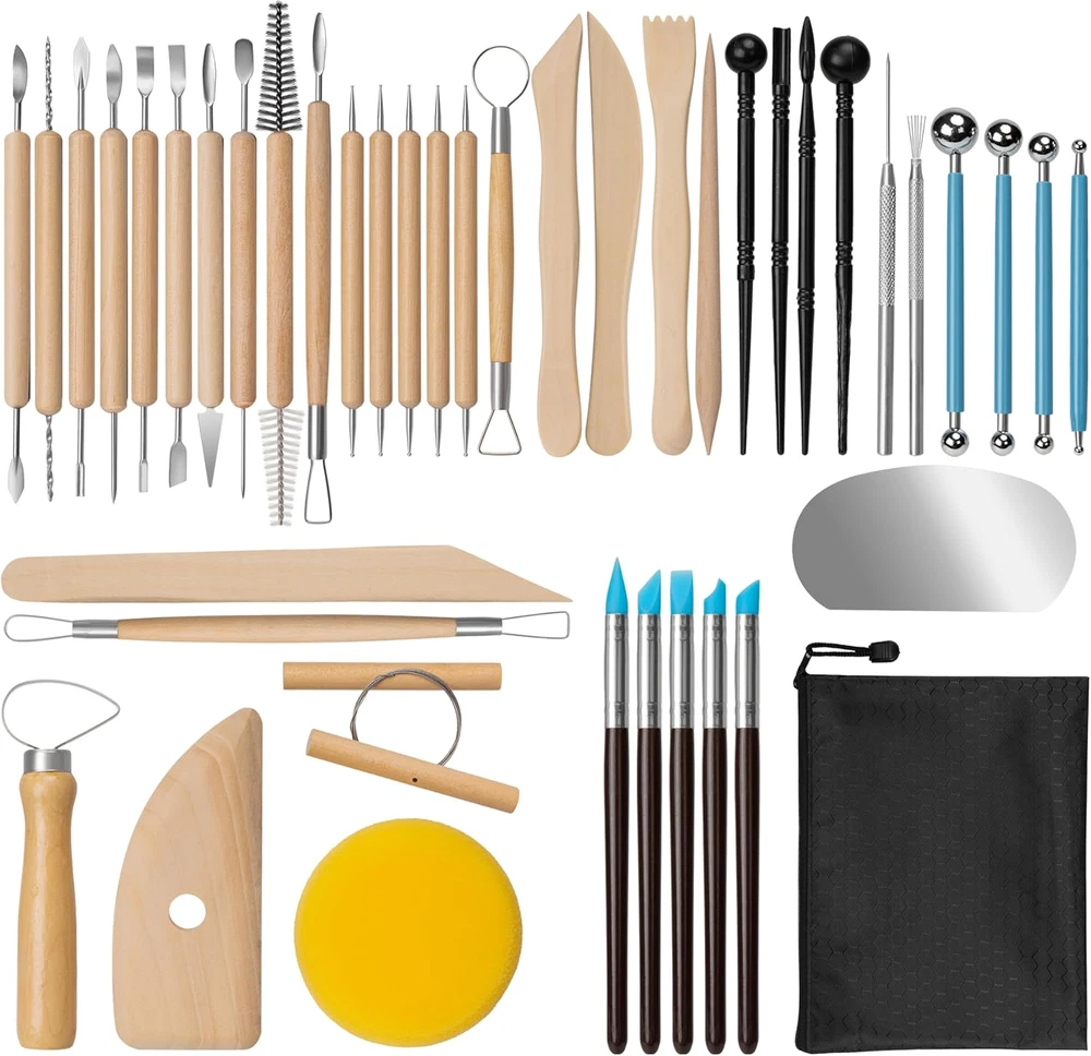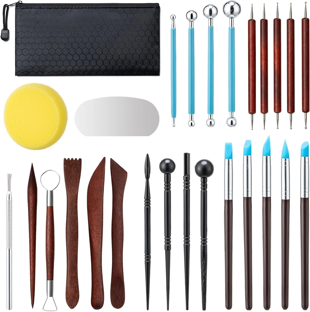 LIGHT PRACTICAL: These clay carving tools are made of good quality wood, stainless steel, plastic and other materials, simple and sturdy, not easy to be damaged or fall off; the handle of the tool pen is smooth and comfortable to hold UNIQUE DESIGN: Each tool in the clay tools sculpting kit has its own unique design, which can be engraving, molded into shapes, textures, poke holes and other details to help your creative realization and accompany the birth of your art MULTI FUNCTIONAL: 31 PCS polymer clay set have a wide range of basic tools for making beautiful pottery and clay activities, meet your needs, you can shape ceramics, clay figures, dot paintings, and even gingerbread men for baking MULTI SCENARIOS: Light weight and useful clay dotting tools kit can be used in school art classes, DIY handmade shops, family pottery activity, Parenting activity, accompanying you to spend a happy creative time 31 PCS CLAY SET: 18 red wood clay tools, 5 red clay sculpting tools, 2 plastic eraser stylus, 2 metals needle tool, 1 red wooden handle ball stylus, 1 red hole punch, 1 pottery sponge, packed in a zipper storage bag, easy to carry and store EXCELLENT TOOLS PRODUCT: The ceramic tools set is suitable for both newcomer, master pottery or clay lovers, it is a good choice to developing inventiveness, imagination and hands-on ability, it is a warm product Product Description Amrules clay tool set is made of durability materials. The set comes with a full range of tools so you can create your own creations as you wish, a good choice for clay enthusiasts, and a great product. The clay tool set is a great helper when it comes to ceramics projects, Whether you're just starting out or a seasoned ceramist, you deserve a good set of tools. There are several different ceramic tool pens in the set, which can press out the desired pattern for you. The irregular nibs can be engraved with different patterns to make the artwork more beautiful. The wooden clay tools can shape the ceramic. The metal ribs make the outside more slippery. The ceramic sponge can soak up the excess water in the clay, and there are also a variety of tools with multiple functions for you to use.