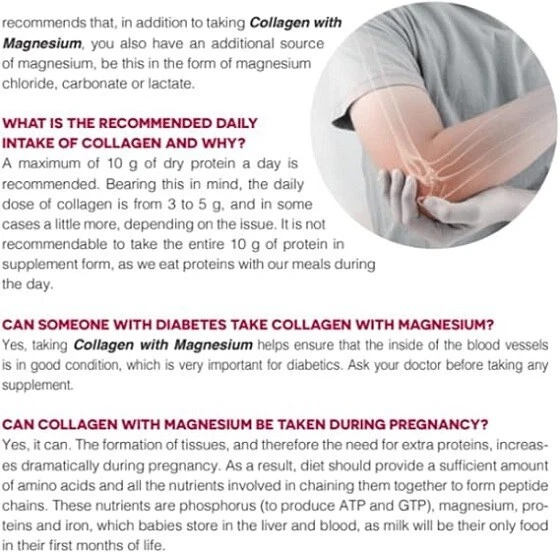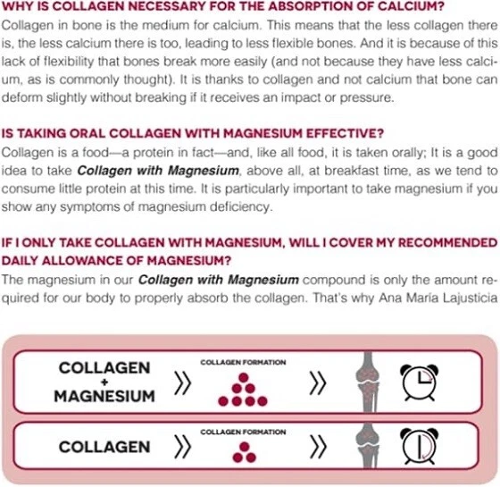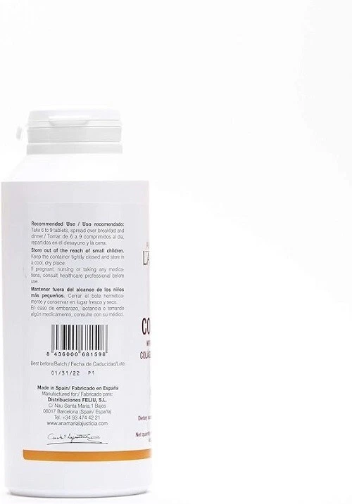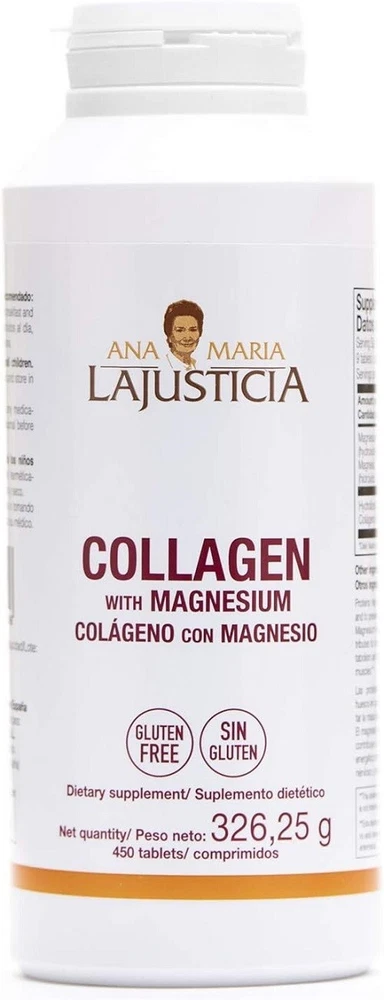 Ana Maria LaJusticia Collagen with Magnesium - 450 Tabs - Rejuvenate Your Skin - Strengthen Your Nervous System - Keep Bones and Teeth in Good Condition Brand Ana María Lajusticia Flavor Unflavored Primary Supplement Type Magnesium Unit Count 450 Count Item Form Tablet About this item BENEFITS-- Magnesium is essential for collagen creation, making this product the perfect natural supplement you need. IMPROVES skin elasticity, hair growth and helps gain and mantain muscle mass. Reduces tiredness and fatigue. EASY TO USE -- Take 6 to 9 tablets per day, spread throughout breakfast and dinner. It is recommended to take the tablets with food with Vitamin C. Ana María Lajusticia is a European Brand leader in it's sector, worldwide recognized. The company was found in 1980 and has helped thousands of people to find their better selves and live the healthy balanced lifes they wanted. This product is KETO friendly and Gluten Free. Recommended for the regeneration of any tissue, such as in cases of ligament rupture, muscle overload and for the maintenance of tendons, ligaments, bones and muscles under normal conditions . Also effective, hair loss and brittle nails. Product Description Collagen is the most abundant protein in the human body, being the essential constituent of cartilage, tendons, bones (90%) and skin (70%). Proteins contribute to the maintenance of bones in conditions normal, and to preserve and increase muscle mass. Magnesium helps reduce tiredness and fatigue and contributes to the synthesis of normal protein and bone maintenance under normal conditions. Vitamin C improves the absorption of iron and contributes to the normal formation of collagen for the normal functioning of blood vessels, bones and cartilages. 100% Genuine Product Free Shipping