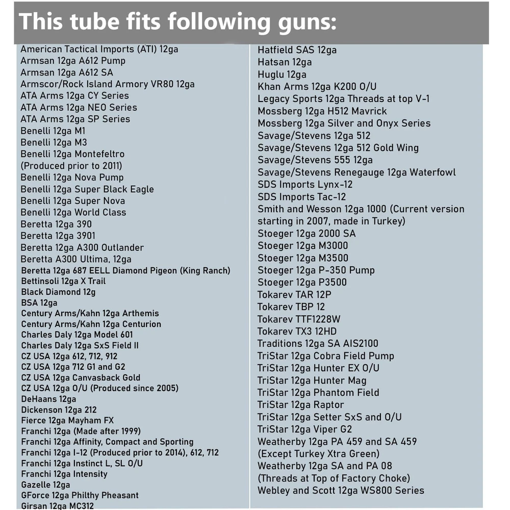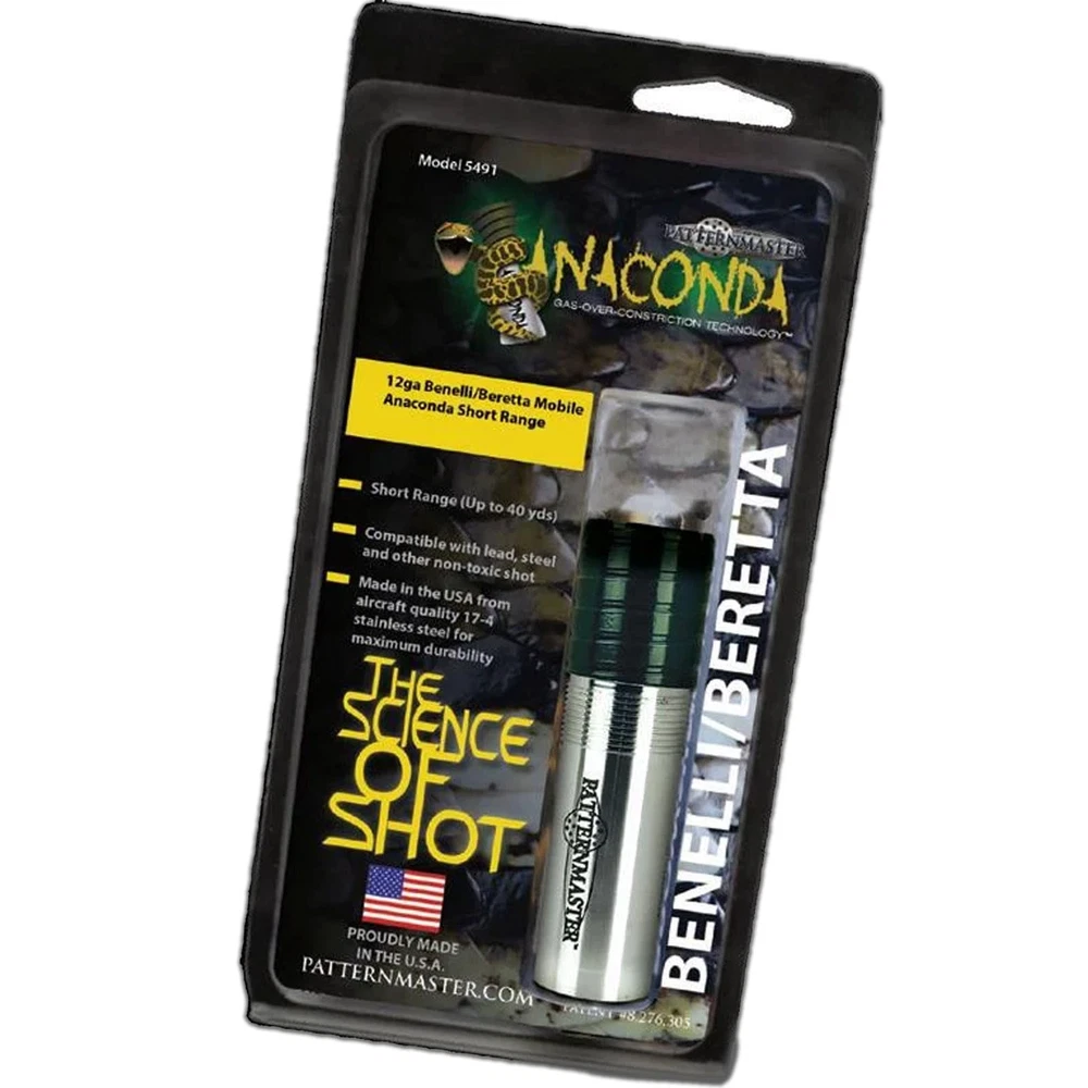 ANACONDA SERIES - The Anaconda Gas-Over-Constriction Series features our Coil Zone technology, which forces gases into channels and creates a stranglehold around the shot-wad; This feature, together with left-twisting coils, ensures the tube stays secure SHORT RANGE - The Anaconda Short Range choke tube by (0.730) provides affordable versatility with "Coil Zone" gas over constriction technology; At the same time, SecureFit threading provides tight fitting with zero pressure loss for effective shots PERFORMANCE & COMPATIBILITY - Giving it an effective range of up to 40 Yards, The Anaconda Short Range was designed to produce an Improved Cylinder pattern while shortening the shot string; This Choke Tube gun compatibility is described in the picture CONSTRUCTION - This Anaconda tube is made from aircraft quality 17-4ph stainless steel and powder coated with a field-grade olive drab green enamel, that is Military-Spec, Resistant Coating (CARC) for a lifetime of durability HIGH-EFFECTIVE SHOTS - Counter-spin between the load and coils applies resistance to the wad, forcing a tighter pattern when the load exists in the barrel; For best results, Ballistic Performance, LLC, recommends ammunition velocities below 1550fps