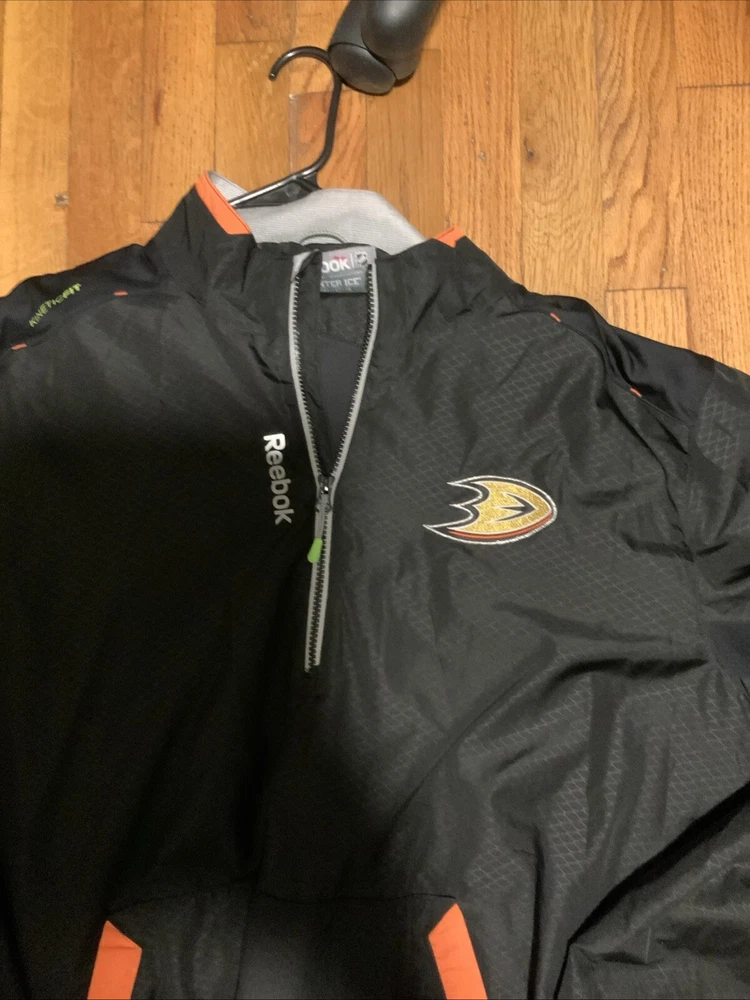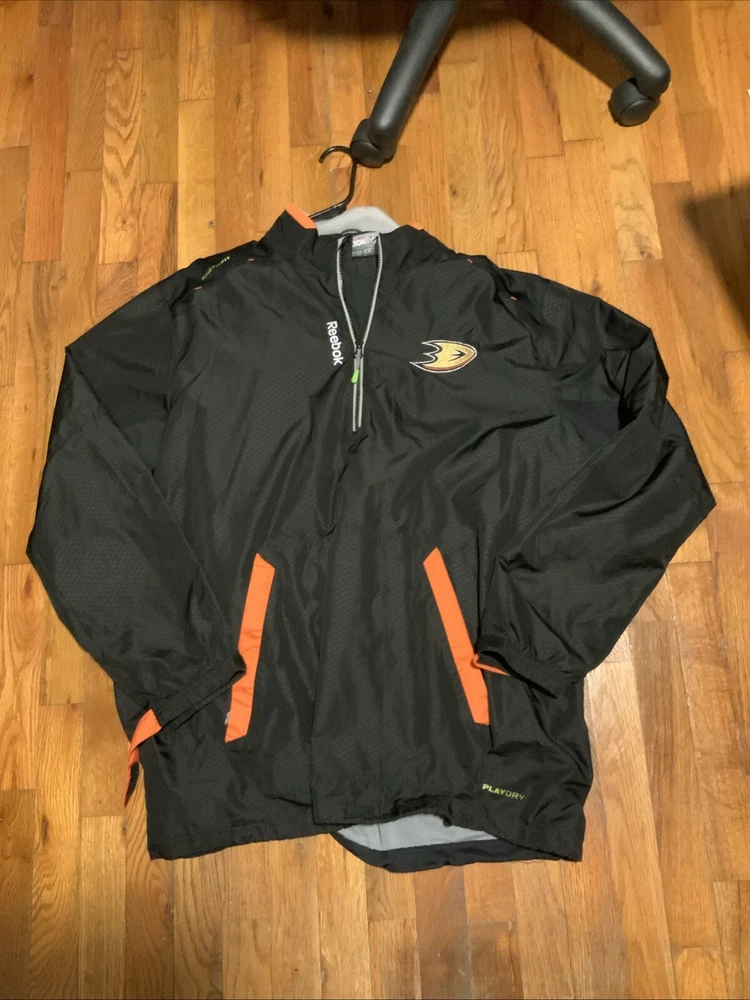 Get ready to cheer on your favorite NHL team with this Reebok Center Ice Windbreaker Jacket and Pants set in size 2XL. This officially licensed set is perfect for any fan of the Anaheim Ducks, and features the team's colors and logo prominently displayed on both pieces. The jacket and pants are made from high-quality materials, ensuring that you stay warm and comfortable while watching the game. Whether you're at the arena or just out and about, this set is sure to show your team spirit.