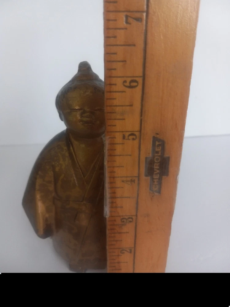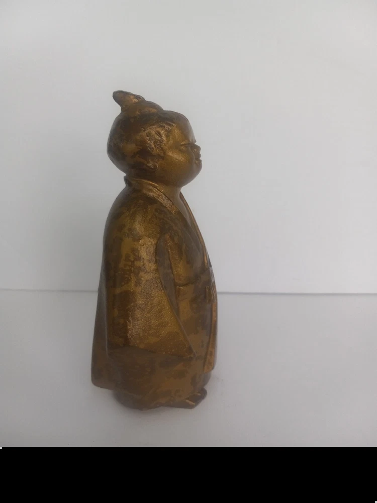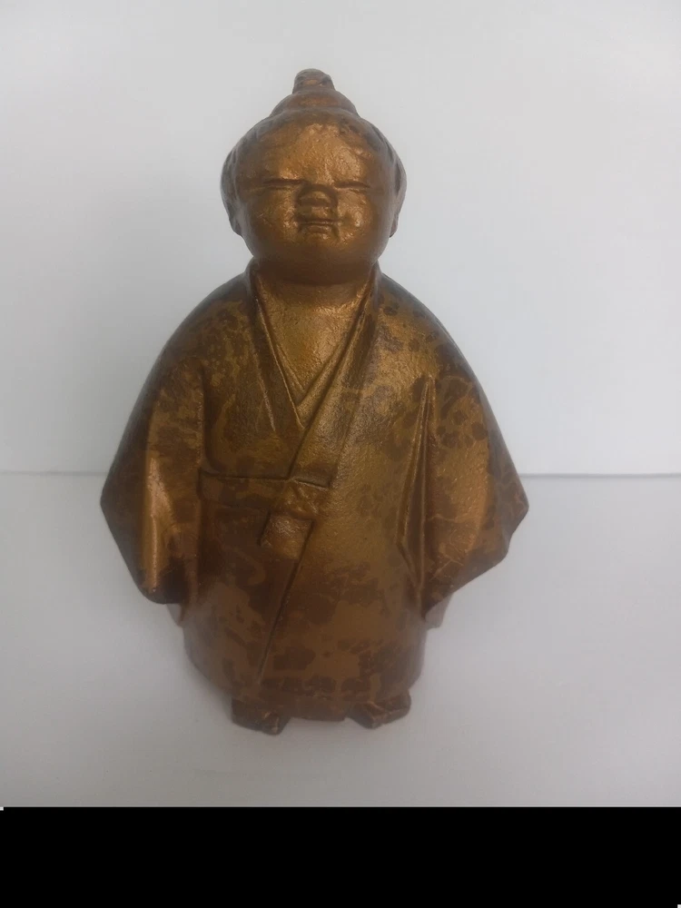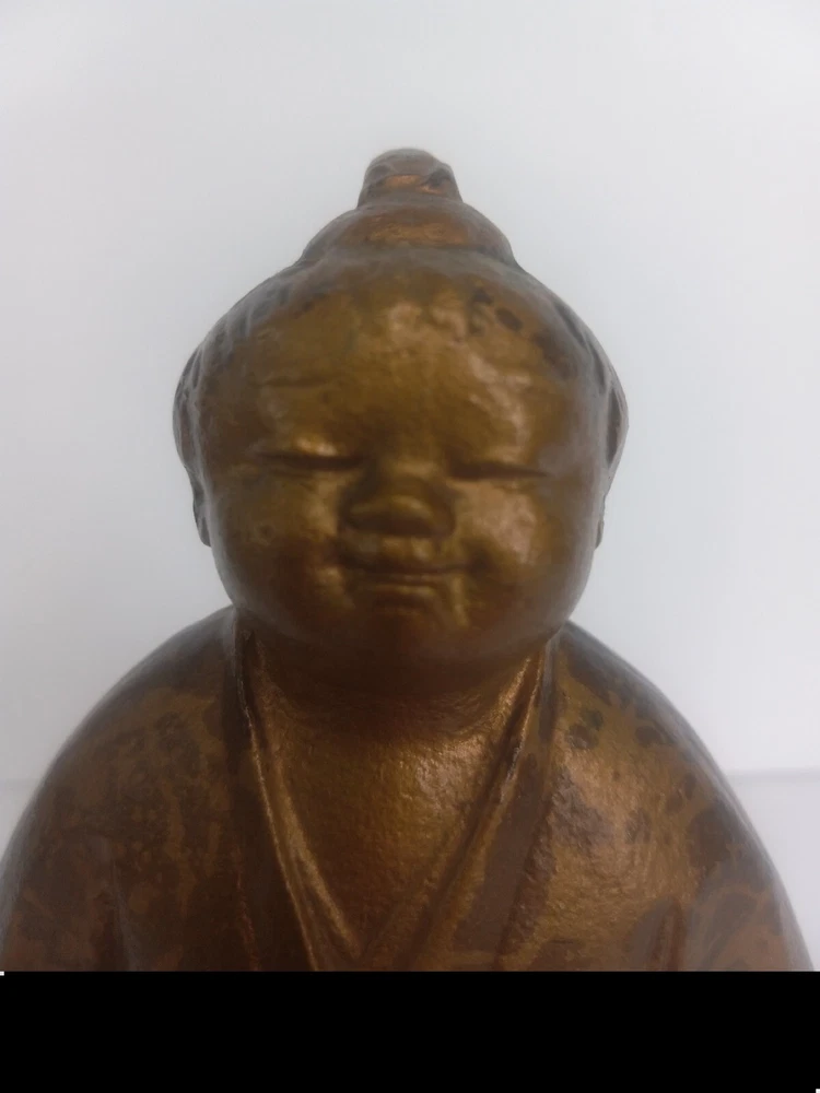 Anatta Buddhist Boy Monk Cast Iron Figurine 6 in. tall, 3.5 in. wide Gold Colored Detailed Features. Weighs 1 lb. 8.7 oz. There is some residual tag/adhesive on the bottom of the figure. E6