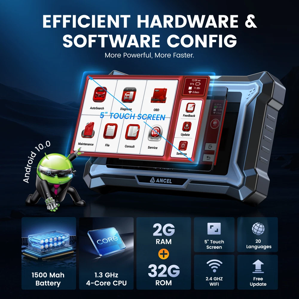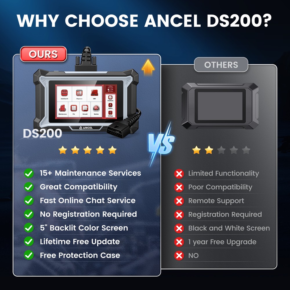 ANCEL DS200 All-in-One Functions in Your Hand 1. 7*24hr Online Chat Customer Service 2. Support Full systems basic function system (read code, clear code, read data stream); 3. support 15 maintenance functions -- Oil (maintenance light zeroing), EPB (brake pad replacement), SAS (steering angle learning), ETS (throttle learning)), battery reset, DPF function, ABS bleeding, airbag reset, headlight matching, start-stop setup, seat calibration and so on. 4. Support All OBDII function of 9 OBD modes of OBD2/EOBD protocol which is standardized 5. Battery voltage detection function (display battery voltage) 6. Free Update Online 7. 4-in-1 data flow display (graphical data flow display) 8. Diagnostic report can be sent to the customer by e-mail. 9. Support output PDF report to print 10. support intelligent vin diagnosis function (Autosearch) 11. support screen recording function 12. Support screenshot function 13. support diagnosis feedback 14. support language 19 countries: English, French, German, Italian, Spanish, Portuguese, Japanese, Russian, Dutch, Hungarian, Slovak, Greek, Arabic, Czech, Polish, Chinese traditional, Korean, Turkish, Danish) OE-Level Full System Scan & Diagnostic for Most OBDII/EOBD Vehicles This option allows you to detect whether the car full system parameters are normal or not. It mainly including Drive System, Chassis System, Body System, Electrical system. 1.PCM(Drive System): Engine, Transmission, Transfer case, Electrical Machine Electronics, Fuel Pump, Gear, and more... 2. Chassis System : Accumulator Management Electronics, Steering, Integrated Chassis Management, Tyre Pressure Control, Active Cruise Control, Braking System, Suspension, TPMS and more... 3. BCM(Body System): SRS Airbag, Camera, Audio Radio, Gateway, Cluster Dashboard, Rain Sensors, Charging Interface Module, Parking Assistance, Power Control Unit, Touch box, Light, Battery Charging System, Head up Display, Wipe Control System, Roof, Seat & Door Motor system, Immobilizer, ABS ESP system, Air Condition.Electric Windows, Telephone, and more... 4. Electrical System: Including Centralized control system for engine and power transmission, Chassis integrated control and safety system,Intelligent body electronic system,Communication and information / entertainment system. Read and erase codes for all available systems, turn off MIL light (Indicator light), display live data in text, graph & analog for easy data review. 15 + Maintenance Functions With 15 Maintanence Function : AdBlue Reset, Airbag Reset, A/F Reset, ABS Bleeding, Battery Matching, Gearbox Relearn, Brake Reset, DPF Regen, Electric Throttle Relearn, Injector Coding, NOx Sensor Reset, Oil Maintenance Reset, Steering Angle Reset, and TPMS (Reset) 1. Oil Maintenance Reset : reset the o.il service lamp after changing the engine o.i.l; re-calculate the optimal o.i.l life change interval for the engine o.i.l maintenance being on schedule. 2. ABS Bl-eeding: removes a ir from the ABS brake lines for firm braking and safety. 3. Adblue Reset: reset the AdBlue system after refilling the tank to ensure the engine is running properly and meeting standards. 4. A.irbag Reset: Resets a irbag system after replacement or fault repair. 5. A/F Reset: adjusts the ratio for optimal engine capability and effi.ciency. 6. BMS Matching : register the battery after replacement. 7. Gearbox Reset: help complete the gearbox self-learning to improve gear shifting quality. 8. EPB Brake Reset: help replace and reset the brake pad. 9. DPF Regeneration (**for both diesel and gasoline vehicles): keep the trap stable. 10. Throttle Adaptation: initialize the throttle actuators to the default state. 11. Injector Coding: write the new code into the car system for the correct cylinder injec-tion quantity. 12. SAS Reset: reset the steering angle to zero to keep the car running straight. 13. TPMS Reset: reset the tire pressure. 14. Gear Learning: resets the transmission for smoother shifting and optimal capability. 15. N.O.x Sen.sor Reset: Resets the ni.tro.gen o.xide sen.sor after replacement or repair. ALL 10 Mode OBDII/EOBD Functions: Mode 01-Request current powertrain diagnostic data. Mode 02-Request freeze frame information. Mode 03-Request emissions-related diagnostic code Mode 04-Clear/reset emissions-related diagnostic information. Mode 05-Request oxygen sensor monitoring test results. Mode 06-Request on-board monitoring test results for specific monitored systems. Mode 07-Request emission-related diagnostic troublecodes detected during current or last completed driving cycle Mode 08-Request control of on-board system, test or component. Mode 09-Request vehicle information. Mode 0A-Request emissions-related diagnostic troublecodes with permanent status after a clear/reset emission-related diagnostic information. 19 Language Supports English, French, German, Italian, Spanish, Portuguese, Japanese, Russian, Dutch, Hungarian, Slovak, Greek, Arabic, Czech, Polish, Chinese traditional, Korean, Turkish, Danish) Language Setting Once the DLC is connected, the device will automatically power on. For first-time use, the first step is to set the language. The default language of the device is English. If you want to change the language, please proceed to the next step and connect to Wi-Fi to download the latest diagnostic software for the selected language. More Features: OBD Fault Code Library: Use the OBD fault codes generated during the diagnostic process to query detailed fault descriptions. Coverage Lists: Quickly check the supported models and functions available on the current device. Learning: Access video tutorials that provide guidelines for equipment usage, maintenance, and diagnostics. Video: Watch instructional videos that demonstrate how to operate the device effectively. User Manual : Helps technicians quickly understand how to use the device and improve diagnostic capabilities efficiently . Feedback: This function allows you to provide feedback when encountering diagnosti