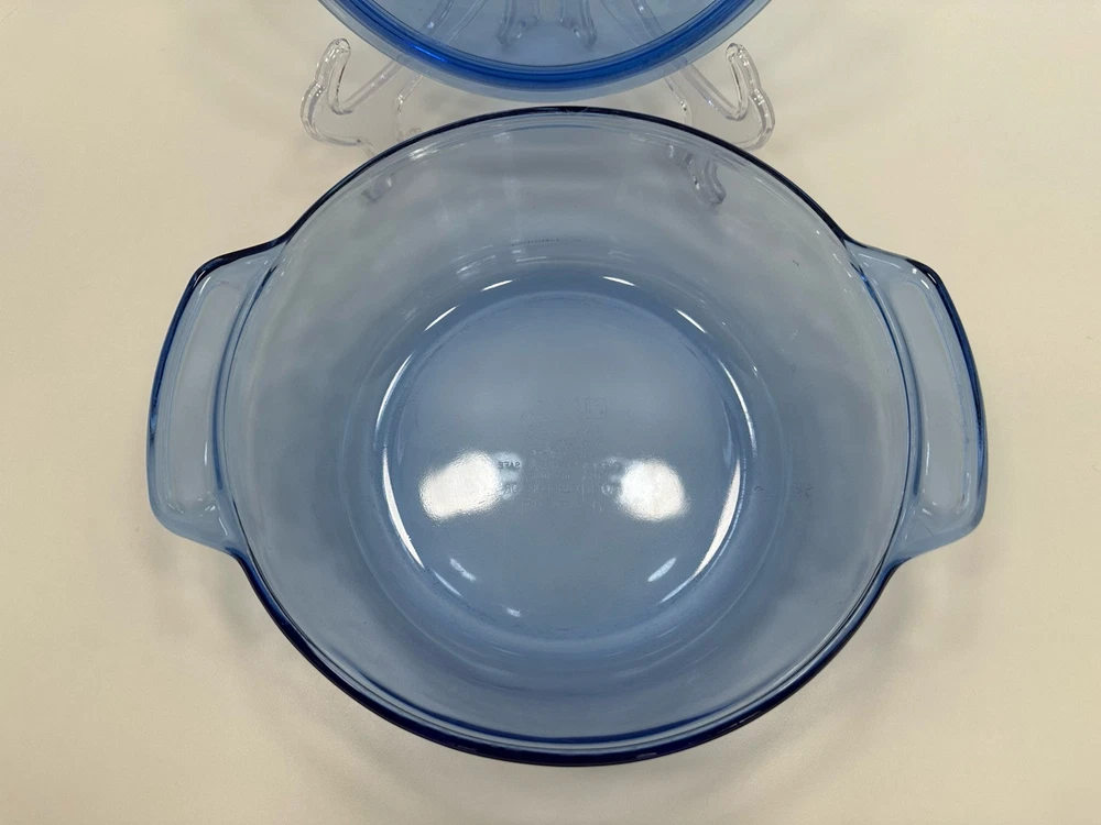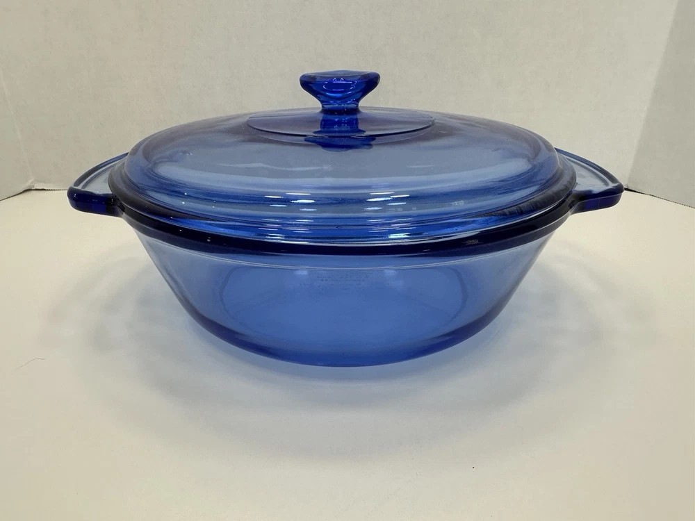 There is a chip or small flat piece that looks like a chip on the rim of the dish. Please see photos. Otherwise it is in good condition. The image shows a vintage Anchor Hocking cobalt blue glass casserole dish with a lid, likely from the mid-20th century. Here are some details: Brand: Anchor Hocking, known for durable and heat-resistant glassware. Material: Cobalt blue glass, oven and microwave-safe. Capacity: 2 quarts. Dimensions: Approximately 9 inches in diameter and 4.75 inches tall with the lid. Care: Dishwasher safe, avoid sudden temperature changes. Usage: Suitable for baking and serving casseroles or other dishes in a preheated oven up to 425°F (200°C). Condition: Vintage items may show minor wear, such as scratches